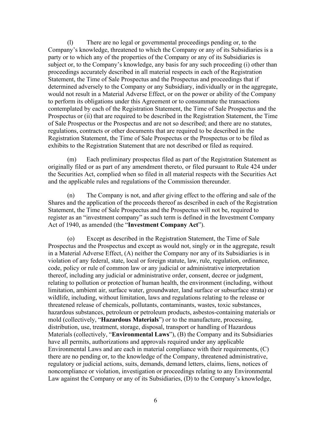 6 (l) There are no legal or governmental proceedings pending or, to the Company’s knowledge, threatened to which the Company or any of its Subsidiaries is a party or to which any of the properties of the Company or any of its Subsidiaries is subject or, to the Company’s knowledge, any basis for any such proceeding (i) other than proceedings accurately described in all material respects in each of the Registration Statement, the Time of Sale Prospectus and the Prospectus and proceedings that if determined adversely to the Company or any Subsidiary, individually or in the aggregate, would not result in a Material Adverse Effect, or on the power or ability of the Company to perform its obligations under this Agreement or to consummate the transactions contemplated by each of the Registration Statement, the Time of Sale Prospectus and the Prospectus or (ii) that are required to be described in the Registration Statement, the Time of Sale Prospectus or the Prospectus and are not so described; and there are no statutes, regulations, contracts or other documents that are required to be described in the Registration Statement, the Time of Sale Prospectus or the Prospectus or to be filed as exhibits to the Registration Statement that are not described or filed as required. (m) Each preliminary prospectus filed as part of the Registration Statement as originally filed or as part of any amendment thereto, or filed pursuant to Rule 424 under the Securities Act, complied when so filed in all material respects with the Securities Act and the applicable rules and regulations of the Commission thereunder. (n) The Company is not, and after giving effect to the offering and sale of the Shares and the application of the proceeds thereof as described in each of the Registration Statement, the Time of Sale Prospectus and the Prospectus will not be, required to register as an “investment company” as such term is defined in the Investment Company Act of 1940, as amended (the “Investment Company Act”). (o) Except as described in the Registration Statement, the Time of Sale Prospectus and the Prospectus and except as would not, singly or in the aggregate, result in a Material Adverse Effect, (A) neither the Company nor any of its Subsidiaries is in violation of any federal, state, local or foreign statute, law, rule, regulation, ordinance, code, policy or rule of common law or any judicial or administrative interpretation thereof, including any judicial or administrative order, consent, decree or judgment, relating to pollution or protection of human health, the environment (including, without limitation, ambient air, surface water, groundwater, land surface or subsurface strata) or wildlife, including, without limitation, laws and regulations relating to the release or threatened release of chemicals, pollutants, contaminants, wastes, toxic substances, hazardous substances, petroleum or petroleum products, asbestos-containing materials or mold (collectively, “Hazardous Materials”) or to the manufacture, processing, distribution, use, treatment, storage, disposal, transport or handling of Hazardous Materials (collectively, “Environmental Laws”), (B) the Company and its Subsidiaries have all permits, authorizations and approvals required under any applicable Environmental Laws and are each in material compliance with their requirements, (C) there are no pending or, to the knowledge of the Company, threatened administrative, regulatory or judicial actions, suits, demands, demand letters, claims, liens, notices of noncompliance or violation, investigation or proceedings relating to any Environmental Law against the Company or any of its Subsidiaries, (D) to the Company’s knowledge,
