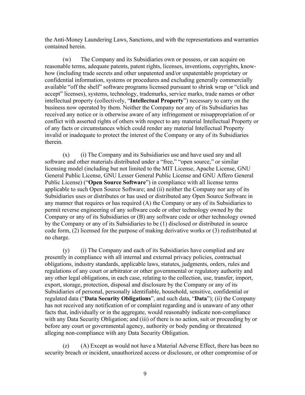 9 the Anti-Money Laundering Laws, Sanctions, and with the representations and warranties contained herein. (w) The Company and its Subsidiaries own or possess, or can acquire on reasonable terms, adequate patents, patent rights, licenses, inventions, copyrights, know- how (including trade secrets and other unpatented and/or unpatentable proprietary or confidential information, systems or procedures and excluding generally commercially available “off the shelf” software programs licensed pursuant to shrink wrap or “click and accept” licenses), systems, technology, trademarks, service marks, trade names or other intellectual property (collectively, “Intellectual Property”) necessary to carry on the business now operated by them. Neither the Company nor any of its Subsidiaries has received any notice or is otherwise aware of any infringement or misappropriation of or conflict with asserted rights of others with respect to any material Intellectual Property or of any facts or circumstances which could render any material Intellectual Property invalid or inadequate to protect the interest of the Company or any of its Subsidiaries therein. (x) (i) The Company and its Subsidiaries use and have used any and all software and other materials distributed under a “free,” “open source,” or similar licensing model (including but not limited to the MIT License, Apache License, GNU General Public License, GNU Lesser General Public License and GNU Affero General Public License) (“Open Source Software”) in compliance with all license terms applicable to such Open Source Software; and (ii) neither the Company nor any of its Subsidiaries uses or distributes or has used or distributed any Open Source Software in any manner that requires or has required (A) the Company or any of its Subsidiaries to permit reverse engineering of any software code or other technology owned by the Company or any of its Subsidiaries or (B) any software code or other technology owned by the Company or any of its Subsidiaries to be (1) disclosed or distributed in source code form, (2) licensed for the purpose of making derivative works or (3) redistributed at no charge. (y) (i) The Company and each of its Subsidiaries have complied and are presently in compliance with all internal and external privacy policies, contractual obligations, industry standards, applicable laws, statutes, judgments, orders, rules and regulations of any court or arbitrator or other governmental or regulatory authority and any other legal obligations, in each case, relating to the collection, use, transfer, import, export, storage, protection, disposal and disclosure by the Company or any of its Subsidiaries of personal, personally identifiable, household, sensitive, confidential or regulated data (“Data Security Obligations”, and such data, “Data”); (ii) the Company has not received any notification of or complaint regarding and is unaware of any other facts that, individually or in the aggregate, would reasonably indicate non-compliance with any Data Security Obligation; and (iii) of there is no action, suit or proceeding by or before any court or governmental agency, authority or body pending or threatened alleging non-compliance with any Data Security Obligation. (z) (A) Except as would not have a Material Adverse Effect, there has been no security breach or incident, unauthorized access or disclosure, or other compromise of or