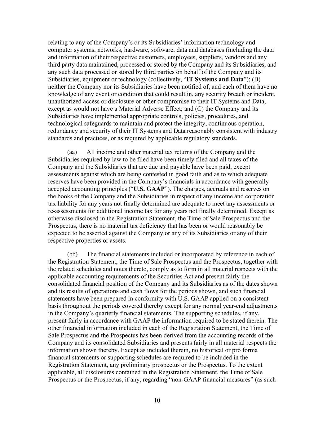 10 relating to any of the Company’s or its Subsidiaries’ information technology and computer systems, networks, hardware, software, data and databases (including the data and information of their respective customers, employees, suppliers, vendors and any third party data maintained, processed or stored by the Company and its Subsidiaries, and any such data processed or stored by third parties on behalf of the Company and its Subsidiaries, equipment or technology (collectively, “IT Systems and Data”); (B) neither the Company nor its Subsidiaries have been notified of, and each of them have no knowledge of any event or condition that could result in, any security breach or incident, unauthorized access or disclosure or other compromise to their IT Systems and Data, except as would not have a Material Adverse Effect; and (C) the Company and its Subsidiaries have implemented appropriate controls, policies, procedures, and technological safeguards to maintain and protect the integrity, continuous operation, redundancy and security of their IT Systems and Data reasonably consistent with industry standards and practices, or as required by applicable regulatory standards. (aa) All income and other material tax returns of the Company and the Subsidiaries required by law to be filed have been timely filed and all taxes of the Company and the Subsidiaries that are due and payable have been paid, except assessments against which are being contested in good faith and as to which adequate reserves have been provided in the Company’s financials in accordance with generally accepted accounting principles (“U.S. GAAP”). The charges, accruals and reserves on the books of the Company and the Subsidiaries in respect of any income and corporation tax liability for any years not finally determined are adequate to meet any assessments or re-assessments for additional income tax for any years not finally determined. Except as otherwise disclosed in the Registration Statement, the Time of Sale Prospectus and the Prospectus, there is no material tax deficiency that has been or would reasonably be expected to be asserted against the Company or any of its Subsidiaries or any of their respective properties or assets. (bb) The financial statements included or incorporated by reference in each of the Registration Statement, the Time of Sale Prospectus and the Prospectus, together with the related schedules and notes thereto, comply as to form in all material respects with the applicable accounting requirements of the Securities Act and present fairly the consolidated financial position of the Company and its Subsidiaries as of the dates shown and its results of operations and cash flows for the periods shown, and such financial statements have been prepared in conformity with U.S. GAAP applied on a consistent basis throughout the periods covered thereby except for any normal year-end adjustments in the Company’s quarterly financial statements. The supporting schedules, if any, present fairly in accordance with GAAP the information required to be stated therein. The other financial information included in each of the Registration Statement, the Time of Sale Prospectus and the Prospectus has been derived from the accounting records of the Company and its consolidated Subsidiaries and presents fairly in all material respects the information shown thereby. Except as included therein, no historical or pro forma financial statements or supporting schedules are required to be included in the Registration Statement, any preliminary prospectus or the Prospectus. To the extent applicable, all disclosures contained in the Registration Statement, the Time of Sale Prospectus or the Prospectus, if any, regarding “non-GAAP financial measures” (as such