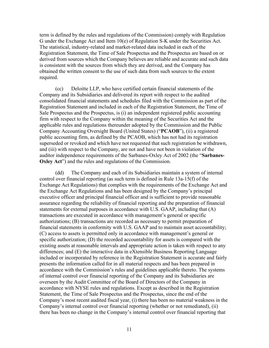 11 term is defined by the rules and regulations of the Commission) comply with Regulation G under the Exchange Act and Item 10(e) of Regulation S-K under the Securities Act. The statistical, industry-related and market-related data included in each of the Registration Statement, the Time of Sale Prospectus and the Prospectus are based on or derived from sources which the Company believes are reliable and accurate and such data is consistent with the sources from which they are derived, and the Company has obtained the written consent to the use of such data from such sources to the extent required. (cc) Deloitte LLP, who have certified certain financial statements of the Company and its Subsidiaries and delivered its report with respect to the audited consolidated financial statements and schedules filed with the Commission as part of the Registration Statement and included in each of the Registration Statement, the Time of Sale Prospectus and the Prospectus, is (i) an independent registered public accounting firm with respect to the Company within the meaning of the Securities Act and the applicable rules and regulations thereunder adopted by the Commission and the Public Company Accounting Oversight Board (United States) (“PCAOB”), (ii) a registered public accounting firm, as defined by the PCAOB, which has not had its registration superseded or revoked and which have not requested that such registration be withdrawn, and (iii) with respect to the Company, are not and have not been in violation of the auditor independence requirements of the Sarbanes-Oxley Act of 2002 (the “Sarbanes- Oxley Act”) and the rules and regulations of the Commission. (dd) The Company and each of its Subsidiaries maintain a system of internal control over financial reporting (as such term is defined in Rule 13a-15(f) of the Exchange Act Regulations) that complies with the requirements of the Exchange Act and the Exchange Act Regulations and has been designed by the Company’s principal executive officer and principal financial officer and is sufficient to provide reasonable assurance regarding the reliability of financial reporting and the preparation of financial statements for external purposes in accordance with U.S. GAAP, including that (A) transactions are executed in accordance with management’s general or specific authorizations; (B) transactions are recorded as necessary to permit preparation of financial statements in conformity with U.S. GAAP and to maintain asset accountability; (C) access to assets is permitted only in accordance with management’s general or specific authorization; (D) the recorded accountability for assets is compared with the existing assets at reasonable intervals and appropriate action is taken with respect to any differences; and (E) the interactive data in eXtensible Business Reporting Language included or incorporated by reference in the Registration Statement is accurate and fairly presents the information called for in all material respects and has been prepared in accordance with the Commission’s rules and guidelines applicable thereto. The systems of internal control over financial reporting of the Company and its Subsidiaries are overseen by the Audit Committee of the Board of Directors of the Company in accordance with NYSE rules and regulations. Except as described in the Registration Statement, the Time of Sale Prospectus and the Prospectus, since the end of the Company’s most recent audited fiscal year, (i) there has been no material weakness in the Company’s internal control over financial reporting (whether or not remediated), (ii) there has been no change in the Company’s internal control over financial reporting that