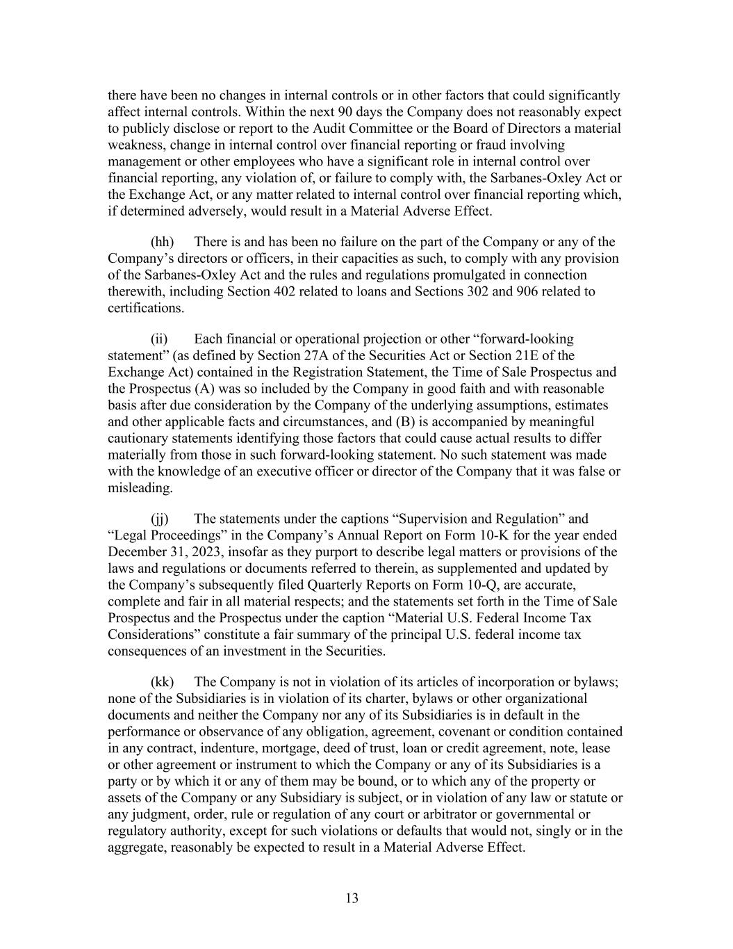 13 there have been no changes in internal controls or in other factors that could significantly affect internal controls. Within the next 90 days the Company does not reasonably expect to publicly disclose or report to the Audit Committee or the Board of Directors a material weakness, change in internal control over financial reporting or fraud involving management or other employees who have a significant role in internal control over financial reporting, any violation of, or failure to comply with, the Sarbanes-Oxley Act or the Exchange Act, or any matter related to internal control over financial reporting which, if determined adversely, would result in a Material Adverse Effect. (hh) There is and has been no failure on the part of the Company or any of the Company’s directors or officers, in their capacities as such, to comply with any provision of the Sarbanes-Oxley Act and the rules and regulations promulgated in connection therewith, including Section 402 related to loans and Sections 302 and 906 related to certifications. (ii) Each financial or operational projection or other “forward-looking statement” (as defined by Section 27A of the Securities Act or Section 21E of the Exchange Act) contained in the Registration Statement, the Time of Sale Prospectus and the Prospectus (A) was so included by the Company in good faith and with reasonable basis after due consideration by the Company of the underlying assumptions, estimates and other applicable facts and circumstances, and (B) is accompanied by meaningful cautionary statements identifying those factors that could cause actual results to differ materially from those in such forward-looking statement. No such statement was made with the knowledge of an executive officer or director of the Company that it was false or misleading. (jj) The statements under the captions “Supervision and Regulation” and “Legal Proceedings” in the Company’s Annual Report on Form 10-K for the year ended December 31, 2023, insofar as they purport to describe legal matters or provisions of the laws and regulations or documents referred to therein, as supplemented and updated by the Company’s subsequently filed Quarterly Reports on Form 10-Q, are accurate, complete and fair in all material respects; and the statements set forth in the Time of Sale Prospectus and the Prospectus under the caption “Material U.S. Federal Income Tax Considerations” constitute a fair summary of the principal U.S. federal income tax consequences of an investment in the Securities. (kk) The Company is not in violation of its articles of incorporation or bylaws; none of the Subsidiaries is in violation of its charter, bylaws or other organizational documents and neither the Company nor any of its Subsidiaries is in default in the performance or observance of any obligation, agreement, covenant or condition contained in any contract, indenture, mortgage, deed of trust, loan or credit agreement, note, lease or other agreement or instrument to which the Company or any of its Subsidiaries is a party or by which it or any of them may be bound, or to which any of the property or assets of the Company or any Subsidiary is subject, or in violation of any law or statute or any judgment, order, rule or regulation of any court or arbitrator or governmental or regulatory authority, except for such violations or defaults that would not, singly or in the aggregate, reasonably be expected to result in a Material Adverse Effect.