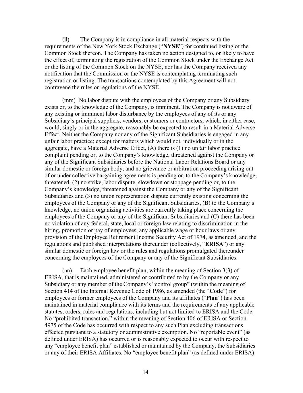 14 (ll) The Company is in compliance in all material respects with the requirements of the New York Stock Exchange (“NYSE”) for continued listing of the Common Stock thereon. The Company has taken no action designed to, or likely to have the effect of, terminating the registration of the Common Stock under the Exchange Act or the listing of the Common Stock on the NYSE, nor has the Company received any notification that the Commission or the NYSE is contemplating terminating such registration or listing. The transactions contemplated by this Agreement will not contravene the rules or regulations of the NYSE. (mm) No labor dispute with the employees of the Company or any Subsidiary exists or, to the knowledge of the Company, is imminent. The Company is not aware of any existing or imminent labor disturbance by the employees of any of its or any Subsidiary’s principal suppliers, vendors, customers or contractors, which, in either case, would, singly or in the aggregate, reasonably be expected to result in a Material Adverse Effect. Neither the Company nor any of the Significant Subsidiaries is engaged in any unfair labor practice; except for matters which would not, individually or in the aggregate, have a Material Adverse Effect, (A) there is (1) no unfair labor practice complaint pending or, to the Company’s knowledge, threatened against the Company or any of the Significant Subsidiaries before the National Labor Relations Board or any similar domestic or foreign body, and no grievance or arbitration proceeding arising out of or under collective bargaining agreements is pending or, to the Company’s knowledge, threatened, (2) no strike, labor dispute, slowdown or stoppage pending or, to the Company’s knowledge, threatened against the Company or any of the Significant Subsidiaries and (3) no union representation dispute currently existing concerning the employees of the Company or any of the Significant Subsidiaries, (B) to the Company’s knowledge, no union organizing activities are currently taking place concerning the employees of the Company or any of the Significant Subsidiaries and (C) there has been no violation of any federal, state, local or foreign law relating to discrimination in the hiring, promotion or pay of employees, any applicable wage or hour laws or any provision of the Employee Retirement Income Security Act of 1974, as amended, and the regulations and published interpretations thereunder (collectively, “ERISA”) or any similar domestic or foreign law or the rules and regulations promulgated thereunder concerning the employees of the Company or any of the Significant Subsidiaries. (nn) Each employee benefit plan, within the meaning of Section 3(3) of ERISA, that is maintained, administered or contributed to by the Company or any Subsidiary or any member of the Company’s “control group” (within the meaning of Section 414 of the Internal Revenue Code of 1986, as amended (the “Code”) for employees or former employees of the Company and its affiliates (“Plan”) has been maintained in material compliance with its terms and the requirements of any applicable statutes, orders, rules and regulations, including but not limited to ERISA and the Code. No “prohibited transaction,” within the meaning of Section 406 of ERISA or Section 4975 of the Code has occurred with respect to any such Plan excluding transactions effected pursuant to a statutory or administrative exemption. No “reportable event” (as defined under ERISA) has occurred or is reasonably expected to occur with respect to any “employee benefit plan” established or maintained by the Company, the Subsidiaries or any of their ERISA Affiliates. No “employee benefit plan” (as defined under ERISA)