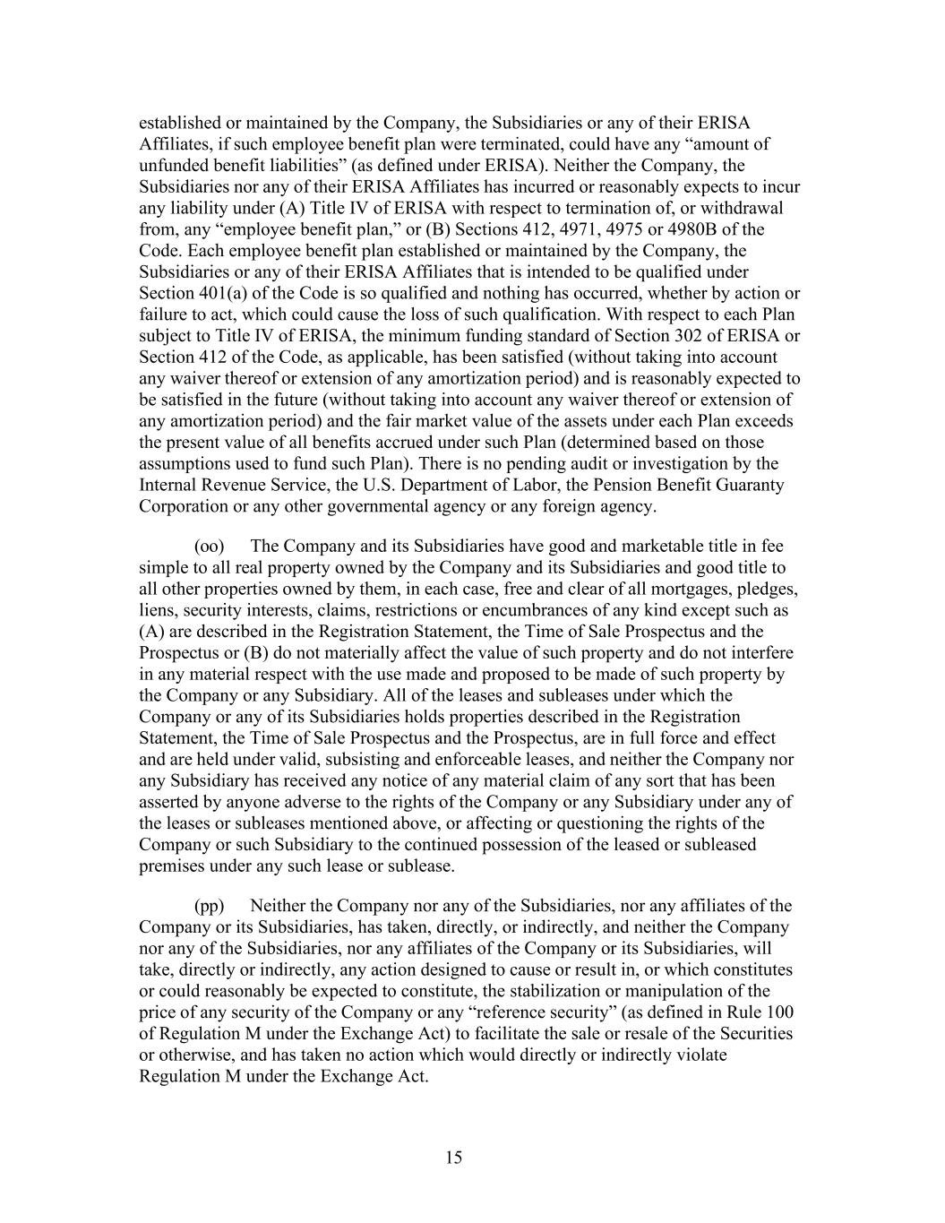 15 established or maintained by the Company, the Subsidiaries or any of their ERISA Affiliates, if such employee benefit plan were terminated, could have any “amount of unfunded benefit liabilities” (as defined under ERISA). Neither the Company, the Subsidiaries nor any of their ERISA Affiliates has incurred or reasonably expects to incur any liability under (A) Title IV of ERISA with respect to termination of, or withdrawal from, any “employee benefit plan,” or (B) Sections 412, 4971, 4975 or 4980B of the Code. Each employee benefit plan established or maintained by the Company, the Subsidiaries or any of their ERISA Affiliates that is intended to be qualified under Section 401(a) of the Code is so qualified and nothing has occurred, whether by action or failure to act, which could cause the loss of such qualification. With respect to each Plan subject to Title IV of ERISA, the minimum funding standard of Section 302 of ERISA or Section 412 of the Code, as applicable, has been satisfied (without taking into account any waiver thereof or extension of any amortization period) and is reasonably expected to be satisfied in the future (without taking into account any waiver thereof or extension of any amortization period) and the fair market value of the assets under each Plan exceeds the present value of all benefits accrued under such Plan (determined based on those assumptions used to fund such Plan). There is no pending audit or investigation by the Internal Revenue Service, the U.S. Department of Labor, the Pension Benefit Guaranty Corporation or any other governmental agency or any foreign agency. (oo) The Company and its Subsidiaries have good and marketable title in fee simple to all real property owned by the Company and its Subsidiaries and good title to all other properties owned by them, in each case, free and clear of all mortgages, pledges, liens, security interests, claims, restrictions or encumbrances of any kind except such as (A) are described in the Registration Statement, the Time of Sale Prospectus and the Prospectus or (B) do not materially affect the value of such property and do not interfere in any material respect with the use made and proposed to be made of such property by the Company or any Subsidiary. All of the leases and subleases under which the Company or any of its Subsidiaries holds properties described in the Registration Statement, the Time of Sale Prospectus and the Prospectus, are in full force and effect and are held under valid, subsisting and enforceable leases, and neither the Company nor any Subsidiary has received any notice of any material claim of any sort that has been asserted by anyone adverse to the rights of the Company or any Subsidiary under any of the leases or subleases mentioned above, or affecting or questioning the rights of the Company or such Subsidiary to the continued possession of the leased or subleased premises under any such lease or sublease. (pp) Neither the Company nor any of the Subsidiaries, nor any affiliates of the Company or its Subsidiaries, has taken, directly, or indirectly, and neither the Company nor any of the Subsidiaries, nor any affiliates of the Company or its Subsidiaries, will take, directly or indirectly, any action designed to cause or result in, or which constitutes or could reasonably be expected to constitute, the stabilization or manipulation of the price of any security of the Company or any “reference security” (as defined in Rule 100 of Regulation M under the Exchange Act) to facilitate the sale or resale of the Securities or otherwise, and has taken no action which would directly or indirectly violate Regulation M under the Exchange Act.