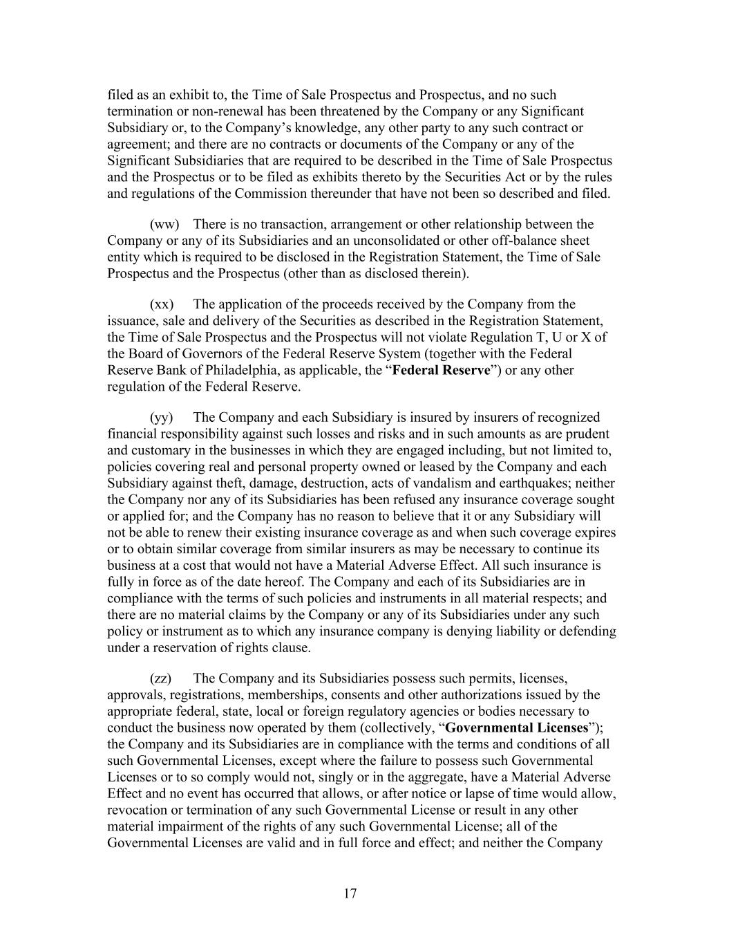 17 filed as an exhibit to, the Time of Sale Prospectus and Prospectus, and no such termination or non-renewal has been threatened by the Company or any Significant Subsidiary or, to the Company’s knowledge, any other party to any such contract or agreement; and there are no contracts or documents of the Company or any of the Significant Subsidiaries that are required to be described in the Time of Sale Prospectus and the Prospectus or to be filed as exhibits thereto by the Securities Act or by the rules and regulations of the Commission thereunder that have not been so described and filed. (ww) There is no transaction, arrangement or other relationship between the Company or any of its Subsidiaries and an unconsolidated or other off-balance sheet entity which is required to be disclosed in the Registration Statement, the Time of Sale Prospectus and the Prospectus (other than as disclosed therein). (xx) The application of the proceeds received by the Company from the issuance, sale and delivery of the Securities as described in the Registration Statement, the Time of Sale Prospectus and the Prospectus will not violate Regulation T, U or X of the Board of Governors of the Federal Reserve System (together with the Federal Reserve Bank of Philadelphia, as applicable, the “Federal Reserve”) or any other regulation of the Federal Reserve. (yy) The Company and each Subsidiary is insured by insurers of recognized financial responsibility against such losses and risks and in such amounts as are prudent and customary in the businesses in which they are engaged including, but not limited to, policies covering real and personal property owned or leased by the Company and each Subsidiary against theft, damage, destruction, acts of vandalism and earthquakes; neither the Company nor any of its Subsidiaries has been refused any insurance coverage sought or applied for; and the Company has no reason to believe that it or any Subsidiary will not be able to renew their existing insurance coverage as and when such coverage expires or to obtain similar coverage from similar insurers as may be necessary to continue its business at a cost that would not have a Material Adverse Effect. All such insurance is fully in force as of the date hereof. The Company and each of its Subsidiaries are in compliance with the terms of such policies and instruments in all material respects; and there are no material claims by the Company or any of its Subsidiaries under any such policy or instrument as to which any insurance company is denying liability or defending under a reservation of rights clause. (zz) The Company and its Subsidiaries possess such permits, licenses, approvals, registrations, memberships, consents and other authorizations issued by the appropriate federal, state, local or foreign regulatory agencies or bodies necessary to conduct the business now operated by them (collectively, “Governmental Licenses”); the Company and its Subsidiaries are in compliance with the terms and conditions of all such Governmental Licenses, except where the failure to possess such Governmental Licenses or to so comply would not, singly or in the aggregate, have a Material Adverse Effect and no event has occurred that allows, or after notice or lapse of time would allow, revocation or termination of any such Governmental License or result in any other material impairment of the rights of any such Governmental License; all of the Governmental Licenses are valid and in full force and effect; and neither the Company