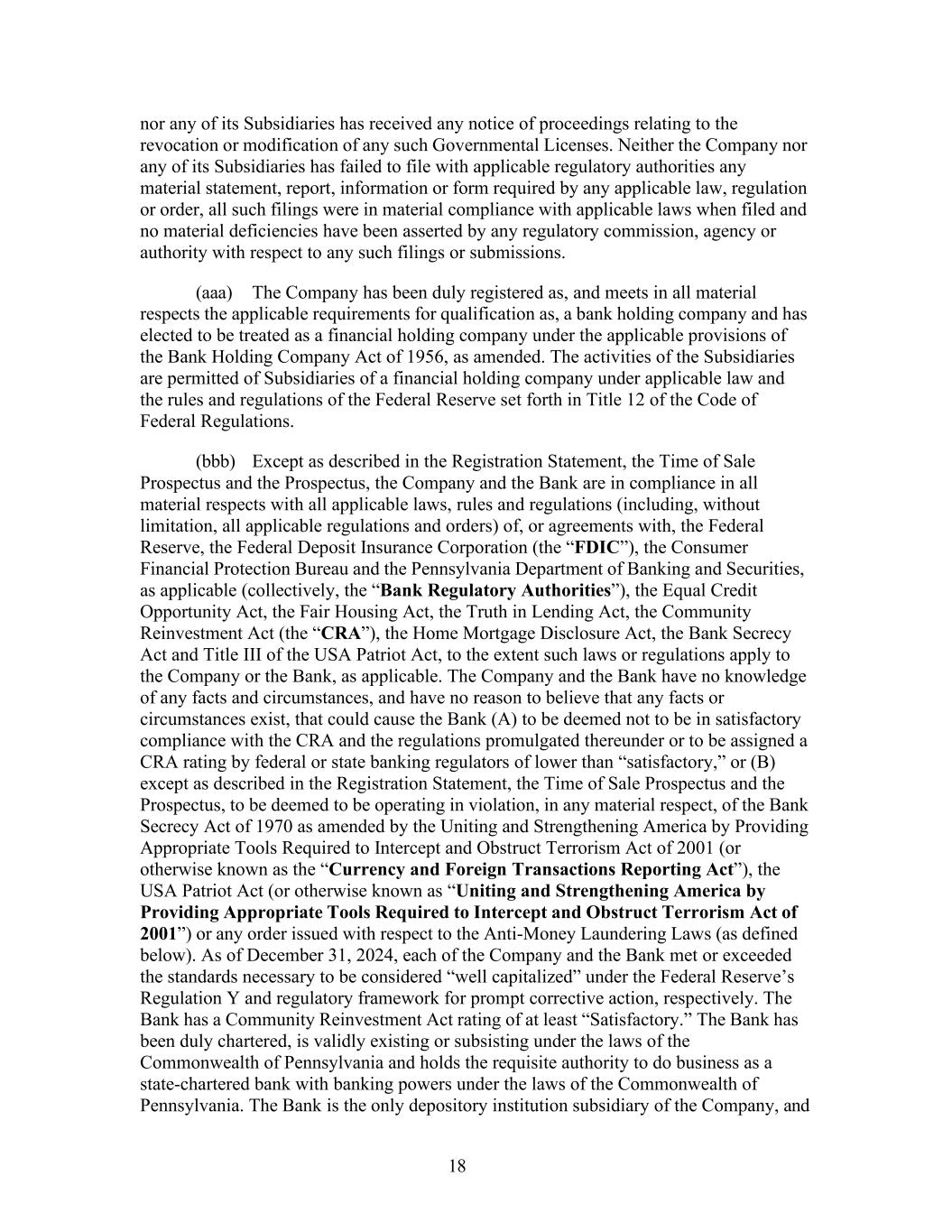 18 nor any of its Subsidiaries has received any notice of proceedings relating to the revocation or modification of any such Governmental Licenses. Neither the Company nor any of its Subsidiaries has failed to file with applicable regulatory authorities any material statement, report, information or form required by any applicable law, regulation or order, all such filings were in material compliance with applicable laws when filed and no material deficiencies have been asserted by any regulatory commission, agency or authority with respect to any such filings or submissions. (aaa) The Company has been duly registered as, and meets in all material respects the applicable requirements for qualification as, a bank holding company and has elected to be treated as a financial holding company under the applicable provisions of the Bank Holding Company Act of 1956, as amended. The activities of the Subsidiaries are permitted of Subsidiaries of a financial holding company under applicable law and the rules and regulations of the Federal Reserve set forth in Title 12 of the Code of Federal Regulations. (bbb) Except as described in the Registration Statement, the Time of Sale Prospectus and the Prospectus, the Company and the Bank are in compliance in all material respects with all applicable laws, rules and regulations (including, without limitation, all applicable regulations and orders) of, or agreements with, the Federal Reserve, the Federal Deposit Insurance Corporation (the “FDIC”), the Consumer Financial Protection Bureau and the Pennsylvania Department of Banking and Securities, as applicable (collectively, the “Bank Regulatory Authorities”), the Equal Credit Opportunity Act, the Fair Housing Act, the Truth in Lending Act, the Community Reinvestment Act (the “CRA”), the Home Mortgage Disclosure Act, the Bank Secrecy Act and Title III of the USA Patriot Act, to the extent such laws or regulations apply to the Company or the Bank, as applicable. The Company and the Bank have no knowledge of any facts and circumstances, and have no reason to believe that any facts or circumstances exist, that could cause the Bank (A) to be deemed not to be in satisfactory compliance with the CRA and the regulations promulgated thereunder or to be assigned a CRA rating by federal or state banking regulators of lower than “satisfactory,” or (B) except as described in the Registration Statement, the Time of Sale Prospectus and the Prospectus, to be deemed to be operating in violation, in any material respect, of the Bank Secrecy Act of 1970 as amended by the Uniting and Strengthening America by Providing Appropriate Tools Required to Intercept and Obstruct Terrorism Act of 2001 (or otherwise known as the “Currency and Foreign Transactions Reporting Act”), the USA Patriot Act (or otherwise known as “Uniting and Strengthening America by Providing Appropriate Tools Required to Intercept and Obstruct Terrorism Act of 2001”) or any order issued with respect to the Anti-Money Laundering Laws (as defined below). As of December 31, 2024, each of the Company and the Bank met or exceeded the standards necessary to be considered “well capitalized” under the Federal Reserve’s Regulation Y and regulatory framework for prompt corrective action, respectively. The Bank has a Community Reinvestment Act rating of at least “Satisfactory.” The Bank has been duly chartered, is validly existing or subsisting under the laws of the Commonwealth of Pennsylvania and holds the requisite authority to do business as a state-chartered bank with banking powers under the laws of the Commonwealth of Pennsylvania. The Bank is the only depository institution subsidiary of the Company, and