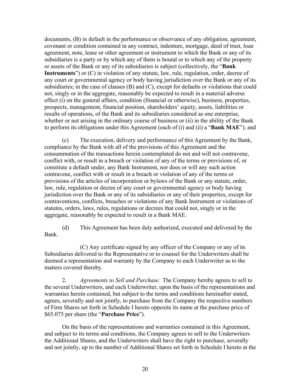20 documents, (B) in default in the performance or observance of any obligation, agreement, covenant or condition contained in any contract, indenture, mortgage, deed of trust, loan agreement, note, lease or other agreement or instrument to which the Bank or any of its subsidiaries is a party or by which any of them is bound or to which any of the property or assets of the Bank or any of its subsidiaries is subject (collectively, the “Bank Instruments”) or (C) in violation of any statute, law, rule, regulation, order, decree of any court or governmental agency or body having jurisdiction over the Bank or any of its subsidiaries; in the case of clauses (B) and (C), except for defaults or violations that could not, singly or in the aggregate, reasonably be expected to result in a material adverse effect (i) on the general affairs, condition (financial or otherwise), business, properties, prospects, management, financial position, shareholders’ equity, assets, liabilities or results of operations, of the Bank and its subsidiaries considered as one enterprise, whether or not arising in the ordinary course of business or (ii) in the ability of the Bank to perform its obligations under this Agreement (each of (i) and (ii) a “Bank MAE”); and (c) The execution, delivery and performance of this Agreement by the Bank, compliance by the Bank with all of the provisions of this Agreement and the consummation of the transactions herein contemplated do not and will not contravene, conflict with, or result in a breach or violation of any of the terms or provisions of, or constitute a default under, any Bank Instrument, nor does or will any such action contravene, conflict with or result in a breach or violation of any of the terms or provisions of the articles of incorporation or bylaws of the Bank or any statute, order, law, rule, regulation or decree of any court or governmental agency or body having jurisdiction over the Bank or any of its subsidiaries or any of their properties, except for contraventions, conflicts, breaches or violations of any Bank Instrument or violations of statutes, orders, laws, rules, regulations or decrees that could not, singly or in the aggregate, reasonably be expected to result in a Bank MAE. (d) This Agreement has been duly authorized, executed and delivered by the Bank. (C) Any certificate signed by any officer of the Company or any of its Subsidiaries delivered to the Representative or to counsel for the Underwriters shall be deemed a representation and warranty by the Company to each Underwriter as to the matters covered thereby. 2. Agreements to Sell and Purchase. The Company hereby agrees to sell to the several Underwriters, and each Underwriter, upon the basis of the representations and warranties herein contained, but subject to the terms and conditions hereinafter stated, agrees, severally and not jointly, to purchase from the Company the respective numbers of Firm Shares set forth in Schedule I hereto opposite its name at the purchase price of $65.075 per share (the “Purchase Price”). On the basis of the representations and warranties contained in this Agreement, and subject to its terms and conditions, the Company agrees to sell to the Underwriters the Additional Shares, and the Underwriters shall have the right to purchase, severally and not jointly, up to the number of Additional Shares set forth in Schedule I hereto at the