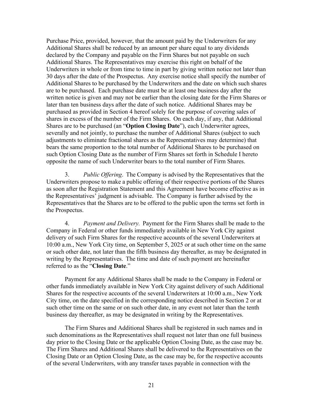 21 Purchase Price, provided, however, that the amount paid by the Underwriters for any Additional Shares shall be reduced by an amount per share equal to any dividends declared by the Company and payable on the Firm Shares but not payable on such Additional Shares. The Representatives may exercise this right on behalf of the Underwriters in whole or from time to time in part by giving written notice not later than 30 days after the date of the Prospectus. Any exercise notice shall specify the number of Additional Shares to be purchased by the Underwriters and the date on which such shares are to be purchased. Each purchase date must be at least one business day after the written notice is given and may not be earlier than the closing date for the Firm Shares or later than ten business days after the date of such notice. Additional Shares may be purchased as provided in Section 4 hereof solely for the purpose of covering sales of shares in excess of the number of the Firm Shares. On each day, if any, that Additional Shares are to be purchased (an “Option Closing Date”), each Underwriter agrees, severally and not jointly, to purchase the number of Additional Shares (subject to such adjustments to eliminate fractional shares as the Representatives may determine) that bears the same proportion to the total number of Additional Shares to be purchased on such Option Closing Date as the number of Firm Shares set forth in Schedule I hereto opposite the name of such Underwriter bears to the total number of Firm Shares. 3. Public Offering. The Company is advised by the Representatives that the Underwriters propose to make a public offering of their respective portions of the Shares as soon after the Registration Statement and this Agreement have become effective as in the Representatives’ judgment is advisable. The Company is further advised by the Representatives that the Shares are to be offered to the public upon the terms set forth in the Prospectus. 4. Payment and Delivery. Payment for the Firm Shares shall be made to the Company in Federal or other funds immediately available in New York City against delivery of such Firm Shares for the respective accounts of the several Underwriters at 10:00 a.m., New York City time, on September 5, 2025 or at such other time on the same or such other date, not later than the fifth business day thereafter, as may be designated in writing by the Representatives. The time and date of such payment are hereinafter referred to as the “Closing Date.” Payment for any Additional Shares shall be made to the Company in Federal or other funds immediately available in New York City against delivery of such Additional Shares for the respective accounts of the several Underwriters at 10:00 a.m., New York City time, on the date specified in the corresponding notice described in Section 2 or at such other time on the same or on such other date, in any event not later than the tenth business day thereafter, as may be designated in writing by the Representatives. The Firm Shares and Additional Shares shall be registered in such names and in such denominations as the Representatives shall request not later than one full business day prior to the Closing Date or the applicable Option Closing Date, as the case may be. The Firm Shares and Additional Shares shall be delivered to the Representatives on the Closing Date or an Option Closing Date, as the case may be, for the respective accounts of the several Underwriters, with any transfer taxes payable in connection with the