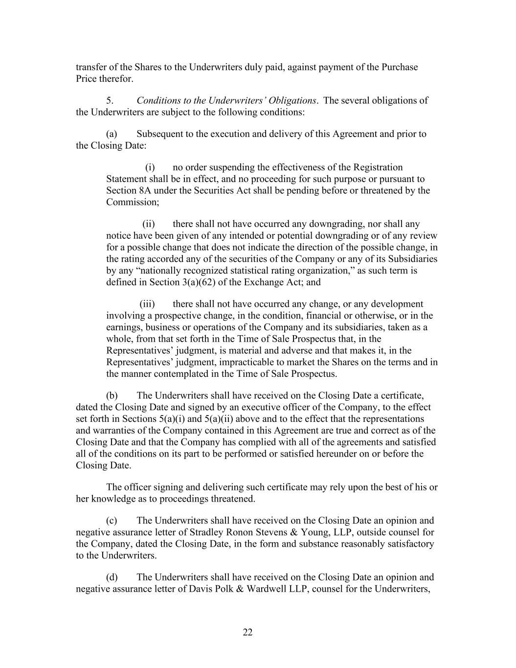 22 transfer of the Shares to the Underwriters duly paid, against payment of the Purchase Price therefor. 5. Conditions to the Underwriters’ Obligations. The several obligations of the Underwriters are subject to the following conditions: (a) Subsequent to the execution and delivery of this Agreement and prior to the Closing Date: (i) no order suspending the effectiveness of the Registration Statement shall be in effect, and no proceeding for such purpose or pursuant to Section 8A under the Securities Act shall be pending before or threatened by the Commission; (ii) there shall not have occurred any downgrading, nor shall any notice have been given of any intended or potential downgrading or of any review for a possible change that does not indicate the direction of the possible change, in the rating accorded any of the securities of the Company or any of its Subsidiaries by any “nationally recognized statistical rating organization,” as such term is defined in Section 3(a)(62) of the Exchange Act; and (iii) there shall not have occurred any change, or any development involving a prospective change, in the condition, financial or otherwise, or in the earnings, business or operations of the Company and its subsidiaries, taken as a whole, from that set forth in the Time of Sale Prospectus that, in the Representatives’ judgment, is material and adverse and that makes it, in the Representatives’ judgment, impracticable to market the Shares on the terms and in the manner contemplated in the Time of Sale Prospectus. (b) The Underwriters shall have received on the Closing Date a certificate, dated the Closing Date and signed by an executive officer of the Company, to the effect set forth in Sections 5(a)(i) and 5(a)(ii) above and to the effect that the representations and warranties of the Company contained in this Agreement are true and correct as of the Closing Date and that the Company has complied with all of the agreements and satisfied all of the conditions on its part to be performed or satisfied hereunder on or before the Closing Date. The officer signing and delivering such certificate may rely upon the best of his or her knowledge as to proceedings threatened. (c) The Underwriters shall have received on the Closing Date an opinion and negative assurance letter of Stradley Ronon Stevens & Young, LLP, outside counsel for the Company, dated the Closing Date, in the form and substance reasonably satisfactory to the Underwriters. (d) The Underwriters shall have received on the Closing Date an opinion and negative assurance letter of Davis Polk & Wardwell LLP, counsel for the Underwriters,
