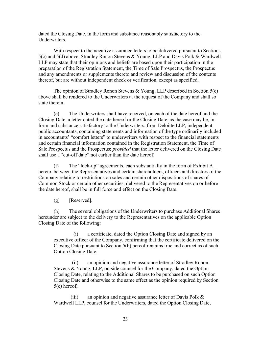 23 dated the Closing Date, in the form and substance reasonably satisfactory to the Underwriters. With respect to the negative assurance letters to be delivered pursuant to Sections 5(c) and 5(d) above, Stradley Ronon Stevens & Young, LLP and Davis Polk & Wardwell LLP may state that their opinions and beliefs are based upon their participation in the preparation of the Registration Statement, the Time of Sale Prospectus, the Prospectus and any amendments or supplements thereto and review and discussion of the contents thereof, but are without independent check or verification, except as specified. The opinion of Stradley Ronon Stevens & Young, LLP described in Section 5(c) above shall be rendered to the Underwriters at the request of the Company and shall so state therein. (e) The Underwriters shall have received, on each of the date hereof and the Closing Date, a letter dated the date hereof or the Closing Date, as the case may be, in form and substance satisfactory to the Underwriters, from Deloitte LLP, independent public accountants, containing statements and information of the type ordinarily included in accountants’ “comfort letters” to underwriters with respect to the financial statements and certain financial information contained in the Registration Statement, the Time of Sale Prospectus and the Prospectus; provided that the letter delivered on the Closing Date shall use a “cut-off date” not earlier than the date hereof. (f) The “lock-up” agreements, each substantially in the form of Exhibit A hereto, between the Representatives and certain shareholders, officers and directors of the Company relating to restrictions on sales and certain other dispositions of shares of Common Stock or certain other securities, delivered to the Representatives on or before the date hereof, shall be in full force and effect on the Closing Date. (g) [Reserved]. (h) The several obligations of the Underwriters to purchase Additional Shares hereunder are subject to the delivery to the Representatives on the applicable Option Closing Date of the following: (i) a certificate, dated the Option Closing Date and signed by an executive officer of the Company, confirming that the certificate delivered on the Closing Date pursuant to Section 5(b) hereof remains true and correct as of such Option Closing Date; (ii) an opinion and negative assurance letter of Stradley Ronon Stevens & Young, LLP, outside counsel for the Company, dated the Option Closing Date, relating to the Additional Shares to be purchased on such Option Closing Date and otherwise to the same effect as the opinion required by Section 5(c) hereof; (iii) an opinion and negative assurance letter of Davis Polk & Wardwell LLP, counsel for the Underwriters, dated the Option Closing Date,