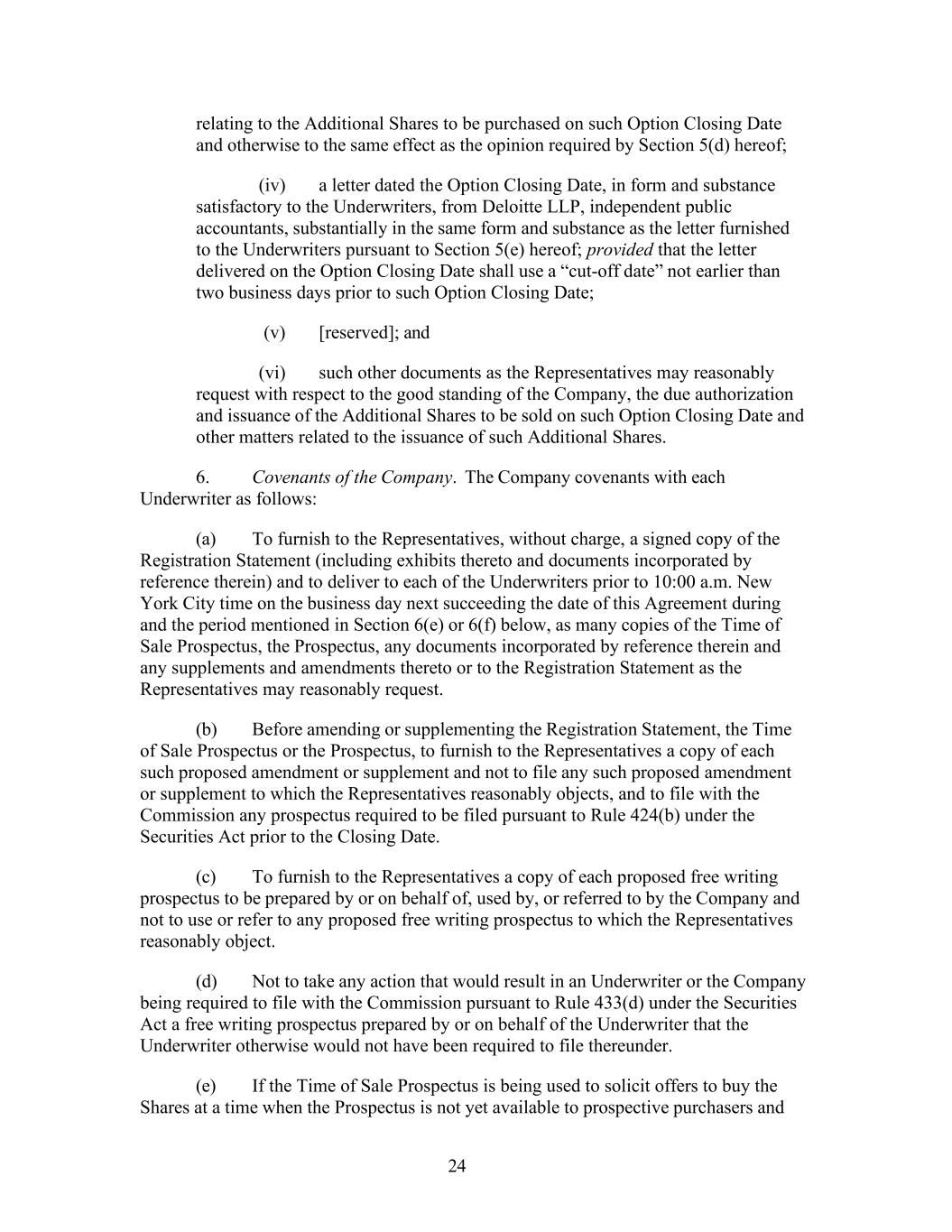 24 relating to the Additional Shares to be purchased on such Option Closing Date and otherwise to the same effect as the opinion required by Section 5(d) hereof; (iv) a letter dated the Option Closing Date, in form and substance satisfactory to the Underwriters, from Deloitte LLP, independent public accountants, substantially in the same form and substance as the letter furnished to the Underwriters pursuant to Section 5(e) hereof; provided that the letter delivered on the Option Closing Date shall use a “cut-off date” not earlier than two business days prior to such Option Closing Date; (v) [reserved]; and (vi) such other documents as the Representatives may reasonably request with respect to the good standing of the Company, the due authorization and issuance of the Additional Shares to be sold on such Option Closing Date and other matters related to the issuance of such Additional Shares. 6. Covenants of the Company. The Company covenants with each Underwriter as follows: (a) To furnish to the Representatives, without charge, a signed copy of the Registration Statement (including exhibits thereto and documents incorporated by reference therein) and to deliver to each of the Underwriters prior to 10:00 a.m. New York City time on the business day next succeeding the date of this Agreement during and the period mentioned in Section 6(e) or 6(f) below, as many copies of the Time of Sale Prospectus, the Prospectus, any documents incorporated by reference therein and any supplements and amendments thereto or to the Registration Statement as the Representatives may reasonably request. (b) Before amending or supplementing the Registration Statement, the Time of Sale Prospectus or the Prospectus, to furnish to the Representatives a copy of each such proposed amendment or supplement and not to file any such proposed amendment or supplement to which the Representatives reasonably objects, and to file with the Commission any prospectus required to be filed pursuant to Rule 424(b) under the Securities Act prior to the Closing Date. (c) To furnish to the Representatives a copy of each proposed free writing prospectus to be prepared by or on behalf of, used by, or referred to by the Company and not to use or refer to any proposed free writing prospectus to which the Representatives reasonably object. (d) Not to take any action that would result in an Underwriter or the Company being required to file with the Commission pursuant to Rule 433(d) under the Securities Act a free writing prospectus prepared by or on behalf of the Underwriter that the Underwriter otherwise would not have been required to file thereunder. (e) If the Time of Sale Prospectus is being used to solicit offers to buy the Shares at a time when the Prospectus is not yet available to prospective purchasers and
