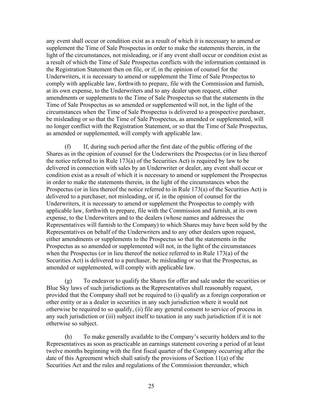 25 any event shall occur or condition exist as a result of which it is necessary to amend or supplement the Time of Sale Prospectus in order to make the statements therein, in the light of the circumstances, not misleading, or if any event shall occur or condition exist as a result of which the Time of Sale Prospectus conflicts with the information contained in the Registration Statement then on file, or if, in the opinion of counsel for the Underwriters, it is necessary to amend or supplement the Time of Sale Prospectus to comply with applicable law, forthwith to prepare, file with the Commission and furnish, at its own expense, to the Underwriters and to any dealer upon request, either amendments or supplements to the Time of Sale Prospectus so that the statements in the Time of Sale Prospectus as so amended or supplemented will not, in the light of the circumstances when the Time of Sale Prospectus is delivered to a prospective purchaser, be misleading or so that the Time of Sale Prospectus, as amended or supplemented, will no longer conflict with the Registration Statement, or so that the Time of Sale Prospectus, as amended or supplemented, will comply with applicable law. (f) If, during such period after the first date of the public offering of the Shares as in the opinion of counsel for the Underwriters the Prospectus (or in lieu thereof the notice referred to in Rule 173(a) of the Securities Act) is required by law to be delivered in connection with sales by an Underwriter or dealer, any event shall occur or condition exist as a result of which it is necessary to amend or supplement the Prospectus in order to make the statements therein, in the light of the circumstances when the Prospectus (or in lieu thereof the notice referred to in Rule 173(a) of the Securities Act) is delivered to a purchaser, not misleading, or if, in the opinion of counsel for the Underwriters, it is necessary to amend or supplement the Prospectus to comply with applicable law, forthwith to prepare, file with the Commission and furnish, at its own expense, to the Underwriters and to the dealers (whose names and addresses the Representatives will furnish to the Company) to which Shares may have been sold by the Representatives on behalf of the Underwriters and to any other dealers upon request, either amendments or supplements to the Prospectus so that the statements in the Prospectus as so amended or supplemented will not, in the light of the circumstances when the Prospectus (or in lieu thereof the notice referred to in Rule 173(a) of the Securities Act) is delivered to a purchaser, be misleading or so that the Prospectus, as amended or supplemented, will comply with applicable law. (g) To endeavor to qualify the Shares for offer and sale under the securities or Blue Sky laws of such jurisdictions as the Representatives shall reasonably request, provided that the Company shall not be required to (i) qualify as a foreign corporation or other entity or as a dealer in securities in any such jurisdiction where it would not otherwise be required to so qualify, (ii) file any general consent to service of process in any such jurisdiction or (iii) subject itself to taxation in any such jurisdiction if it is not otherwise so subject. (h) To make generally available to the Company’s security holders and to the Representatives as soon as practicable an earnings statement covering a period of at least twelve months beginning with the first fiscal quarter of the Company occurring after the date of this Agreement which shall satisfy the provisions of Section 11(a) of the Securities Act and the rules and regulations of the Commission thereunder, which