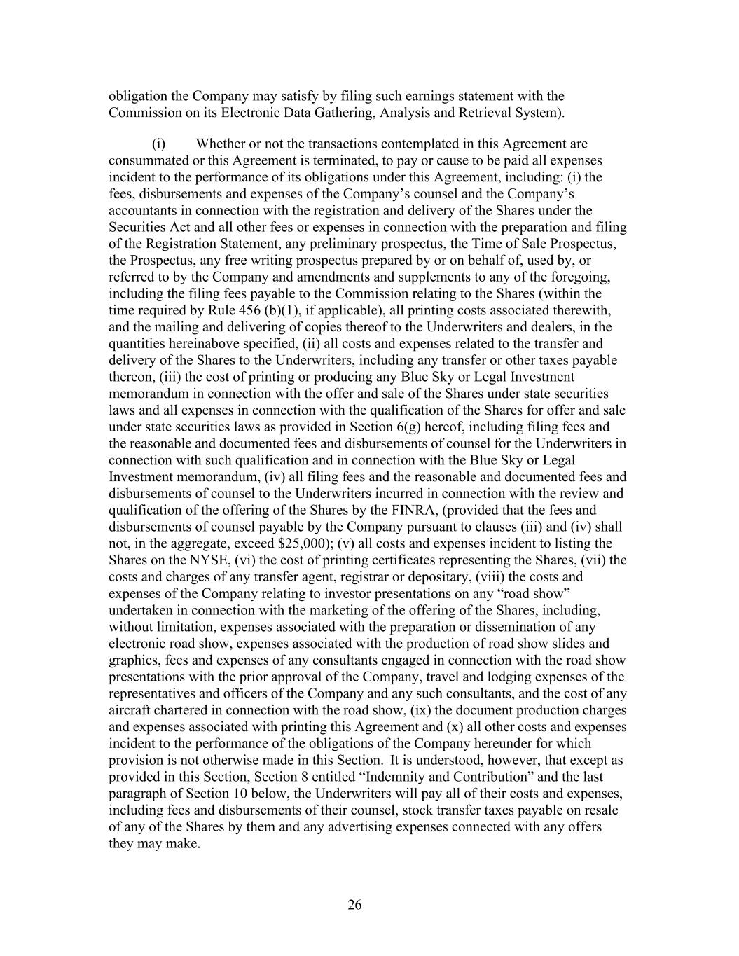 26 obligation the Company may satisfy by filing such earnings statement with the Commission on its Electronic Data Gathering, Analysis and Retrieval System). (i) Whether or not the transactions contemplated in this Agreement are consummated or this Agreement is terminated, to pay or cause to be paid all expenses incident to the performance of its obligations under this Agreement, including: (i) the fees, disbursements and expenses of the Company’s counsel and the Company’s accountants in connection with the registration and delivery of the Shares under the Securities Act and all other fees or expenses in connection with the preparation and filing of the Registration Statement, any preliminary prospectus, the Time of Sale Prospectus, the Prospectus, any free writing prospectus prepared by or on behalf of, used by, or referred to by the Company and amendments and supplements to any of the foregoing, including the filing fees payable to the Commission relating to the Shares (within the time required by Rule 456 (b)(1), if applicable), all printing costs associated therewith, and the mailing and delivering of copies thereof to the Underwriters and dealers, in the quantities hereinabove specified, (ii) all costs and expenses related to the transfer and delivery of the Shares to the Underwriters, including any transfer or other taxes payable thereon, (iii) the cost of printing or producing any Blue Sky or Legal Investment memorandum in connection with the offer and sale of the Shares under state securities laws and all expenses in connection with the qualification of the Shares for offer and sale under state securities laws as provided in Section 6(g) hereof, including filing fees and the reasonable and documented fees and disbursements of counsel for the Underwriters in connection with such qualification and in connection with the Blue Sky or Legal Investment memorandum, (iv) all filing fees and the reasonable and documented fees and disbursements of counsel to the Underwriters incurred in connection with the review and qualification of the offering of the Shares by the FINRA, (provided that the fees and disbursements of counsel payable by the Company pursuant to clauses (iii) and (iv) shall not, in the aggregate, exceed $25,000); (v) all costs and expenses incident to listing the Shares on the NYSE, (vi) the cost of printing certificates representing the Shares, (vii) the costs and charges of any transfer agent, registrar or depositary, (viii) the costs and expenses of the Company relating to investor presentations on any “road show” undertaken in connection with the marketing of the offering of the Shares, including, without limitation, expenses associated with the preparation or dissemination of any electronic road show, expenses associated with the production of road show slides and graphics, fees and expenses of any consultants engaged in connection with the road show presentations with the prior approval of the Company, travel and lodging expenses of the representatives and officers of the Company and any such consultants, and the cost of any aircraft chartered in connection with the road show, (ix) the document production charges and expenses associated with printing this Agreement and (x) all other costs and expenses incident to the performance of the obligations of the Company hereunder for which provision is not otherwise made in this Section. It is understood, however, that except as provided in this Section, Section 8 entitled “Indemnity and Contribution” and the last paragraph of Section 10 below, the Underwriters will pay all of their costs and expenses, including fees and disbursements of their counsel, stock transfer taxes payable on resale of any of the Shares by them and any advertising expenses connected with any offers they may make.