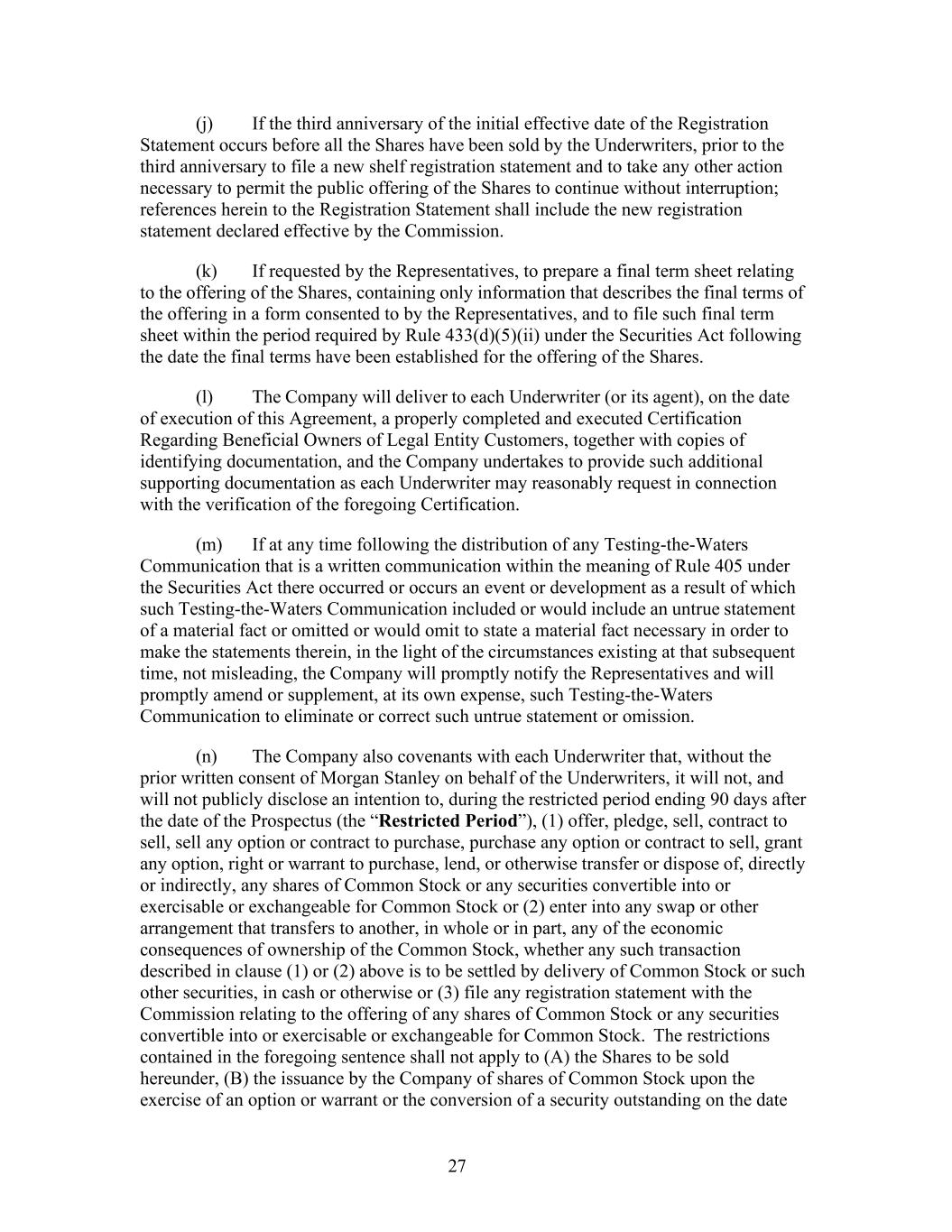 27 (j) If the third anniversary of the initial effective date of the Registration Statement occurs before all the Shares have been sold by the Underwriters, prior to the third anniversary to file a new shelf registration statement and to take any other action necessary to permit the public offering of the Shares to continue without interruption; references herein to the Registration Statement shall include the new registration statement declared effective by the Commission. (k) If requested by the Representatives, to prepare a final term sheet relating to the offering of the Shares, containing only information that describes the final terms of the offering in a form consented to by the Representatives, and to file such final term sheet within the period required by Rule 433(d)(5)(ii) under the Securities Act following the date the final terms have been established for the offering of the Shares. (l) The Company will deliver to each Underwriter (or its agent), on the date of execution of this Agreement, a properly completed and executed Certification Regarding Beneficial Owners of Legal Entity Customers, together with copies of identifying documentation, and the Company undertakes to provide such additional supporting documentation as each Underwriter may reasonably request in connection with the verification of the foregoing Certification. (m) If at any time following the distribution of any Testing-the-Waters Communication that is a written communication within the meaning of Rule 405 under the Securities Act there occurred or occurs an event or development as a result of which such Testing-the-Waters Communication included or would include an untrue statement of a material fact or omitted or would omit to state a material fact necessary in order to make the statements therein, in the light of the circumstances existing at that subsequent time, not misleading, the Company will promptly notify the Representatives and will promptly amend or supplement, at its own expense, such Testing-the-Waters Communication to eliminate or correct such untrue statement or omission. (n) The Company also covenants with each Underwriter that, without the prior written consent of Morgan Stanley on behalf of the Underwriters, it will not, and will not publicly disclose an intention to, during the restricted period ending 90 days after the date of the Prospectus (the “Restricted Period”), (1) offer, pledge, sell, contract to sell, sell any option or contract to purchase, purchase any option or contract to sell, grant any option, right or warrant to purchase, lend, or otherwise transfer or dispose of, directly or indirectly, any shares of Common Stock or any securities convertible into or exercisable or exchangeable for Common Stock or (2) enter into any swap or other arrangement that transfers to another, in whole or in part, any of the economic consequences of ownership of the Common Stock, whether any such transaction described in clause (1) or (2) above is to be settled by delivery of Common Stock or such other securities, in cash or otherwise or (3) file any registration statement with the Commission relating to the offering of any shares of Common Stock or any securities convertible into or exercisable or exchangeable for Common Stock. The restrictions contained in the foregoing sentence shall not apply to (A) the Shares to be sold hereunder, (B) the issuance by the Company of shares of Common Stock upon the exercise of an option or warrant or the conversion of a security outstanding on the date