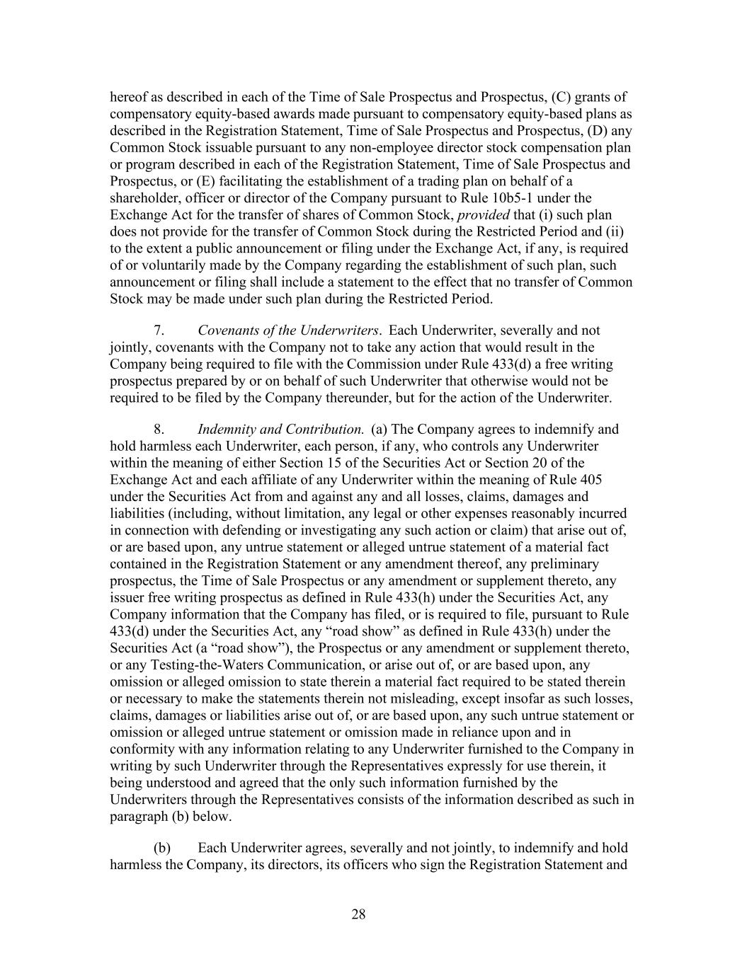 28 hereof as described in each of the Time of Sale Prospectus and Prospectus, (C) grants of compensatory equity-based awards made pursuant to compensatory equity-based plans as described in the Registration Statement, Time of Sale Prospectus and Prospectus, (D) any Common Stock issuable pursuant to any non-employee director stock compensation plan or program described in each of the Registration Statement, Time of Sale Prospectus and Prospectus, or (E) facilitating the establishment of a trading plan on behalf of a shareholder, officer or director of the Company pursuant to Rule 10b5-1 under the Exchange Act for the transfer of shares of Common Stock, provided that (i) such plan does not provide for the transfer of Common Stock during the Restricted Period and (ii) to the extent a public announcement or filing under the Exchange Act, if any, is required of or voluntarily made by the Company regarding the establishment of such plan, such announcement or filing shall include a statement to the effect that no transfer of Common Stock may be made under such plan during the Restricted Period. 7. Covenants of the Underwriters. Each Underwriter, severally and not jointly, covenants with the Company not to take any action that would result in the Company being required to file with the Commission under Rule 433(d) a free writing prospectus prepared by or on behalf of such Underwriter that otherwise would not be required to be filed by the Company thereunder, but for the action of the Underwriter. 8. Indemnity and Contribution. (a) The Company agrees to indemnify and hold harmless each Underwriter, each person, if any, who controls any Underwriter within the meaning of either Section 15 of the Securities Act or Section 20 of the Exchange Act and each affiliate of any Underwriter within the meaning of Rule 405 under the Securities Act from and against any and all losses, claims, damages and liabilities (including, without limitation, any legal or other expenses reasonably incurred in connection with defending or investigating any such action or claim) that arise out of, or are based upon, any untrue statement or alleged untrue statement of a material fact contained in the Registration Statement or any amendment thereof, any preliminary prospectus, the Time of Sale Prospectus or any amendment or supplement thereto, any issuer free writing prospectus as defined in Rule 433(h) under the Securities Act, any Company information that the Company has filed, or is required to file, pursuant to Rule 433(d) under the Securities Act, any “road show” as defined in Rule 433(h) under the Securities Act (a “road show”), the Prospectus or any amendment or supplement thereto, or any Testing-the-Waters Communication, or arise out of, or are based upon, any omission or alleged omission to state therein a material fact required to be stated therein or necessary to make the statements therein not misleading, except insofar as such losses, claims, damages or liabilities arise out of, or are based upon, any such untrue statement or omission or alleged untrue statement or omission made in reliance upon and in conformity with any information relating to any Underwriter furnished to the Company in writing by such Underwriter through the Representatives expressly for use therein, it being understood and agreed that the only such information furnished by the Underwriters through the Representatives consists of the information described as such in paragraph (b) below. (b) Each Underwriter agrees, severally and not jointly, to indemnify and hold harmless the Company, its directors, its officers who sign the Registration Statement and
