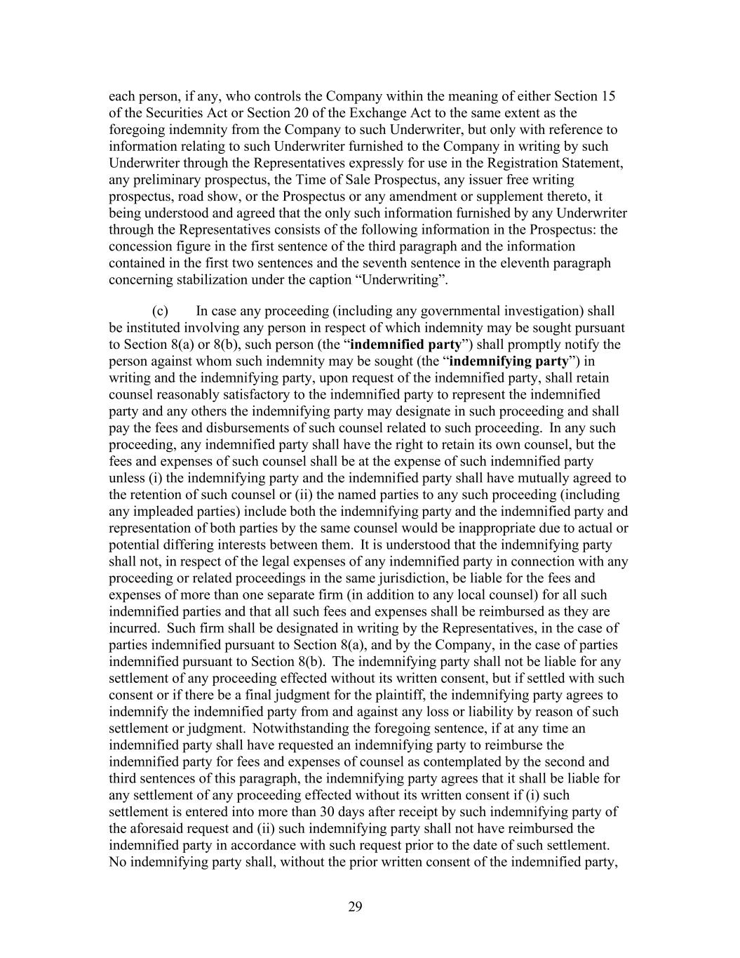 29 each person, if any, who controls the Company within the meaning of either Section 15 of the Securities Act or Section 20 of the Exchange Act to the same extent as the foregoing indemnity from the Company to such Underwriter, but only with reference to information relating to such Underwriter furnished to the Company in writing by such Underwriter through the Representatives expressly for use in the Registration Statement, any preliminary prospectus, the Time of Sale Prospectus, any issuer free writing prospectus, road show, or the Prospectus or any amendment or supplement thereto, it being understood and agreed that the only such information furnished by any Underwriter through the Representatives consists of the following information in the Prospectus: the concession figure in the first sentence of the third paragraph and the information contained in the first two sentences and the seventh sentence in the eleventh paragraph concerning stabilization under the caption “Underwriting”. (c) In case any proceeding (including any governmental investigation) shall be instituted involving any person in respect of which indemnity may be sought pursuant to Section 8(a) or 8(b), such person (the “indemnified party”) shall promptly notify the person against whom such indemnity may be sought (the “indemnifying party”) in writing and the indemnifying party, upon request of the indemnified party, shall retain counsel reasonably satisfactory to the indemnified party to represent the indemnified party and any others the indemnifying party may designate in such proceeding and shall pay the fees and disbursements of such counsel related to such proceeding. In any such proceeding, any indemnified party shall have the right to retain its own counsel, but the fees and expenses of such counsel shall be at the expense of such indemnified party unless (i) the indemnifying party and the indemnified party shall have mutually agreed to the retention of such counsel or (ii) the named parties to any such proceeding (including any impleaded parties) include both the indemnifying party and the indemnified party and representation of both parties by the same counsel would be inappropriate due to actual or potential differing interests between them. It is understood that the indemnifying party shall not, in respect of the legal expenses of any indemnified party in connection with any proceeding or related proceedings in the same jurisdiction, be liable for the fees and expenses of more than one separate firm (in addition to any local counsel) for all such indemnified parties and that all such fees and expenses shall be reimbursed as they are incurred. Such firm shall be designated in writing by the Representatives, in the case of parties indemnified pursuant to Section 8(a), and by the Company, in the case of parties indemnified pursuant to Section 8(b). The indemnifying party shall not be liable for any settlement of any proceeding effected without its written consent, but if settled with such consent or if there be a final judgment for the plaintiff, the indemnifying party agrees to indemnify the indemnified party from and against any loss or liability by reason of such settlement or judgment. Notwithstanding the foregoing sentence, if at any time an indemnified party shall have requested an indemnifying party to reimburse the indemnified party for fees and expenses of counsel as contemplated by the second and third sentences of this paragraph, the indemnifying party agrees that it shall be liable for any settlement of any proceeding effected without its written consent if (i) such settlement is entered into more than 30 days after receipt by such indemnifying party of the aforesaid request and (ii) such indemnifying party shall not have reimbursed the indemnified party in accordance with such request prior to the date of such settlement. No indemnifying party shall, without the prior written consent of the indemnified party,