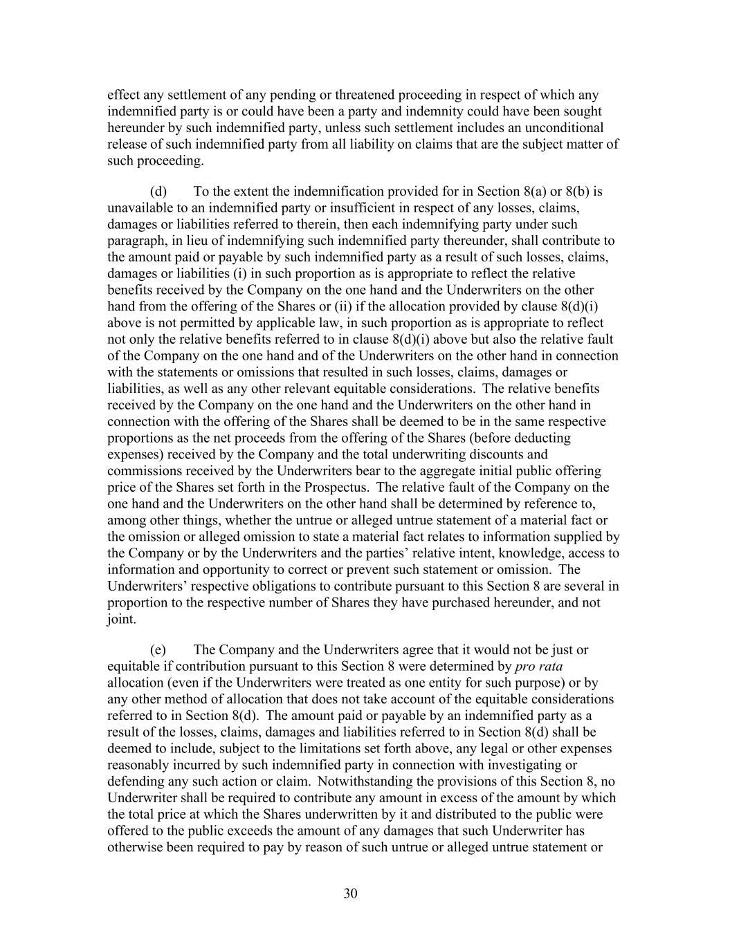 30 effect any settlement of any pending or threatened proceeding in respect of which any indemnified party is or could have been a party and indemnity could have been sought hereunder by such indemnified party, unless such settlement includes an unconditional release of such indemnified party from all liability on claims that are the subject matter of such proceeding. (d) To the extent the indemnification provided for in Section 8(a) or 8(b) is unavailable to an indemnified party or insufficient in respect of any losses, claims, damages or liabilities referred to therein, then each indemnifying party under such paragraph, in lieu of indemnifying such indemnified party thereunder, shall contribute to the amount paid or payable by such indemnified party as a result of such losses, claims, damages or liabilities (i) in such proportion as is appropriate to reflect the relative benefits received by the Company on the one hand and the Underwriters on the other hand from the offering of the Shares or (ii) if the allocation provided by clause 8(d)(i) above is not permitted by applicable law, in such proportion as is appropriate to reflect not only the relative benefits referred to in clause 8(d)(i) above but also the relative fault of the Company on the one hand and of the Underwriters on the other hand in connection with the statements or omissions that resulted in such losses, claims, damages or liabilities, as well as any other relevant equitable considerations. The relative benefits received by the Company on the one hand and the Underwriters on the other hand in connection with the offering of the Shares shall be deemed to be in the same respective proportions as the net proceeds from the offering of the Shares (before deducting expenses) received by the Company and the total underwriting discounts and commissions received by the Underwriters bear to the aggregate initial public offering price of the Shares set forth in the Prospectus. The relative fault of the Company on the one hand and the Underwriters on the other hand shall be determined by reference to, among other things, whether the untrue or alleged untrue statement of a material fact or the omission or alleged omission to state a material fact relates to information supplied by the Company or by the Underwriters and the parties’ relative intent, knowledge, access to information and opportunity to correct or prevent such statement or omission. The Underwriters’ respective obligations to contribute pursuant to this Section 8 are several in proportion to the respective number of Shares they have purchased hereunder, and not joint. (e) The Company and the Underwriters agree that it would not be just or equitable if contribution pursuant to this Section 8 were determined by pro rata allocation (even if the Underwriters were treated as one entity for such purpose) or by any other method of allocation that does not take account of the equitable considerations referred to in Section 8(d). The amount paid or payable by an indemnified party as a result of the losses, claims, damages and liabilities referred to in Section 8(d) shall be deemed to include, subject to the limitations set forth above, any legal or other expenses reasonably incurred by such indemnified party in connection with investigating or defending any such action or claim. Notwithstanding the provisions of this Section 8, no Underwriter shall be required to contribute any amount in excess of the amount by which the total price at which the Shares underwritten by it and distributed to the public were offered to the public exceeds the amount of any damages that such Underwriter has otherwise been required to pay by reason of such untrue or alleged untrue statement or