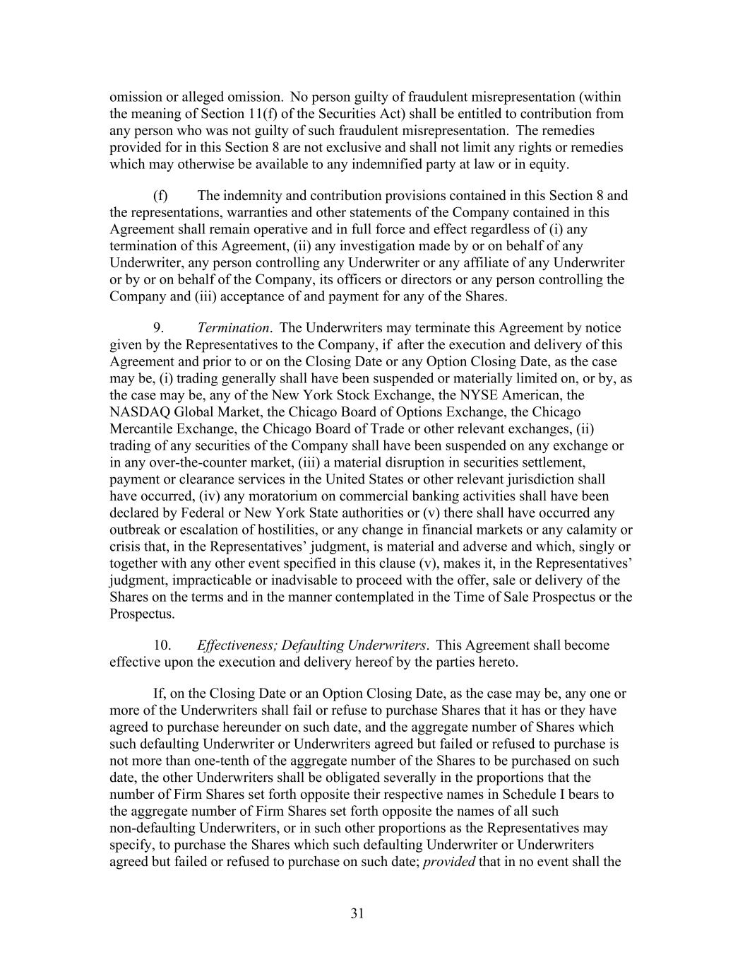 31 omission or alleged omission. No person guilty of fraudulent misrepresentation (within the meaning of Section 11(f) of the Securities Act) shall be entitled to contribution from any person who was not guilty of such fraudulent misrepresentation. The remedies provided for in this Section 8 are not exclusive and shall not limit any rights or remedies which may otherwise be available to any indemnified party at law or in equity. (f) The indemnity and contribution provisions contained in this Section 8 and the representations, warranties and other statements of the Company contained in this Agreement shall remain operative and in full force and effect regardless of (i) any termination of this Agreement, (ii) any investigation made by or on behalf of any Underwriter, any person controlling any Underwriter or any affiliate of any Underwriter or by or on behalf of the Company, its officers or directors or any person controlling the Company and (iii) acceptance of and payment for any of the Shares. 9. Termination. The Underwriters may terminate this Agreement by notice given by the Representatives to the Company, if after the execution and delivery of this Agreement and prior to or on the Closing Date or any Option Closing Date, as the case may be, (i) trading generally shall have been suspended or materially limited on, or by, as the case may be, any of the New York Stock Exchange, the NYSE American, the NASDAQ Global Market, the Chicago Board of Options Exchange, the Chicago Mercantile Exchange, the Chicago Board of Trade or other relevant exchanges, (ii) trading of any securities of the Company shall have been suspended on any exchange or in any over-the-counter market, (iii) a material disruption in securities settlement, payment or clearance services in the United States or other relevant jurisdiction shall have occurred, (iv) any moratorium on commercial banking activities shall have been declared by Federal or New York State authorities or (v) there shall have occurred any outbreak or escalation of hostilities, or any change in financial markets or any calamity or crisis that, in the Representatives’ judgment, is material and adverse and which, singly or together with any other event specified in this clause (v), makes it, in the Representatives’ judgment, impracticable or inadvisable to proceed with the offer, sale or delivery of the Shares on the terms and in the manner contemplated in the Time of Sale Prospectus or the Prospectus. 10. Effectiveness; Defaulting Underwriters. This Agreement shall become effective upon the execution and delivery hereof by the parties hereto. If, on the Closing Date or an Option Closing Date, as the case may be, any one or more of the Underwriters shall fail or refuse to purchase Shares that it has or they have agreed to purchase hereunder on such date, and the aggregate number of Shares which such defaulting Underwriter or Underwriters agreed but failed or refused to purchase is not more than one-tenth of the aggregate number of the Shares to be purchased on such date, the other Underwriters shall be obligated severally in the proportions that the number of Firm Shares set forth opposite their respective names in Schedule I bears to the aggregate number of Firm Shares set forth opposite the names of all such non-defaulting Underwriters, or in such other proportions as the Representatives may specify, to purchase the Shares which such defaulting Underwriter or Underwriters agreed but failed or refused to purchase on such date; provided that in no event shall the