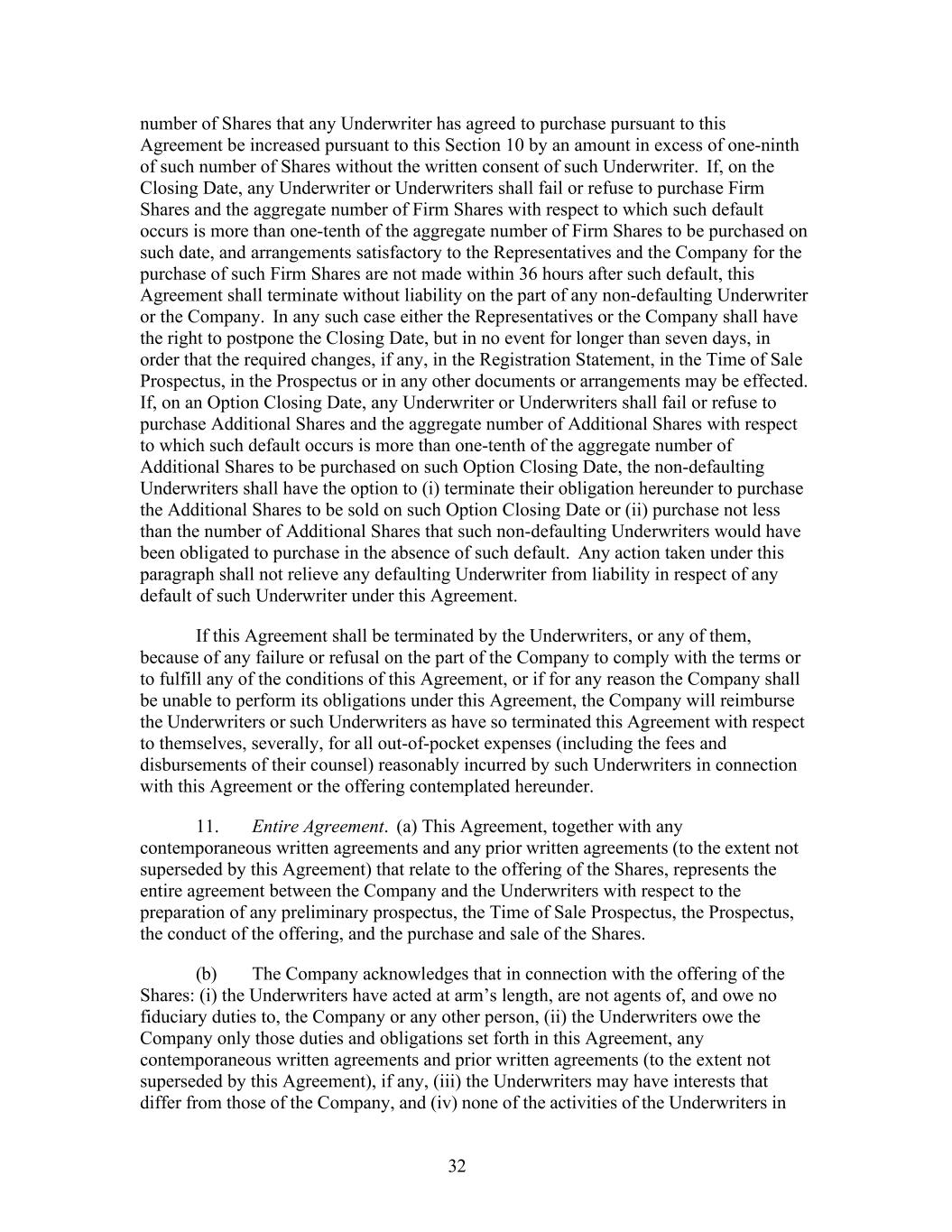 32 number of Shares that any Underwriter has agreed to purchase pursuant to this Agreement be increased pursuant to this Section 10 by an amount in excess of one-ninth of such number of Shares without the written consent of such Underwriter. If, on the Closing Date, any Underwriter or Underwriters shall fail or refuse to purchase Firm Shares and the aggregate number of Firm Shares with respect to which such default occurs is more than one-tenth of the aggregate number of Firm Shares to be purchased on such date, and arrangements satisfactory to the Representatives and the Company for the purchase of such Firm Shares are not made within 36 hours after such default, this Agreement shall terminate without liability on the part of any non-defaulting Underwriter or the Company. In any such case either the Representatives or the Company shall have the right to postpone the Closing Date, but in no event for longer than seven days, in order that the required changes, if any, in the Registration Statement, in the Time of Sale Prospectus, in the Prospectus or in any other documents or arrangements may be effected. If, on an Option Closing Date, any Underwriter or Underwriters shall fail or refuse to purchase Additional Shares and the aggregate number of Additional Shares with respect to which such default occurs is more than one-tenth of the aggregate number of Additional Shares to be purchased on such Option Closing Date, the non-defaulting Underwriters shall have the option to (i) terminate their obligation hereunder to purchase the Additional Shares to be sold on such Option Closing Date or (ii) purchase not less than the number of Additional Shares that such non-defaulting Underwriters would have been obligated to purchase in the absence of such default. Any action taken under this paragraph shall not relieve any defaulting Underwriter from liability in respect of any default of such Underwriter under this Agreement. If this Agreement shall be terminated by the Underwriters, or any of them, because of any failure or refusal on the part of the Company to comply with the terms or to fulfill any of the conditions of this Agreement, or if for any reason the Company shall be unable to perform its obligations under this Agreement, the Company will reimburse the Underwriters or such Underwriters as have so terminated this Agreement with respect to themselves, severally, for all out-of-pocket expenses (including the fees and disbursements of their counsel) reasonably incurred by such Underwriters in connection with this Agreement or the offering contemplated hereunder. 11. Entire Agreement. (a) This Agreement, together with any contemporaneous written agreements and any prior written agreements (to the extent not superseded by this Agreement) that relate to the offering of the Shares, represents the entire agreement between the Company and the Underwriters with respect to the preparation of any preliminary prospectus, the Time of Sale Prospectus, the Prospectus, the conduct of the offering, and the purchase and sale of the Shares. (b) The Company acknowledges that in connection with the offering of the Shares: (i) the Underwriters have acted at arm’s length, are not agents of, and owe no fiduciary duties to, the Company or any other person, (ii) the Underwriters owe the Company only those duties and obligations set forth in this Agreement, any contemporaneous written agreements and prior written agreements (to the extent not superseded by this Agreement), if any, (iii) the Underwriters may have interests that differ from those of the Company, and (iv) none of the activities of the Underwriters in
