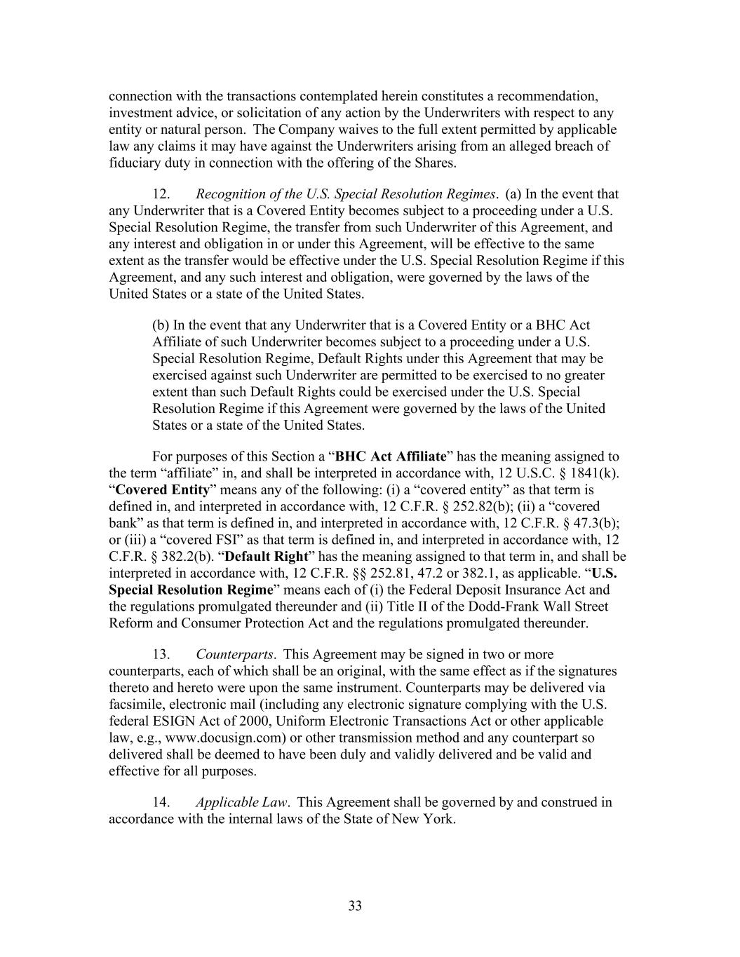 33 connection with the transactions contemplated herein constitutes a recommendation, investment advice, or solicitation of any action by the Underwriters with respect to any entity or natural person. The Company waives to the full extent permitted by applicable law any claims it may have against the Underwriters arising from an alleged breach of fiduciary duty in connection with the offering of the Shares. 12. Recognition of the U.S. Special Resolution Regimes. (a) In the event that any Underwriter that is a Covered Entity becomes subject to a proceeding under a U.S. Special Resolution Regime, the transfer from such Underwriter of this Agreement, and any interest and obligation in or under this Agreement, will be effective to the same extent as the transfer would be effective under the U.S. Special Resolution Regime if this Agreement, and any such interest and obligation, were governed by the laws of the United States or a state of the United States. (b) In the event that any Underwriter that is a Covered Entity or a BHC Act Affiliate of such Underwriter becomes subject to a proceeding under a U.S. Special Resolution Regime, Default Rights under this Agreement that may be exercised against such Underwriter are permitted to be exercised to no greater extent than such Default Rights could be exercised under the U.S. Special Resolution Regime if this Agreement were governed by the laws of the United States or a state of the United States. For purposes of this Section a “BHC Act Affiliate” has the meaning assigned to the term “affiliate” in, and shall be interpreted in accordance with, 12 U.S.C. § 1841(k). “Covered Entity” means any of the following: (i) a “covered entity” as that term is defined in, and interpreted in accordance with, 12 C.F.R. § 252.82(b); (ii) a “covered bank” as that term is defined in, and interpreted in accordance with, 12 C.F.R. § 47.3(b); or (iii) a “covered FSI” as that term is defined in, and interpreted in accordance with, 12 C.F.R. § 382.2(b). “Default Right” has the meaning assigned to that term in, and shall be interpreted in accordance with, 12 C.F.R. §§ 252.81, 47.2 or 382.1, as applicable. “U.S. Special Resolution Regime” means each of (i) the Federal Deposit Insurance Act and the regulations promulgated thereunder and (ii) Title II of the Dodd-Frank Wall Street Reform and Consumer Protection Act and the regulations promulgated thereunder. 13. Counterparts. This Agreement may be signed in two or more counterparts, each of which shall be an original, with the same effect as if the signatures thereto and hereto were upon the same instrument. Counterparts may be delivered via facsimile, electronic mail (including any electronic signature complying with the U.S. federal ESIGN Act of 2000, Uniform Electronic Transactions Act or other applicable law, e.g., www.docusign.com) or other transmission method and any counterpart so delivered shall be deemed to have been duly and validly delivered and be valid and effective for all purposes. 14. Applicable Law. This Agreement shall be governed by and construed in accordance with the internal laws of the State of New York.