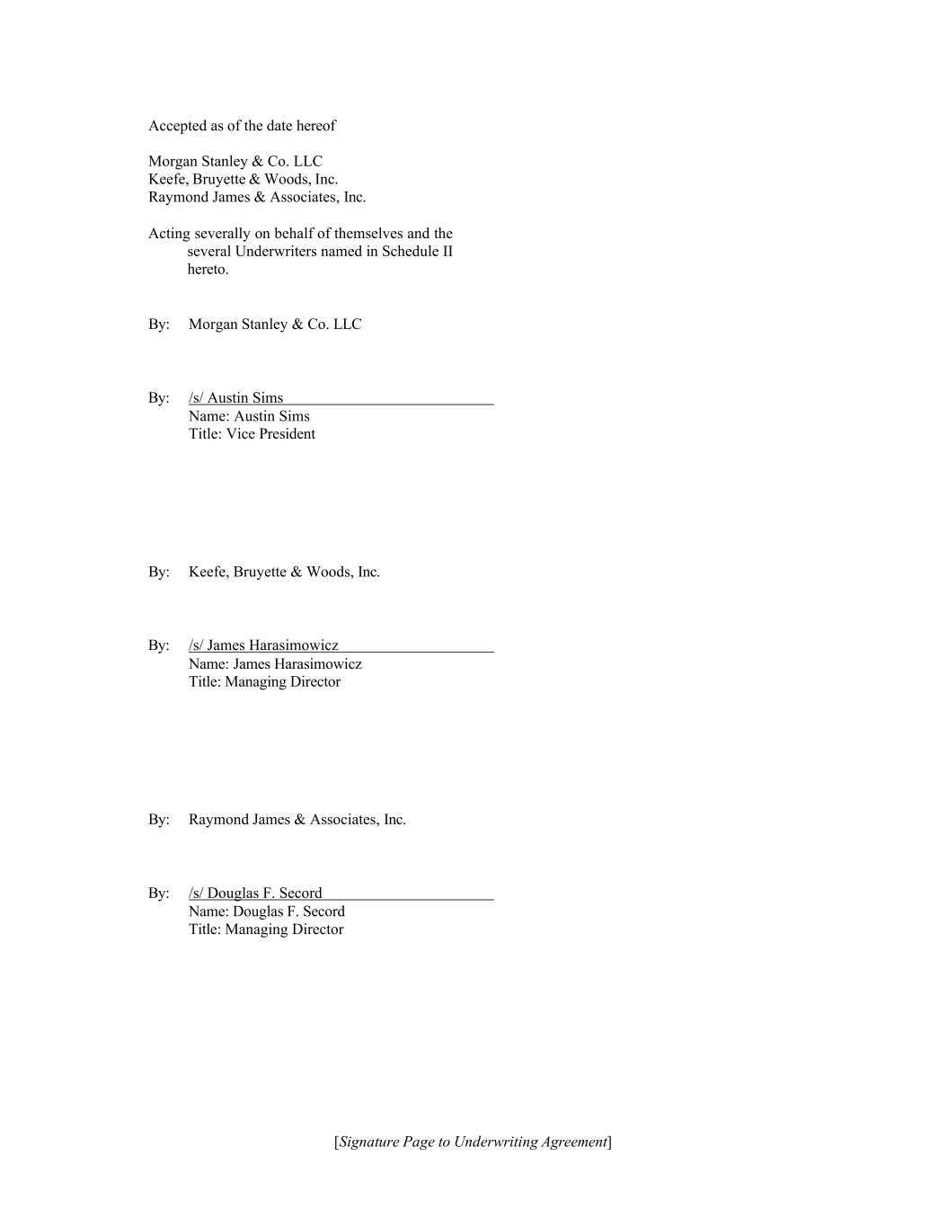 [Signature Page to Underwriting Agreement] Accepted as of the date hereof Morgan Stanley & Co. LLC Keefe, Bruyette & Woods, Inc. Raymond James & Associates, Inc. Acting severally on behalf of themselves and the several Underwriters named in Schedule II hereto. By: Morgan Stanley & Co. LLC By: /s/ Austin Sims Name: Austin Sims Title: Vice President By: Keefe, Bruyette & Woods, Inc. By: /s/ James Harasimowicz Name: James Harasimowicz Title: Managing Director By: Raymond James & Associates, Inc. By: /s/ Douglas F. Secord Name: Douglas F. Secord Title: Managing Director