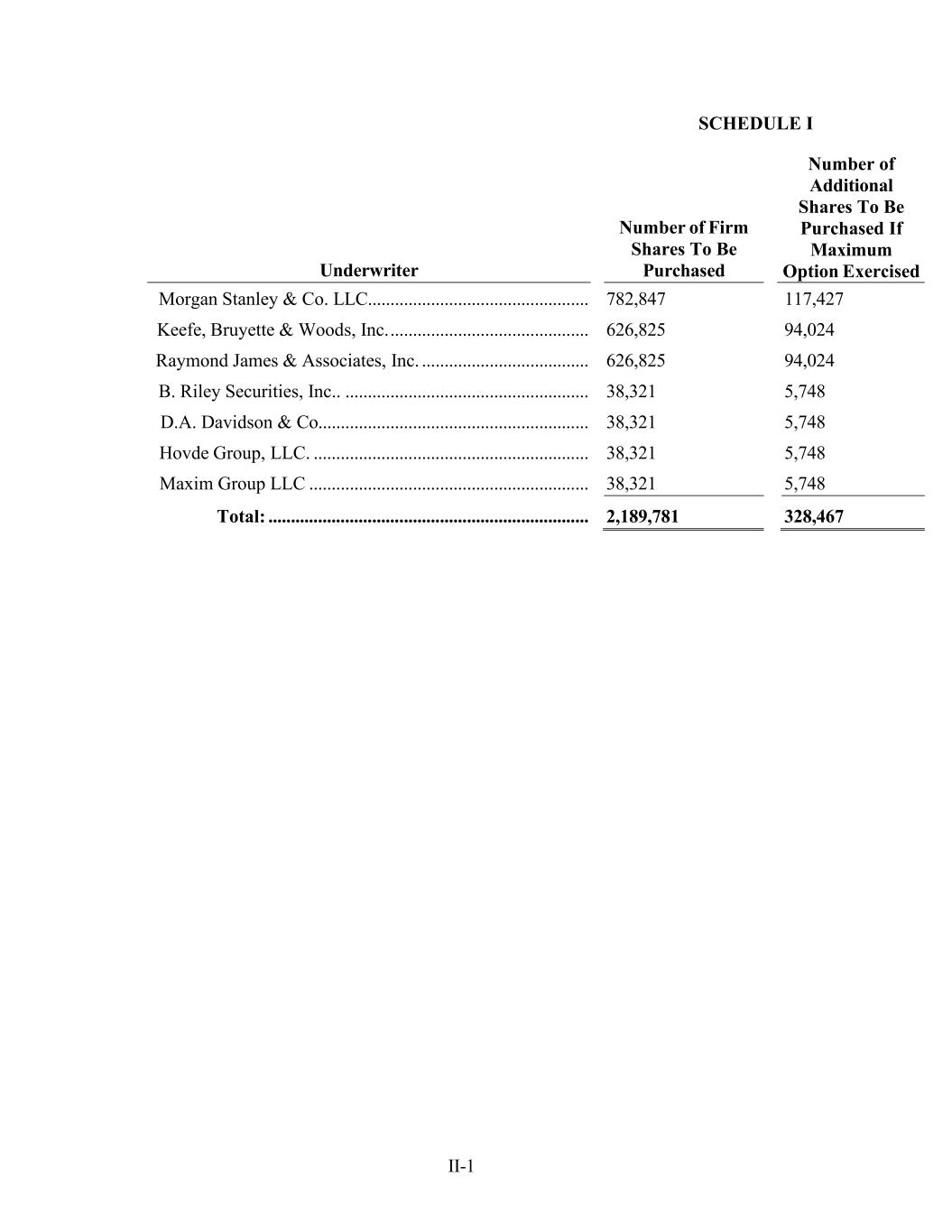 II-1 SCHEDULE I Underwriter Number of Firm Shares To Be Purchased Number of Additional Shares To Be Purchased If Maximum Option Exercised Morgan Stanley & Co. LLC................................................. 782,847 117,427 Keefe, Bruyette & Woods, Inc. ............................................ 626,825 94,024 Raymond James & Associates, Inc. ..................................... 626,825 94,024 B. Riley Securities, Inc.. ...................................................... 38,321 5,748 D.A. Davidson & Co............................................................ 38,321 5,748 Hovde Group, LLC. ............................................................. 38,321 5,748 Maxim Group LLC .............................................................. 38,321 5,748 Total: ....................................................................... 2,189,781 328,467
