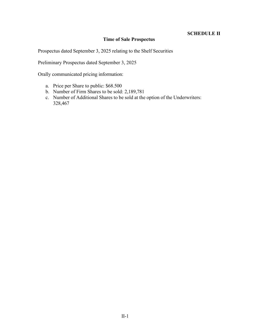 II-1 SCHEDULE II Time of Sale Prospectus Prospectus dated September 3, 2025 relating to the Shelf Securities Preliminary Prospectus dated September 3, 2025 Orally communicated pricing information: a. Price per Share to public: $68.500 b. Number of Firm Shares to be sold: 2,189,781 c. Number of Additional Shares to be sold at the option of the Underwriters: 328,467
