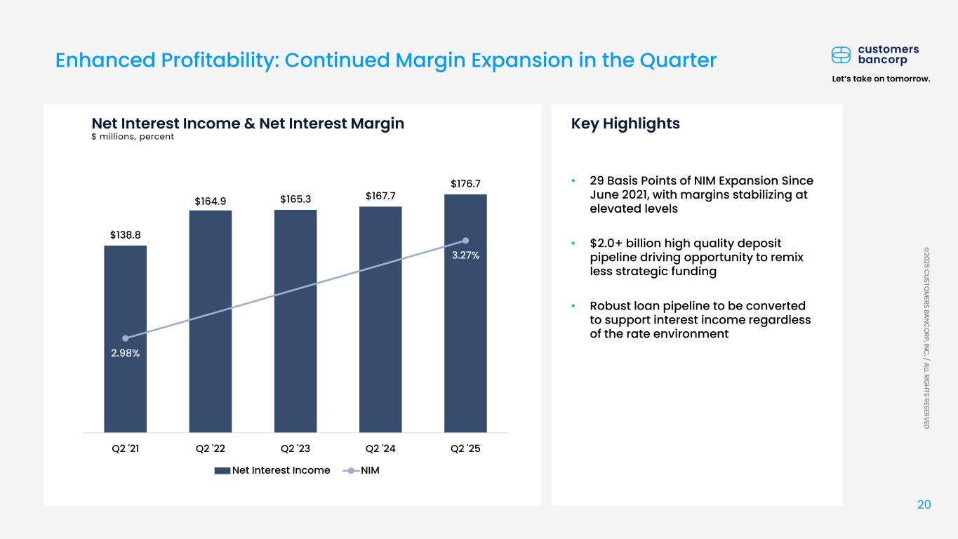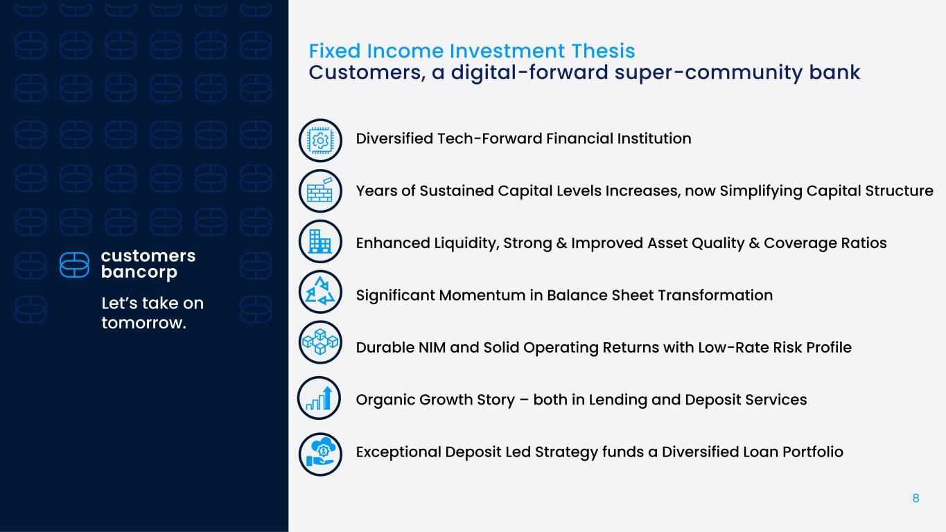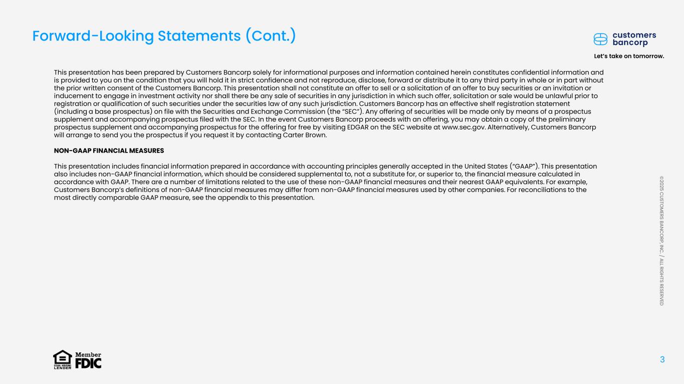 Let’s take on tomorrow. 2 © 2025 C USTO M ERS BANC O RP, INC . / ALL RIG HTS RESERVED In addition to historical information, this presentation may contain “forward-looking statements” within the meaning of the “safe harbor” provisions of the Private Securities Litigation Reform Act of 1995. These forward-looking statements include statements with respect to Customers Bancorp, Inc.’s strategies, goals, beliefs, expectations, estimates, intentions, capital raising efforts, financial condition and results of operations, future performance and business. Statements preceded by, followed by, or that include the words “may,” “could,” “should,” “pro forma,” “looking forward,” “would,” “believe,” “expect,” “anticipate,” “estimate,” “intend,” “plan,” “project,” or similar expressions generally indicate a forward-looking statement. These forward-looking statements involve risks and uncertainties that are subject to change based on various important factors (some of which, in whole or in part, are beyond Customers Bancorp, Inc.’s control). Numerous competitive, economic, regulatory, legal and technological events and factors, among others, could cause Customers Bancorp, Inc.’s financial performance to differ materially from the goals, plans, objectives, intentions and expectations expressed in such forward-looking statements, including: a continuation of the recent turmoil in the banking industry, responsive measures taken by us and regulatory authorities to mitigate and manage related risks, regulatory actions taken that address related issues and the costs and obligations associated therewith, such as the FDIC special assessments; the potential for negative consequences resulting from regulatory violations, investigations and examinations, including potential supervisory actions, the assessment of fines and penalties, the imposition of sanctions, the need to undertake remedial actions and possible damage to our reputation; effects of competition on deposit rates and growth, loan rates and growth and net interest margin; failure to identify and adequately and promptly address cybersecurity risks, including data breaches and cyberattacks; public health crises and pandemics and their effects on the economic and business environments in which we operate; geopolitical conditions, including acts or threats of terrorism, actions taken by the United States or other governments in response to acts or threats of terrorism and military conflicts, including the war between Russia and Ukraine and ongoing conflict in the Middle East, which could impact economic conditions in the United States; the impact that changes in the economy have on the performance of our loan and lease portfolio, the market value of our investment securities, the demand for our products and services and the availability of sources of funding; the effects of actions by the federal government, including the Board of Governors of the Federal Reserve System and other government agencies, that affect market interest rates and the money supply; the effects of changes in U.S. trade policies, including the imposition of tariffs and retaliatory tariffs on its trading partners; actions that we and our customers take in response to these developments and the effects such actions have on our operations, products, services and customer relationships; higher inflation and its impacts; the effects of changes in U.S. trade policies, including the imposition of tariffs and retaliatory tariffs on its trading partners; and the effects of any changes in accounting standards or policies. Customers Bancorp, Inc. cautions that the foregoing factors are not exclusive, and neither such factors nor any such forward-looking statement takes into account the impact of any future events. All forward-looking statements and information set forth herein are based on management’s current beliefs and assumptions as of the date hereof and speak only as of the date they are made. For a more complete discussion of the assumptions, risks and uncertainties related to our business, you are encouraged to review Customers Bancorp, Inc.’s filings with the Securities and Exchange Commission, including its most recent annual report on Form 10-K for the year ended December 31, 2024, subsequently filed quarterly reports on Form 10-Q and current reports on Form 8-K, including any amendments thereto, that update or provide information in addition to the information included in the Form 10-K and Form 10-Q filings, if any. Customers Bancorp, Inc. does not undertake to update any forward- looking statement whether written or oral, that may be made from time to time by Customers Bancorp, Inc. or by or on behalf of Customers Bank, except as may be required under applicable law. Forward-Looking Statements