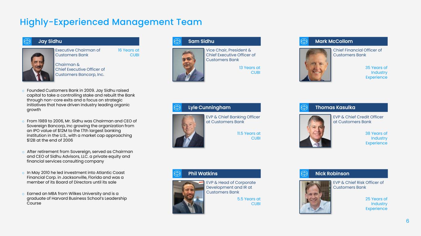 o Appointed President & CEO of Customers Bank July 2021 o Joined the board of Customers Bancorp in 2012 and became a full- time officer of the Bank in early 2020 o Prior to joining Customers Bank full-time, Sam Sidhu was the founder and CEO of Megalith Capital Management, a real estate focused private equity firm o Held various roles as an investor at Providence Equity Partners LLC and in investment banking with Goldman Sachs o Earned a BA from the Wharton School of Business and an MBA from the Harvard Business School Vice Chair, President, & Chief Executive Officer of Customers Bank Incoming CEO of Customers Bancorp, Inc. 13 Years at CUBI Sam Sidhu 5 Mark McCollom Chief Financial Officer of Customers Bank o Appointed CFO of Customers Bancorp in June 2025 o Most recently served as CFO of Fulton Financial Corporation, a $30 billion financial holding company headquartered in Lancaster, PA, and parent company of Fulton Bank o Prior to Fulton, spent 9 years in senior leadership at Griffin Financial Group, an investment banking and financial advisory firm, and served as the Chief Financial Officer of Sovereign Bancorp, Inc., the parent of Sovereign Bank, from 1996 through 2008 o Earned a BS in Accounting from The Pennsylvania State University Chief Financial Officer of Customers Bancorp, Inc. 35 Years of experience in finance, strategy and operations Today’s Presenters: