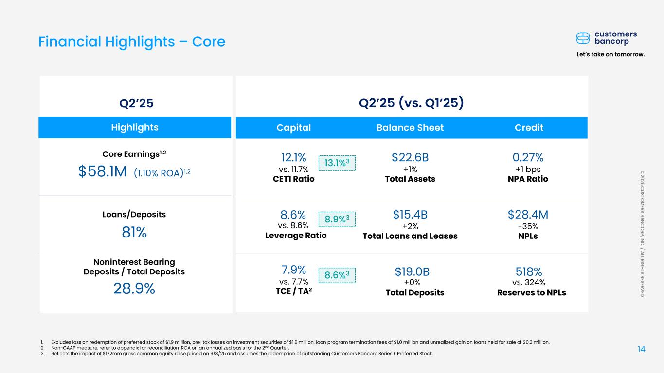 13 Let’s take on tomorrow. © 2025 C USTO M ERS BANC O RP, INC . / ALL RIG HTS RESERVED Q2’25 (vs. Q1’25) Capital Balance Sheet Credit 12.1% vs. 11.7% CET1 Ratio $22.6B +1% Total Assets 0.27% +1 bps NPA Ratio $15.4B +2% Total Loans and Leases $28.4M -35% NPLs 7.9% vs. 7.7% TCE / TA2 Highlights Q2’25 Total Deposits $19.0B +0% Reserves to NPLs 518% vs. 324%28.9% Noninterest Bearing Deposits / Total Deposits $55.8M (1.09% ROA) Earnings Loans/Deposits 81% Leverage Ratio 8.6% vs. 8.6% 1. Reflects the impact of $172mm gross common equity raise priced on 9/3/25 and assumes the redemption of outstanding Customers Bancorp Series F Preferred Stock. 2. Non-GAAP measure, refer to appendix for reconciliation, ROA on an annualized basis for the 2nd Quarter. Financial Highlights - GAAP 13.1%1 8.9%1 8.6%1