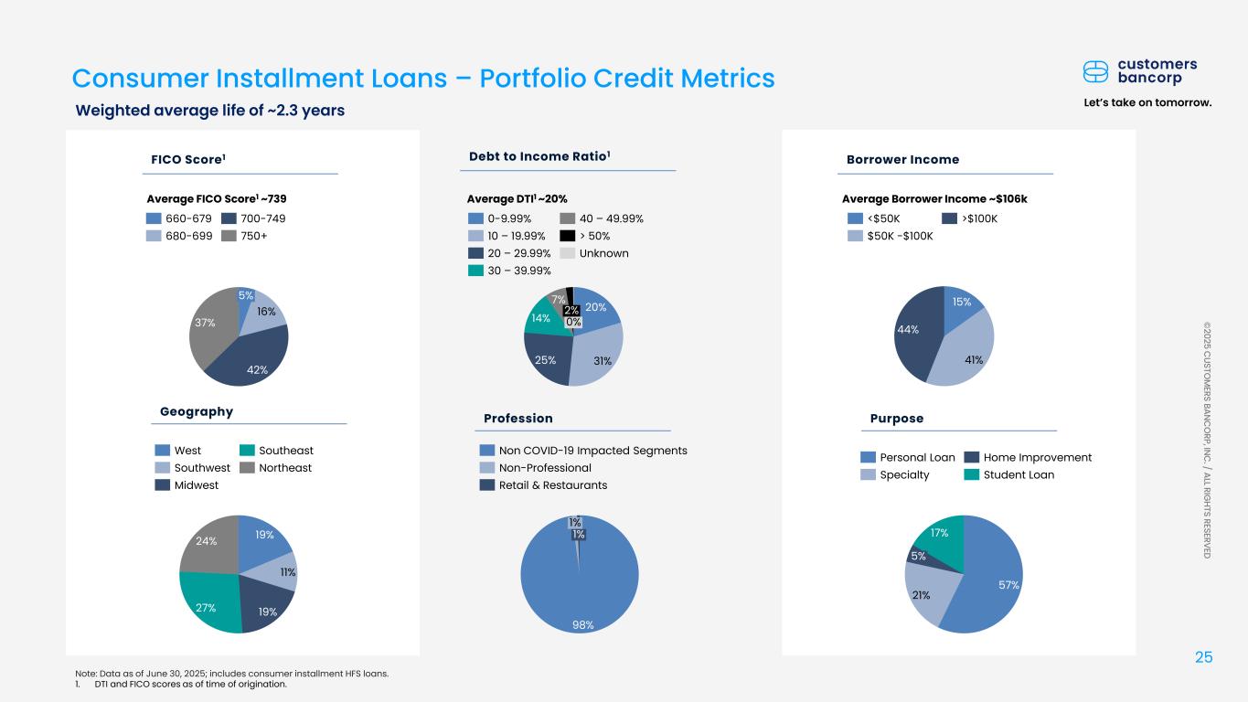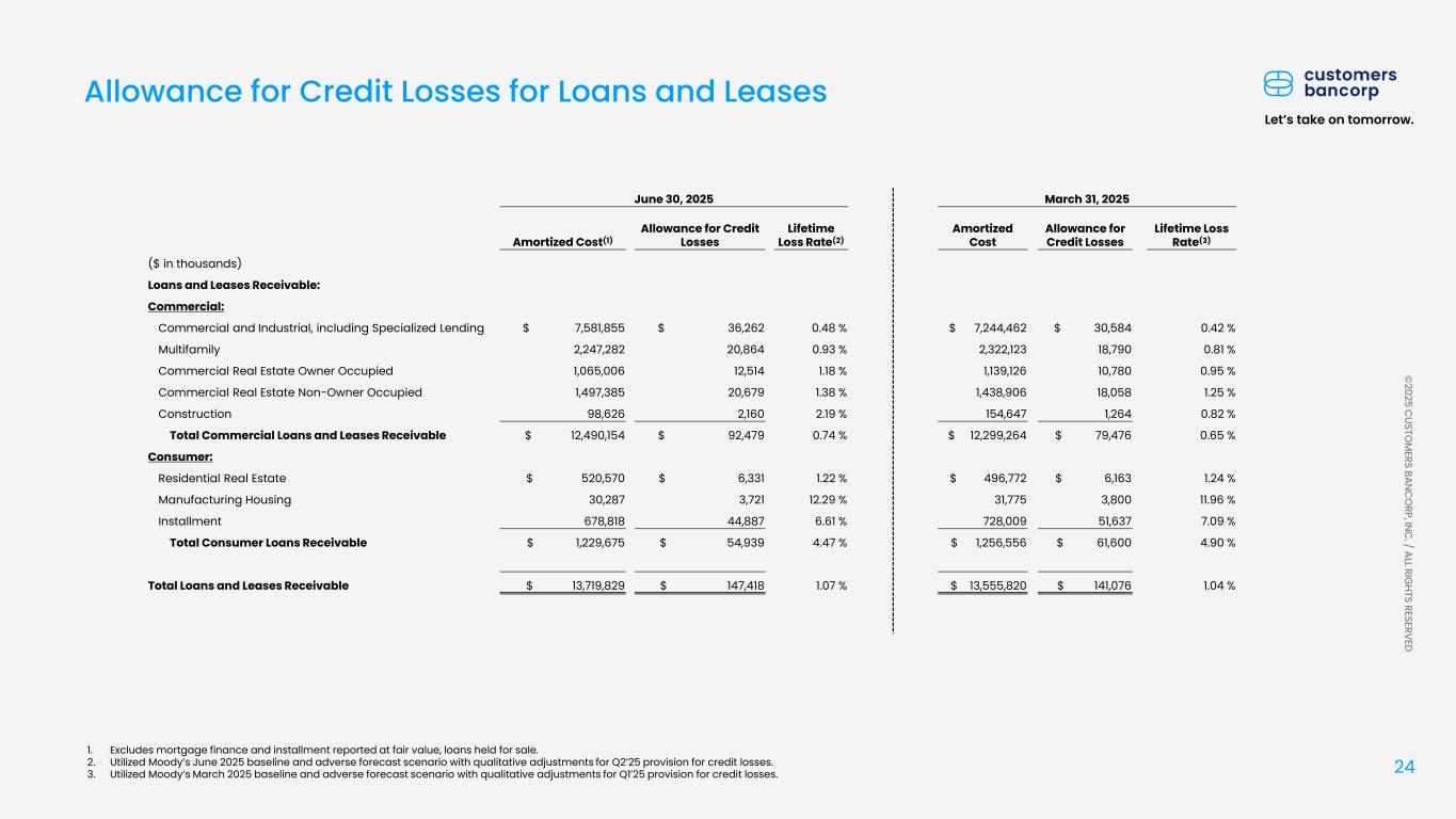 24 Let’s take on tomorrow. © 2025 C USTO M ERS BANC O RP, INC . / ALL RIG HTS RESERVED 1. Excludes mortgage finance and installment reported at fair value, loans held for sale. 2. Utilized Moody’s June 2025 baseline and adverse forecast scenario with qualitative adjustments for Q2’25 provision for credit losses. 3. Utilized Moody’s March 2025 baseline and adverse forecast scenario with qualitative adjustments for Q1’25 provision for credit losses. June 30, 2025 March 31, 2025 Amortized Cost(1) Allowance for Credit Losses Lifetime Loss Rate(2) Amortized Cost Allowance for Credit Losses Lifetime Loss Rate(3) ($ in thousands) Loans and Leases Receivable: Commercial: Commercial and Industrial, including Specialized Lending $ 7,581,855 $ 36,262 0.48 % $ 7,244,462 $ 30,584 0.42 % Multifamily 2,247,282 20,864 0.93 % 2,322,123 18,790 0.81 % Commercial Real Estate Owner Occupied 1,065,006 12,514 1.18 % 1,139,126 10,780 0.95 % Commercial Real Estate Non-Owner Occupied 1,497,385 20,679 1.38 % 1,438,906 18,058 1.25 % Construction 98,626 2,160 2.19 % 154,647 1,264 0.82 % Total Commercial Loans and Leases Receivable $ 12,490,154 $ 92,479 0.74 % $ 12,299,264 $ 79,476 0.65 % Consumer: Residential Real Estate $ 520,570 $ 6,331 1.22 % $ 496,772 $ 6,163 1.24 % Manufacturing Housing 30,287 3,721 12.29 % 31,775 3,800 11.96 % Installment 678,818 44,887 6.61 % 728,009 51,637 7.09 % Total Consumer Loans Receivable $ 1,229,675 $ 54,939 4.47 % $ 1,256,556 $ 61,600 4.90 % Total Loans and Leases Receivable $ 13,719,829 $ 147,418 1.07 % $ 13,555,820 $ 141,076 1.04 % Allowance for Credit Losses for Loans and Leases