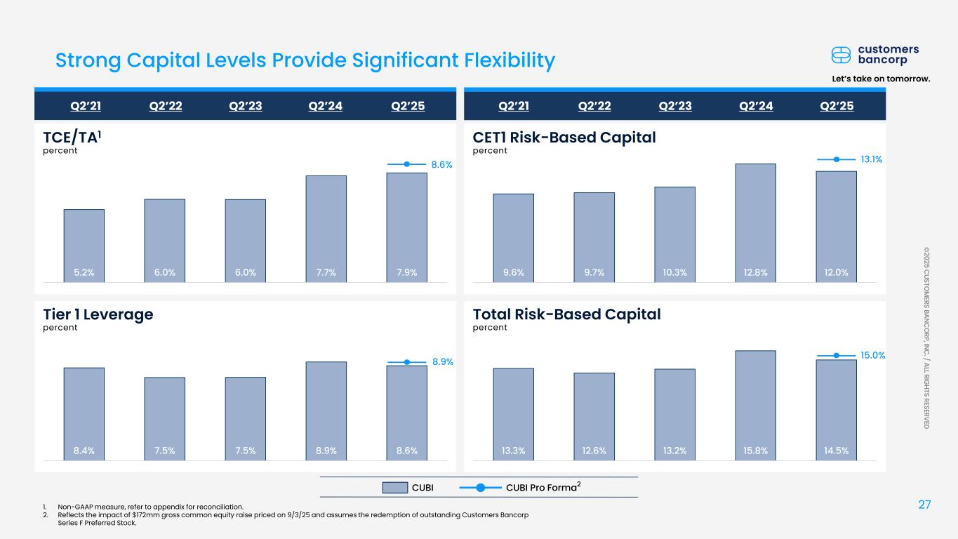 40 Let’s take on tomorrow. © 2025 C USTO M ERS BANC O RP, INC . / ALL RIG HTS RESERVED Reconciliation of Non-GAAP Measures – Unaudited (Contd.) Tangible Common Equity to Tangible Assets - Customers Bancorp (dollars in thousands except per share data) Q2 2025 Q2 2024 Q2 2023 Q2 2022 Q2 2021 GAAP total shareholders' equity $ 1,863,558 $ 1,746,865 $ 1,456,652 $ 1,353,390 $ 1,250,729 Reconciling items: Preferred stock (82,201) (137,794) (137,794) (137,794) (217,471) Goodwill and other intangibles (3,629) (3,629) (3,629) (3,629) (3,853) Tangible common equity $ 1,777,728 $ 1,605,442 $ 1,315,229 $ 1,211,967 $ 1,029,405 GAAP Total assets $ 22,550,800 $ 20,942,975 $ 22,028,565 $ 20,251,996 $ 19,635,108 Reconciling items: Goodwill and other intangibles (3,629) (3,629) (3,629) (3,629) (3,853) Tangible assets $ 22,547,171 $ 20,939,346 $ 22,024,936 $ 20,248,367 $ 19,631,255 Tangible common equity to tangible assets 7.9 % 7.7 % 6.0 % 6.0 % 5.2 %