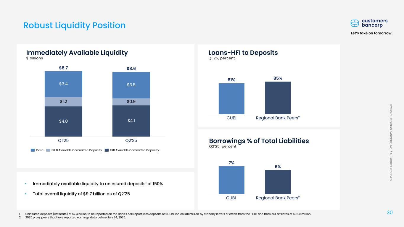 30 Let’s take on tomorrow. © 2025 C USTO M ERS BANC O RP, INC . / ALL RIG HTS RESERVED Immediately Available Liquidity $ billions $3.4 $1.2 $4.0 Q1’25 $3.5 $0.9 $4.1 Q2’25 $8.7 $8.6 Cash FHLB Available Committed Capacity FRB Available Committed Capacity 1. Uninsured deposits (estimate) of $7.4 billion to be reported on the Bank’s call report, less deposits of $1.6 billion collateralized by standby letters of credit from the FHLB and from our affiliates of $116.0 million. 2. 2025 proxy peers that have reported earnings data before July 24, 2025. • Immediately available liquidity to uninsured deposits1 of 150% • Total overall liquidity of $9.7 billion as of Q2’25 Loans-HFI to Deposits Q1’25, percent CUBI Regional Bank Peers2 81% 85% Borrowings % of Total Liabilities Q2’25, percent CUBI Regional Bank Peers2 7% 6% Robust Liquidity Position