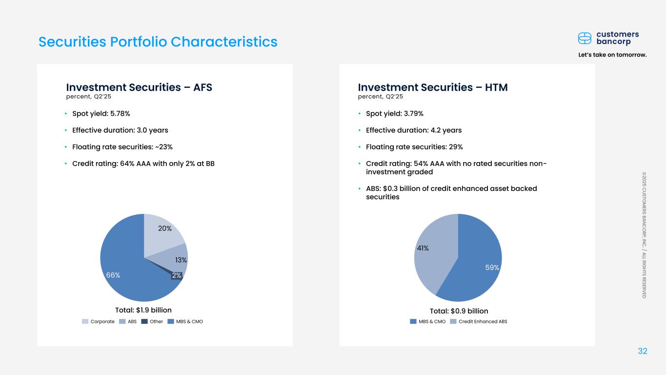 31 Let’s take on tomorrow. © 2025 C USTO M ERS BANC O RP, INC . / ALL RIG HTS RESERVED 1. Includes CLOs. Liquidity Sources ($000's) 2Q 25 1Q 25 QoQ Change Cash and Cash Equivalents $3,503,511 $3,428,691 $74,821 FHLB Available Borrowing Capacity $919,835 $1,235,992 ($316,157) FRB Available Borrowing Capacity $4,134,678 $3,986,593 $148,085 Investments (MV AFS + HTM) Agency & Non-Agency MBS & CMO $1,741,455 $1,714,380 $27,075 Corporates $366,207 $482,361 ($116,153) ABS1 $592,030 $765,858 ($173,828) Other AFS $30,840 $33,118 ($2,278) Less: Pledged Securities HTM & AFS ($1,615,219) ($1,673,361) $58,142 Net Unpledged Securities $1,115,313 $1,322,355 ($207,042) $9,673,337 $9,973,631 ($300,294) Ample Sources of Liquidity