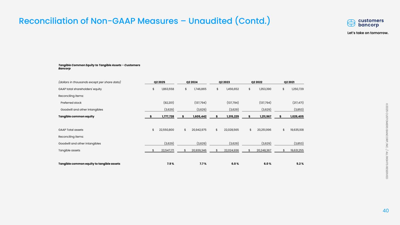 39 Let’s take on tomorrow. © 2025 C USTO M ERS BANC O RP, INC . / ALL RIG HTS RESERVED Reconciliation of Non-GAAP Measures – Unaudited (Contd.) 1. Core efficiency ratio calculated as non-interest expense divided by core revenue. 2. Adjusted core efficiency ratio calculated as adjusted core non-interest expense divided by core revenue. Core Efficiency Ratio and Adjusted Core Efficiency Ratio - Customers Bancorp Six Months Ended June 30, (dollars in thousands except per share data) Q2 2025 Q1 2025 Q4 2024 Q3 2024 Q2 2024 2025 2024 GAAP net interest income $ 176,703 $ 167,446 $ 167,821 $ 158,545 $ 167,653 $ 344,149 $ 328,038 GAAP non-interest income (loss) $ 29,606 $ (24,490) $ (391) $ 8,557 $ 31,037 $ 5,116 $ 52,268 (Gains) losses on investment securities 1,797 (160) 26,678 (394) 744 1,637 819 Derivative credit valuation adjustment — 270 (407) 226 (58) 270 164 Unrealized (gain) on equity method investments — — (389) — (11,041) — (11,041) Unrealized (gain) loss on loans held for sale (289) 667 147 607 — 378 — Impairment loss on debt securities — 51,319 — — — 51,319 — Loan program termination fees (1,000) — — — — (1,000) — Core non-interest income 30,114 27,606 25,638 8,996 20,682 57,720 42,210 Core revenue $ 206,817 $ 195,052 $ 193,459 $ 167,541 $ 188,335 $ 401,869 $ 370,248 GAAP non-interest expense $ 106,626 $ 102,771 $ 110,375 $ 104,018 $ 103,452 $ 209,397 $ 202,621 Severance expense — — (1,595) (659) (2,560) — (2,560) FDIC special assessment — — — — (183) — (683) Legal settlement — — (209) — — — — Core non-interest expense $ 106,626 $ 102,771 $ 108,571 $ 103,359 $ 100,709 $ 209,397 $ 199,378 One-time non-interest expense items recorded in 2024: Deposit servicing fees prior to 2024 — — — — — — (7,106) FDIC premiums prior to 2024 — — — — — — (4,208) Non-income taxes prior to 2024 — — — 2,997 — — — Total one-time non-interest expense items — — — 2,997 — — (11,314) Adjusted core non-interest expense $ 106,626 $ 102,771 $ 108,571 $ 106,356 $ 100,709 $ 209,397 $ 188,064 Core efficiency ratio (1) 51.56 % 52.69 % 56.12 % 61.69 % 53.47 % 52.11 % 53.85 % Adjusted core efficiency ratio (adjusted for one-time non-interest expense items) (2) 51.56 % 52.69 % 56.12 % 63.48 % 53.47 % 52.11 % 50.79 %
