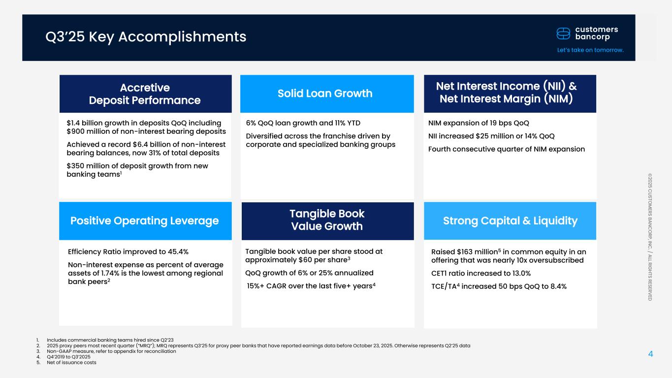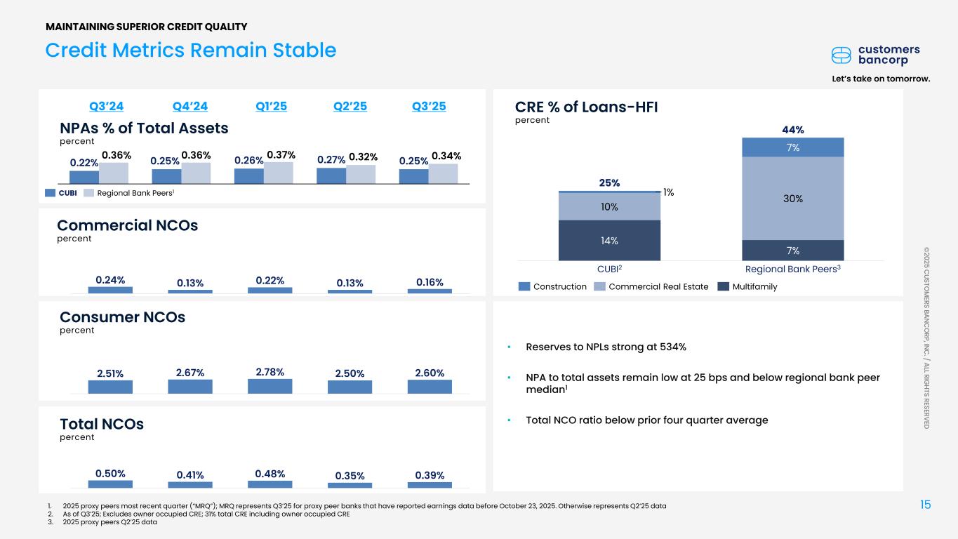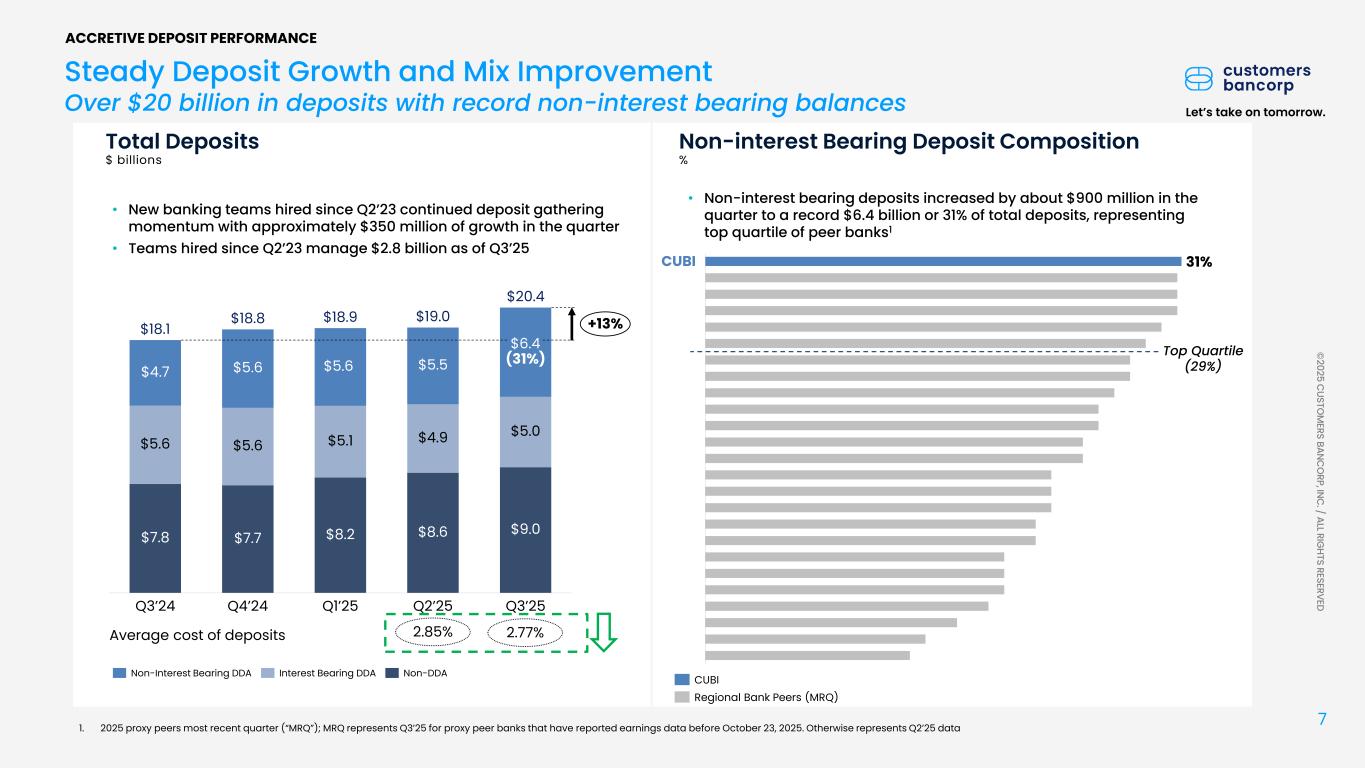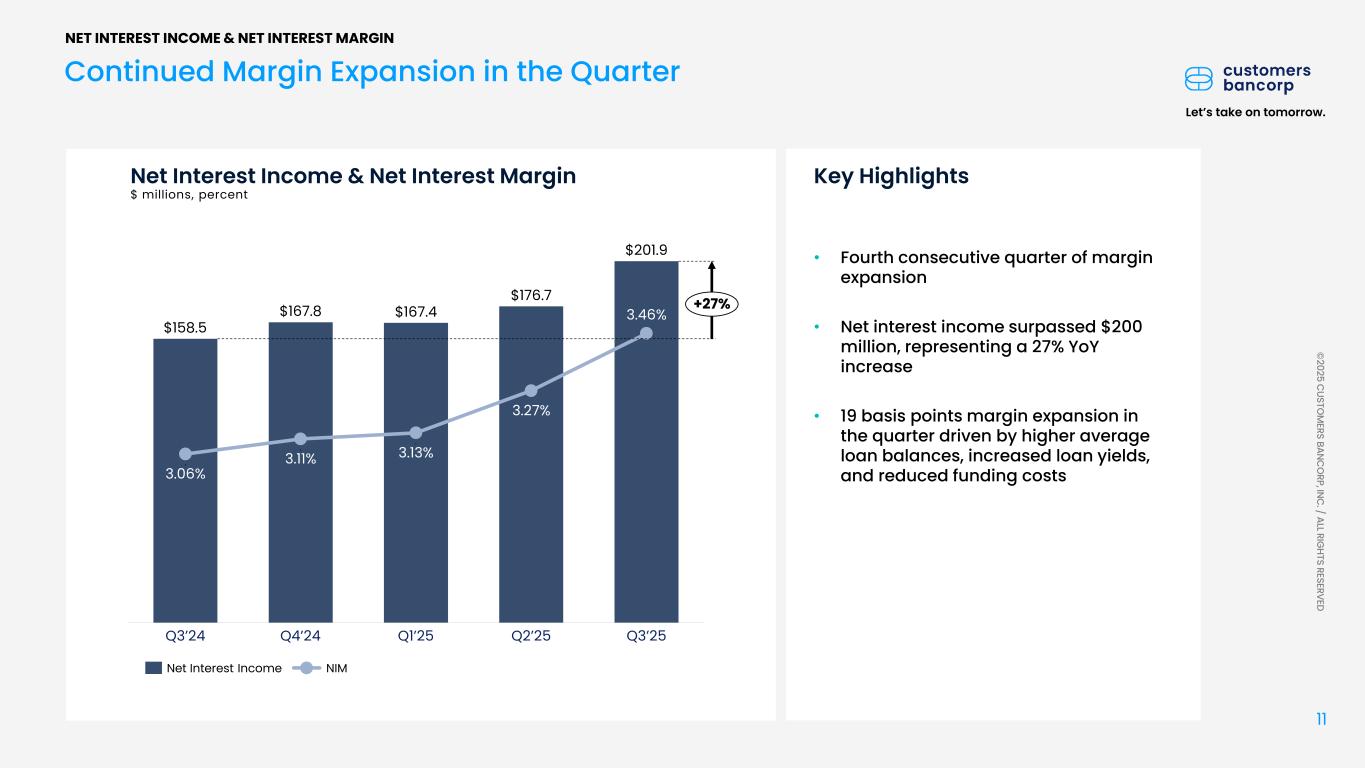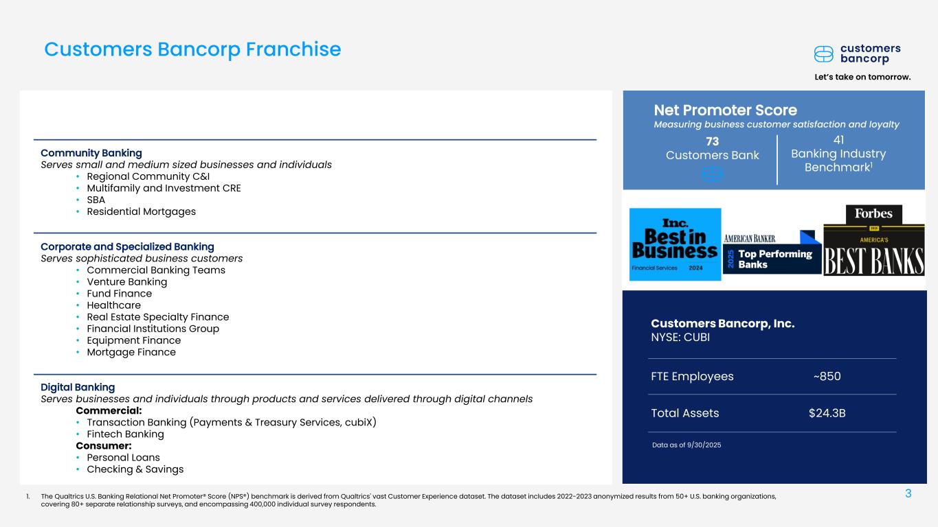 ペンシルベニア州ウェストレディング、2025年10月23日 - 「戦略的優先事項の継続的な実行を示すとともに、フランチャイズ価値の拡大における成功を強調する第3四半期決算に満足しています」と、カスタマーズ・バンコープのジェイ・シドゥ会長兼CEOは語った。