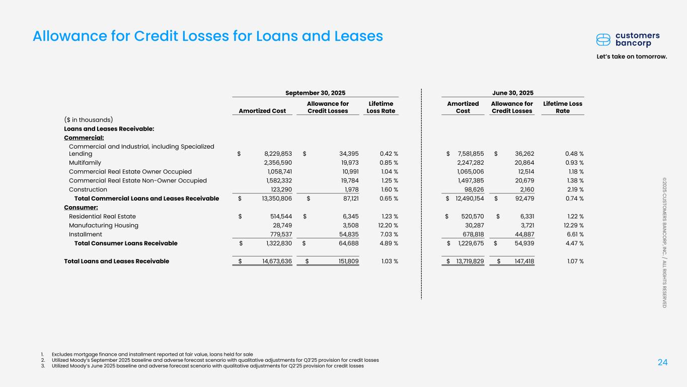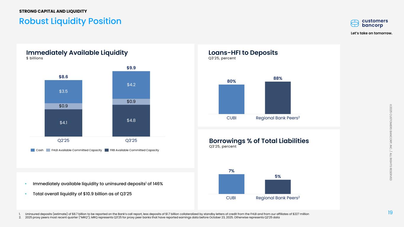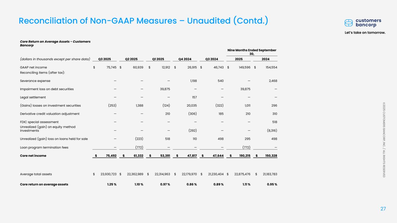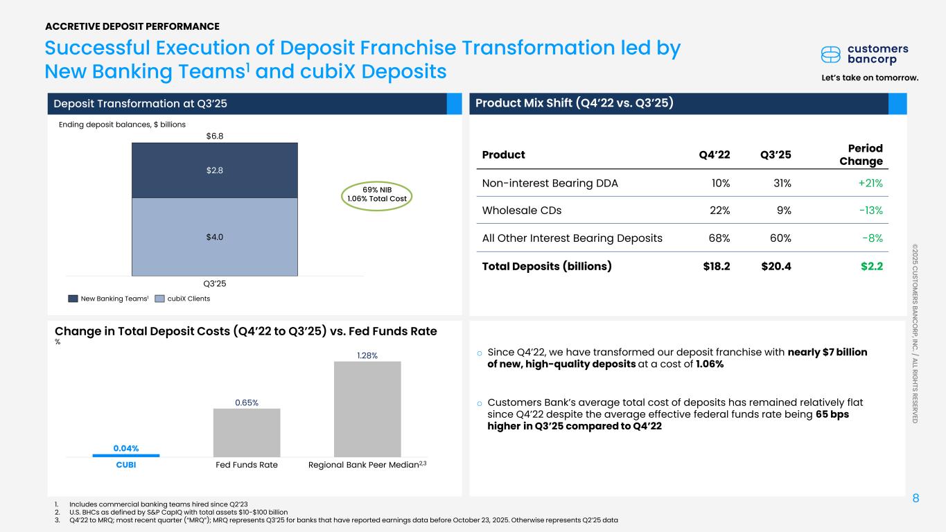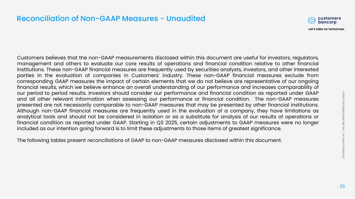 ペンシルベニア州ウェストレディング、2025年10月23日 - 「戦略的優先事項の継続的な実行を示すとともに、フランチャイズ価値の拡大における成功を強調する第3四半期決算に満足しています」と、カスタマーズ・バンコープのジェイ・シドゥ会長兼CEOは語った。