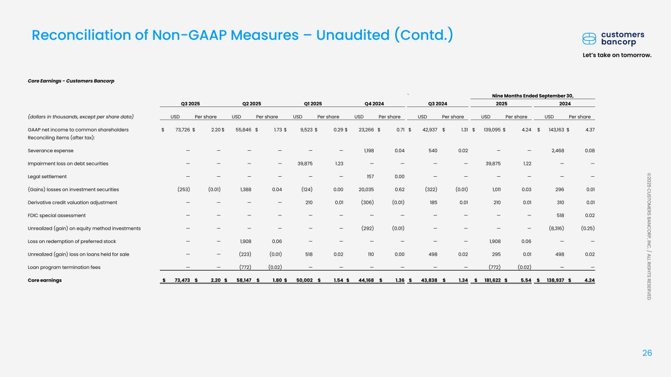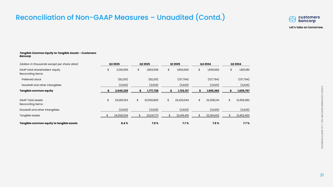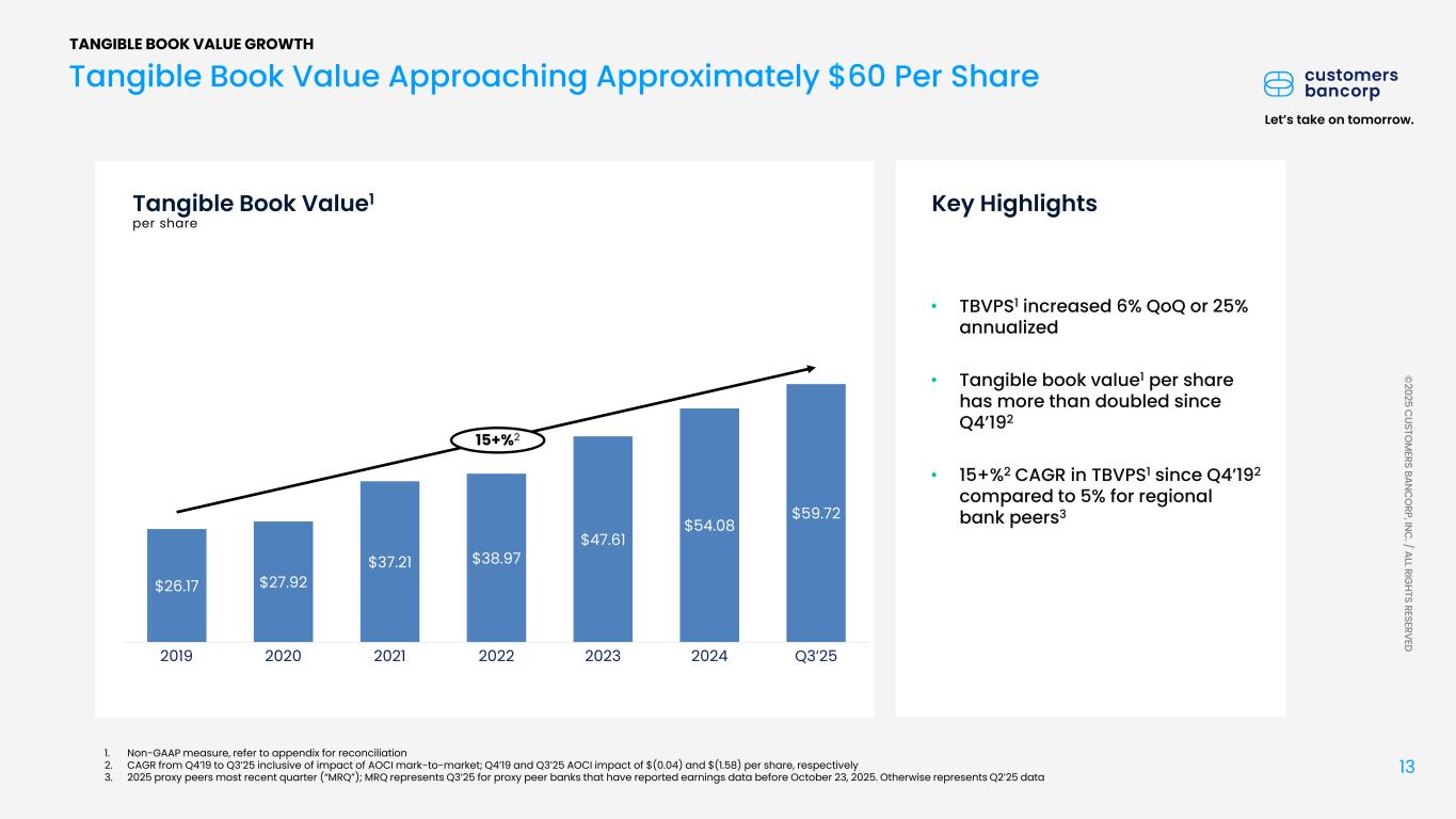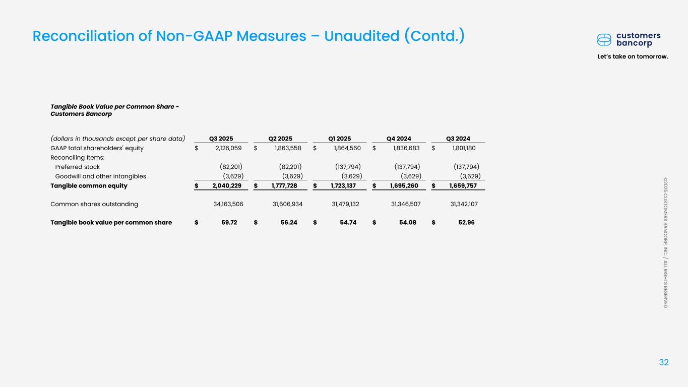 2025年9月30日現在のカスタマーズ・バンコープの普通株式は前年同期比2億6,300万ドル増の20億ド ル、有形普通株式*は前年同期比2億6,300万ドル増の20億ドルとなり、これは主に7,400万ドルの利益と、2025年9月5日に 68.50ドル(発行費用控除前)で251万8,248株を発行したことによるものです。これは主に、1億6,200万ドルの利益、251万8,248株の発行、および主に投資有価証券の未実現損 失の減少による5500万ドル(税引き後)のその他の包括利益(AOCI)の減少によるものですが、普通株式の買戻し700万ド ルにより一部相殺されました。2025年9月30日、2025年6月30日および2024年9月30日現在の普通株式1株当たり簿価は56.36ドルおよび53.07ドルから59.83ドルに、普通株式1株当たり有形簿価*は56.24ドルおよび52.96ドルから59.72ドルにそれぞれ増加した。