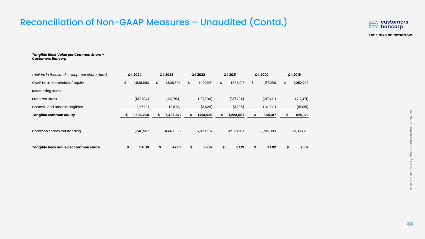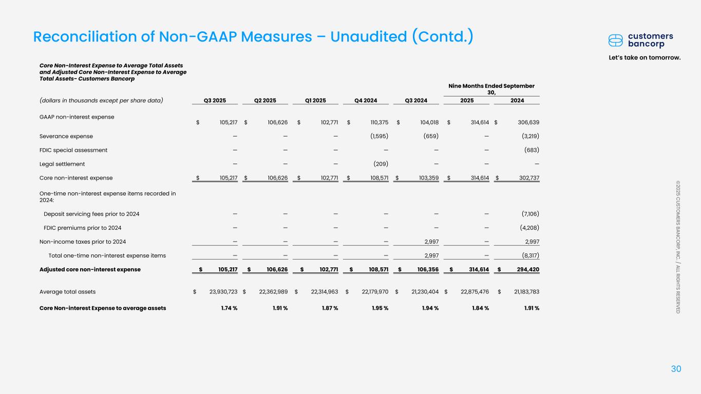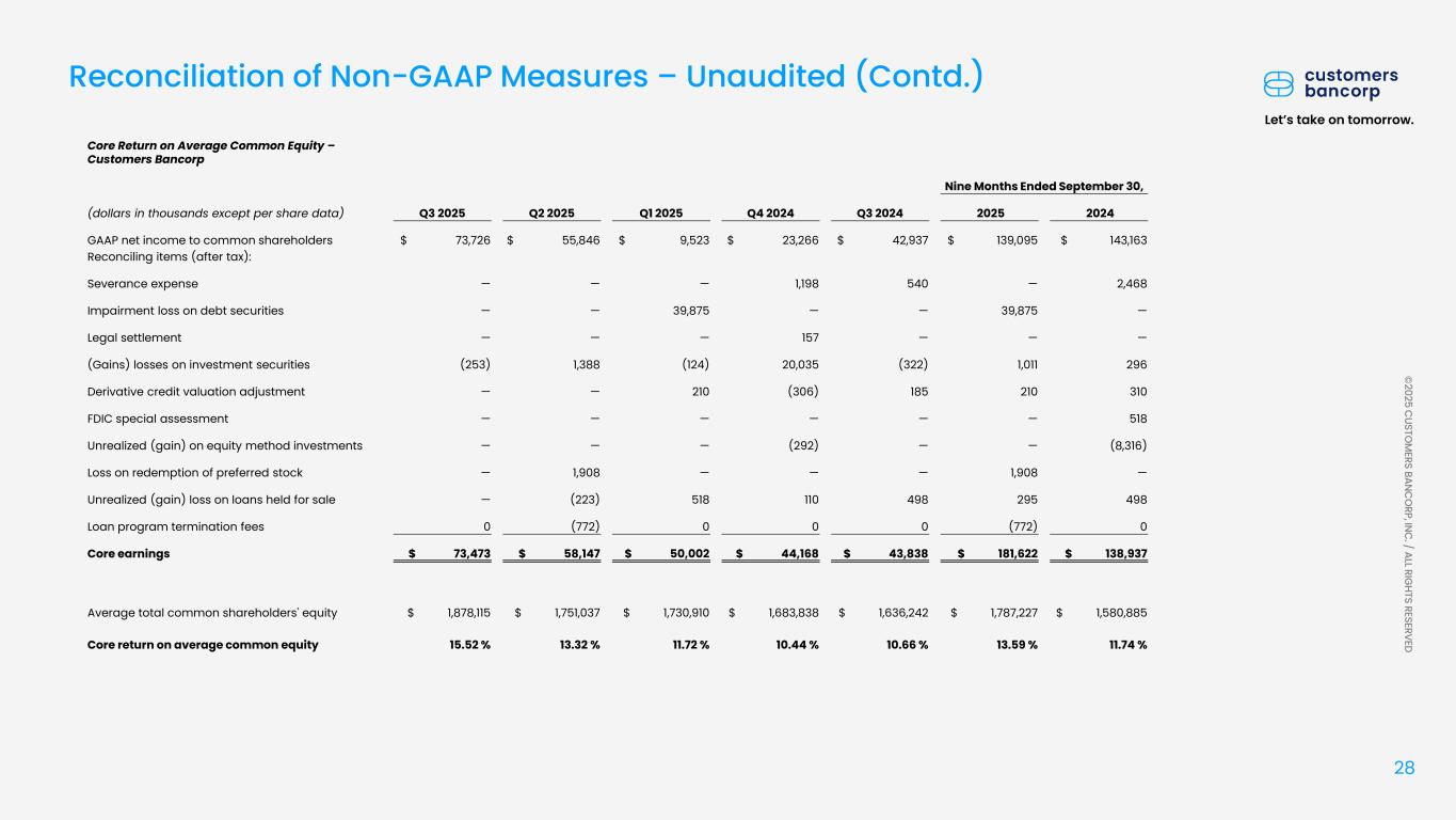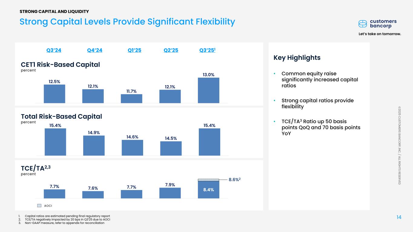 2025年9月30日現在のカスタマーズ・バンコープの普通株式は前年同期比2億6,300万ドル増の20億ド ル、有形普通株式*は前年同期比2億6,300万ドル増の20億ドルとなり、これは主に7,400万ドルの利益と、2025年9月5日に 68.50ドル(発行費用控除前)で251万8,248株を発行したことによるものです。これは主に、1億6,200万ドルの利益、251万8,248株の発行、および主に投資有価証券の未実現損 失の減少による5500万ドル(税引き後)のその他の包括利益(AOCI)の減少によるものですが、普通株式の買戻し700万ド ルにより一部相殺されました。2025年9月30日、2025年6月30日および2024年9月30日現在の普通株式1株当たり簿価は56.36ドルおよび53.07ドルから59.83ドルに、普通株式1株当たり有形簿価*は56.24ドルおよび52.96ドルから59.72ドルにそれぞれ増加した。