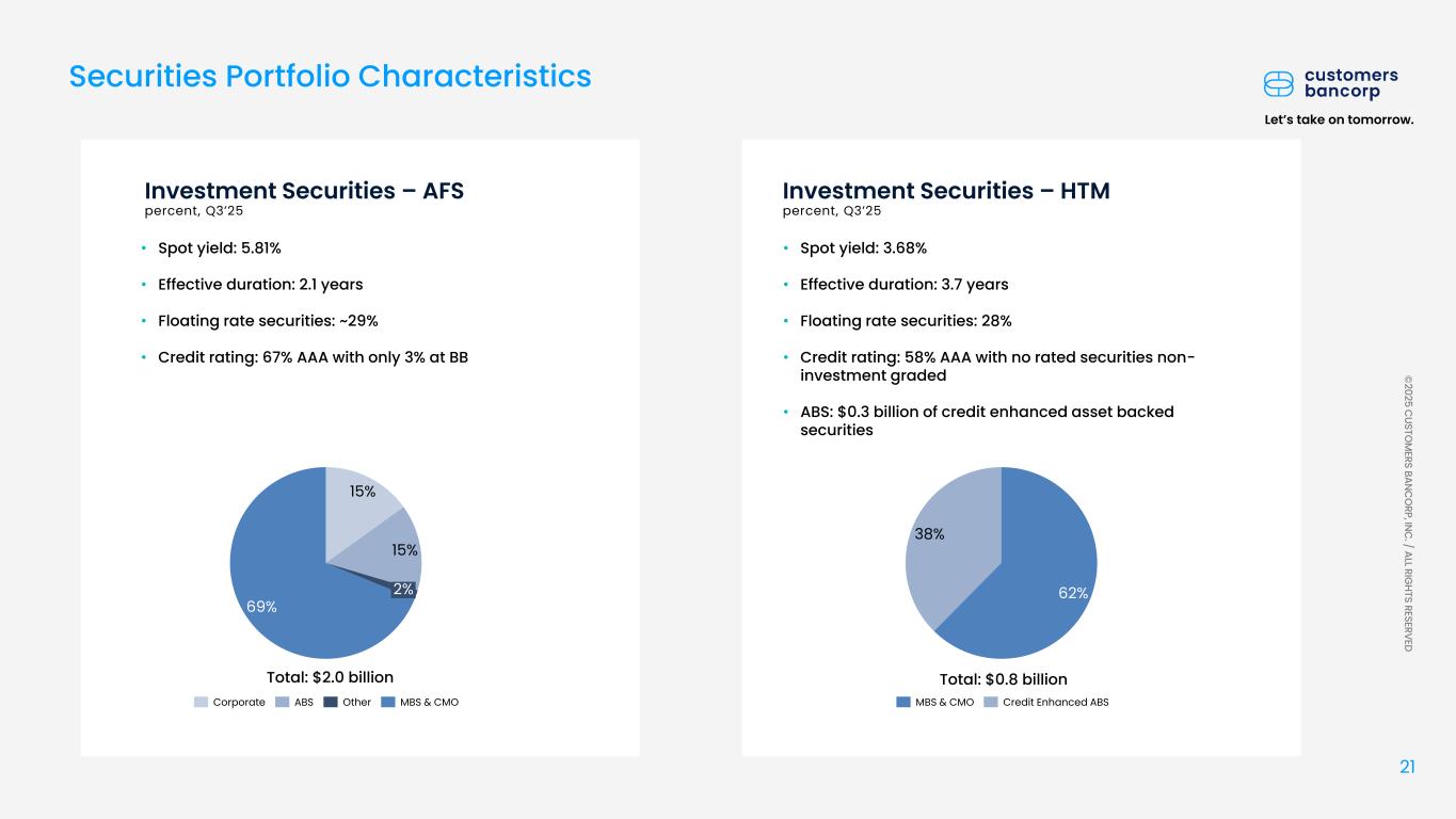 2025年9月30日現在、HTM債券ポートフォリオは総資産の3.3%に過ぎず、スポット利回りは3.68%、実質デュレーションは約3.7年であった。さらに、2025年9月30日現在、HTM債の約58%はAAA格で、3億ドルは信用補完された資産担保証券であり、信用損失は現在予想されていない。