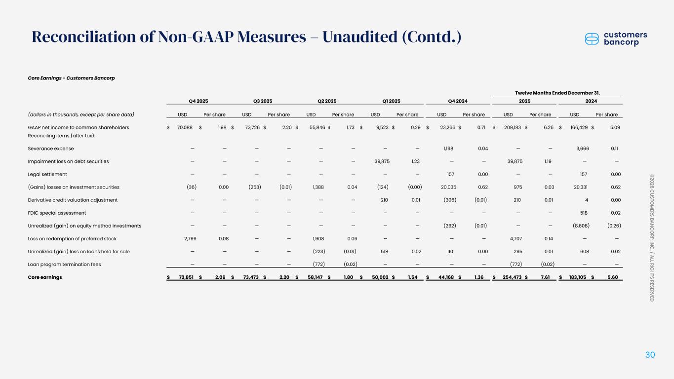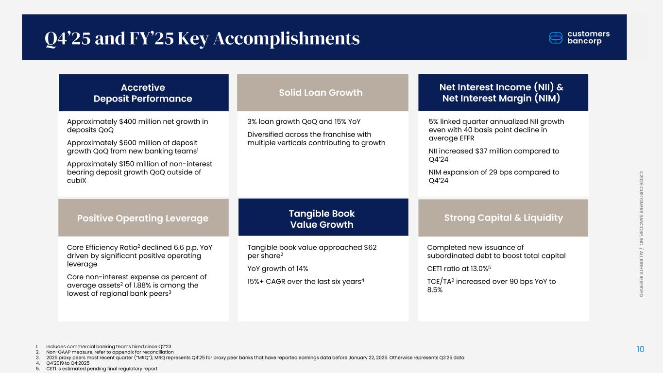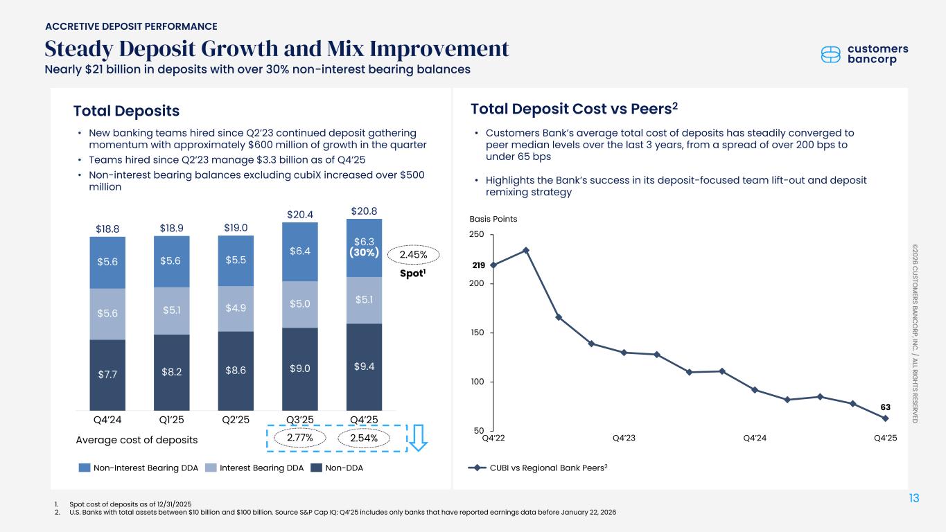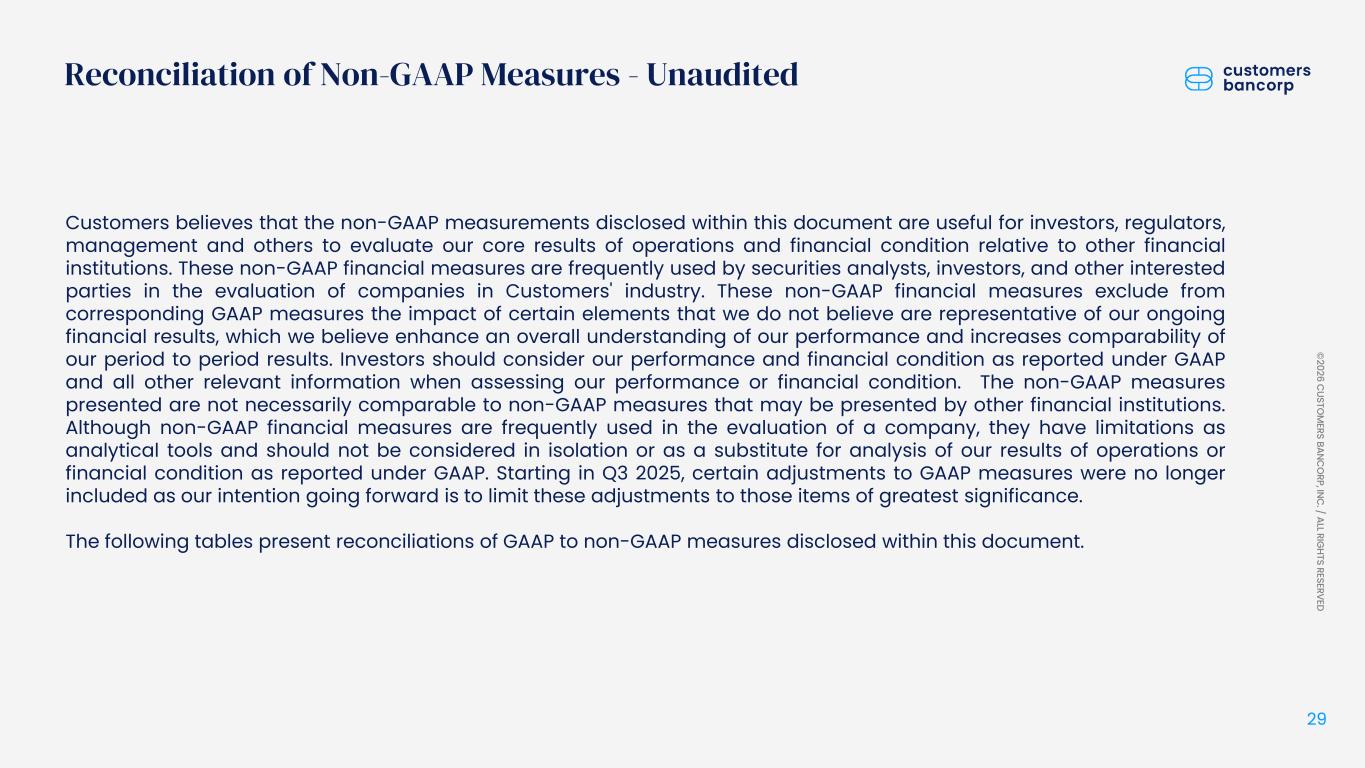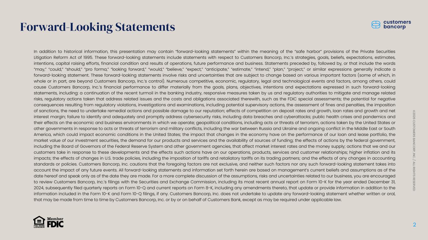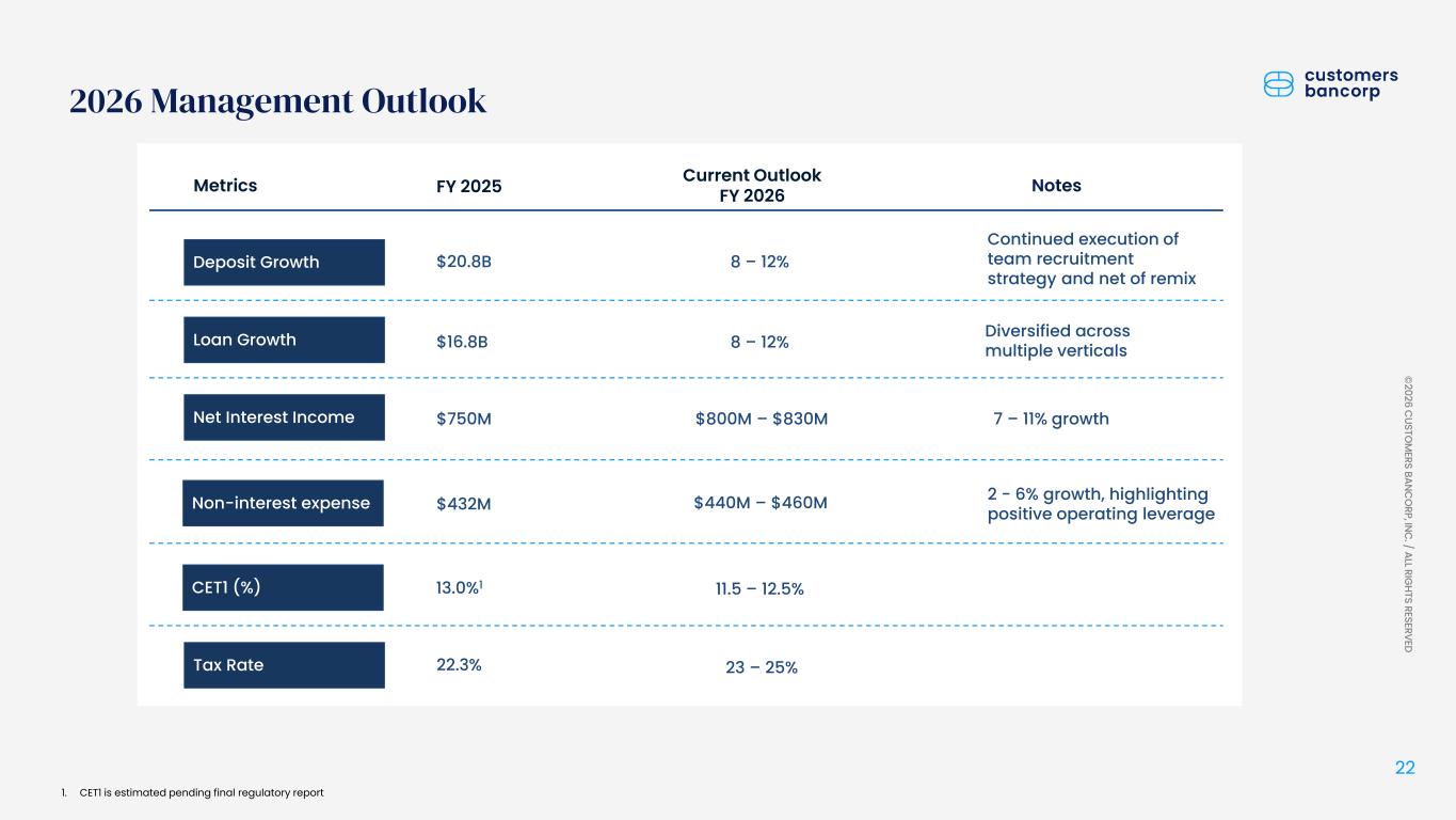 ペンシルベニア州ウェストレディング、2026年1月22日 - カスタマーズ・バンクコープのジェイ・シドゥ執行会長は次のように述べた。「第4四半期および通期の業績は、当社が戦略的優先事項を継続的に実行していることを示し、フランチャイズ価値の成長における成功を裏付けるものであり、満足している」