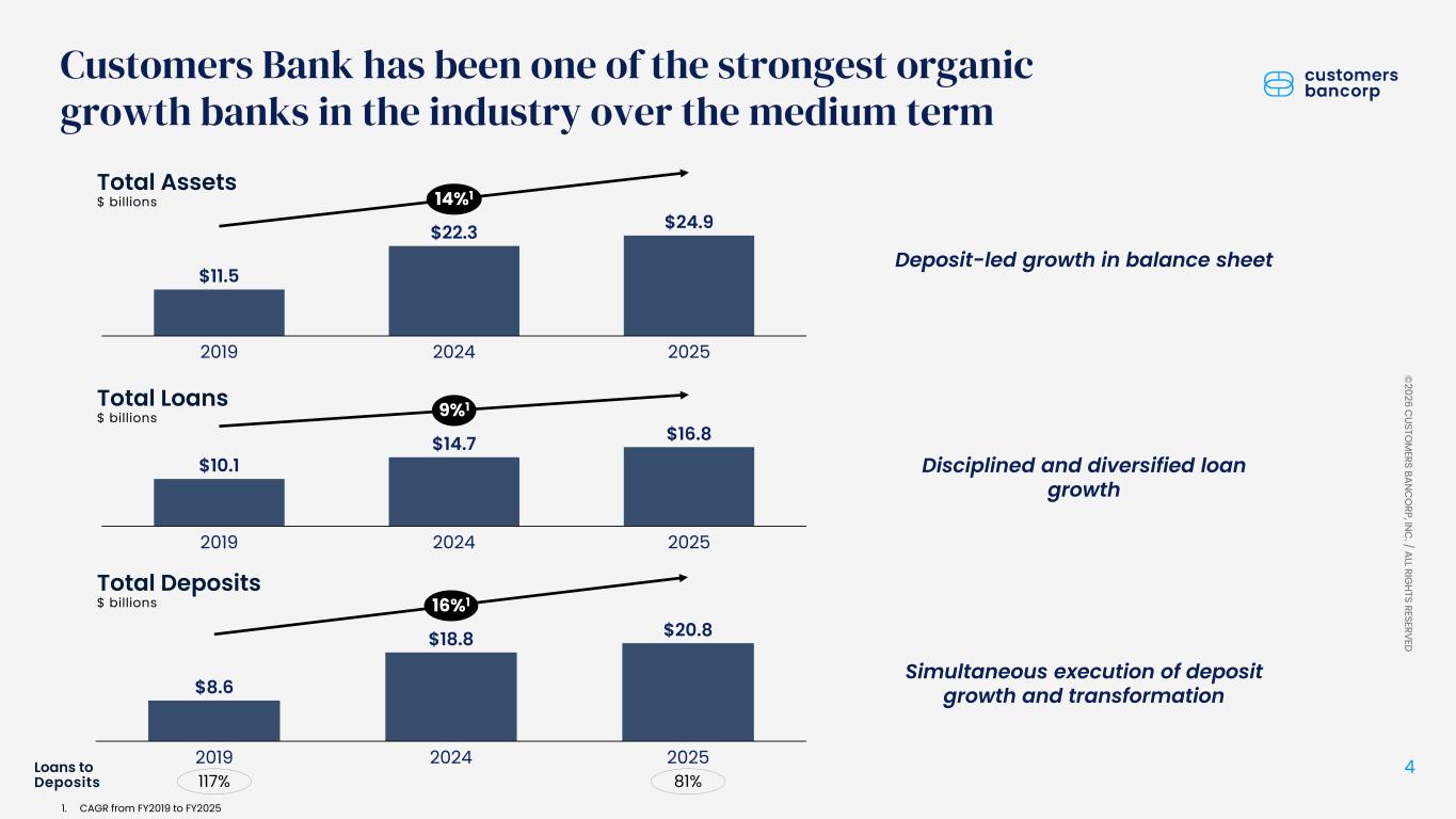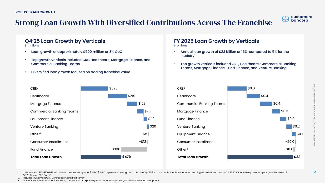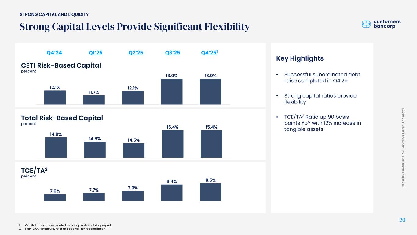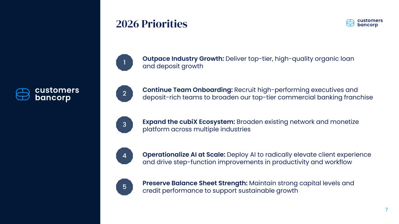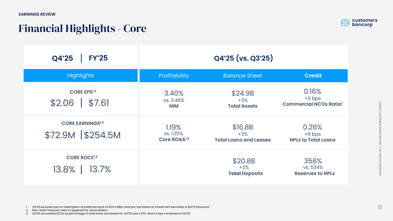 ペンシルベニア州ウェストレディング、2026年1月22日 - カスタマーズ・バンクコープのジェイ・シドゥ執行会長は次のように述べた。「第4四半期および通期の業績は、当社が戦略的優先事項を継続的に実行していることを示し、フランチャイズ価値の成長における成功を裏付けるものであり、満足している」