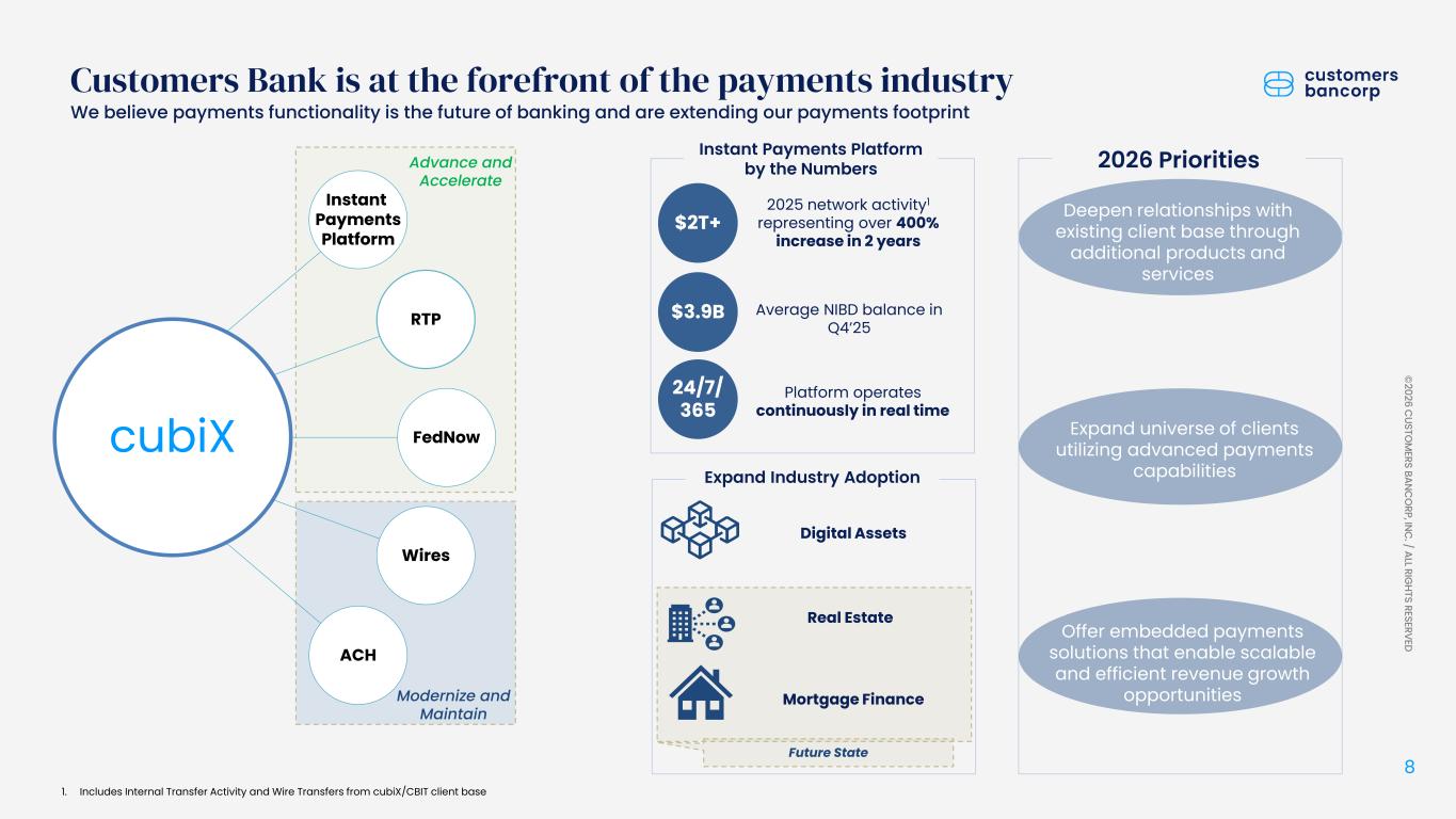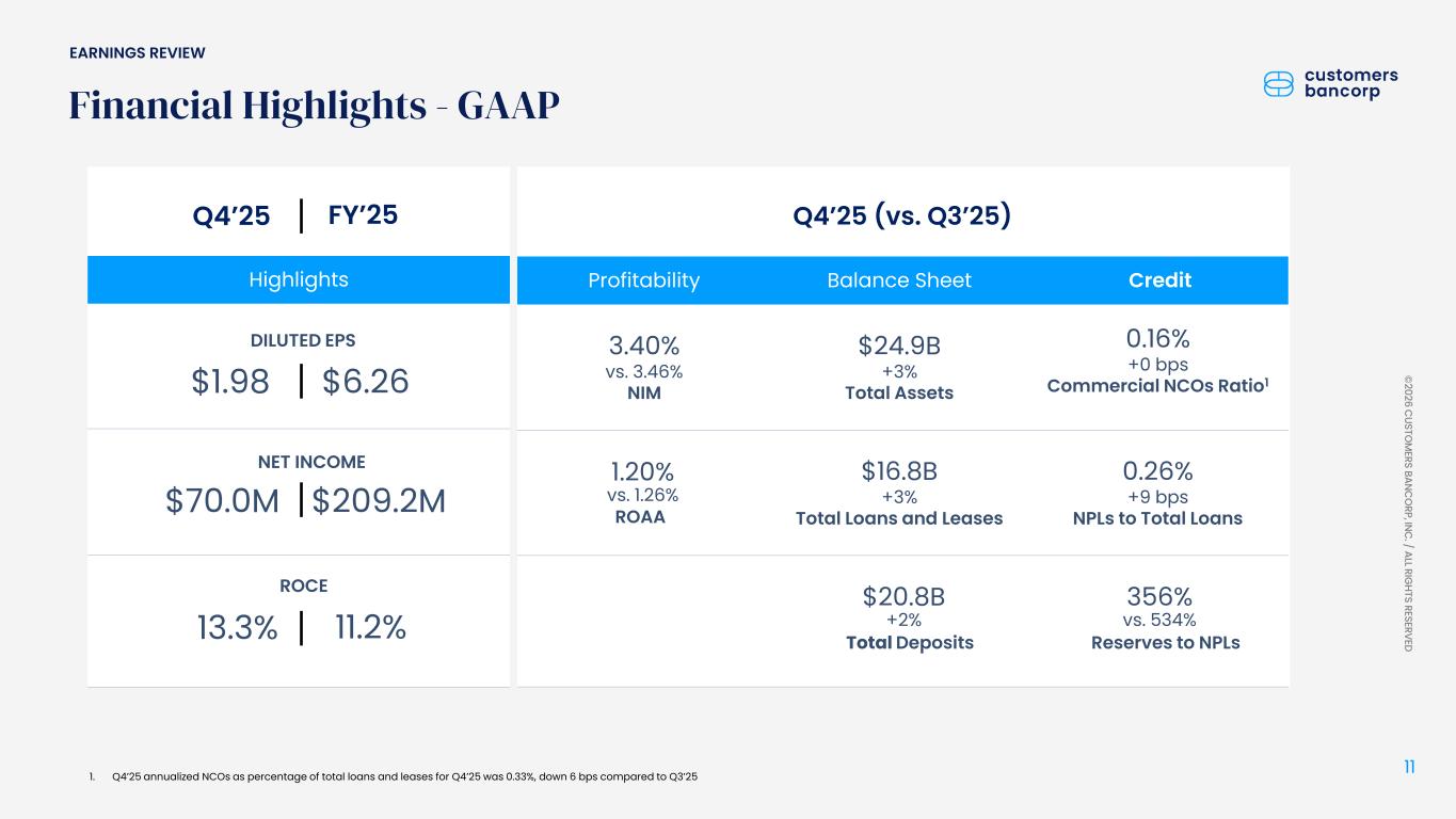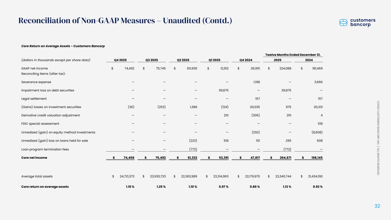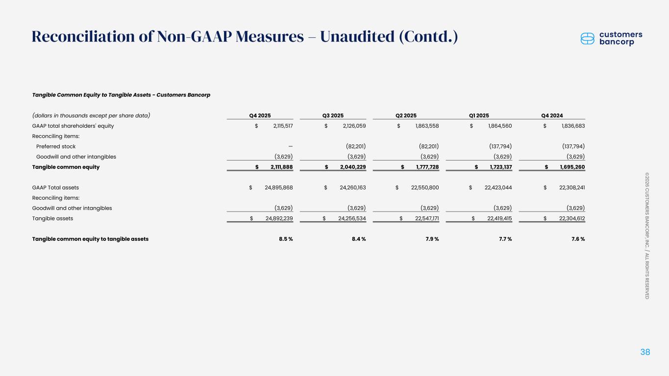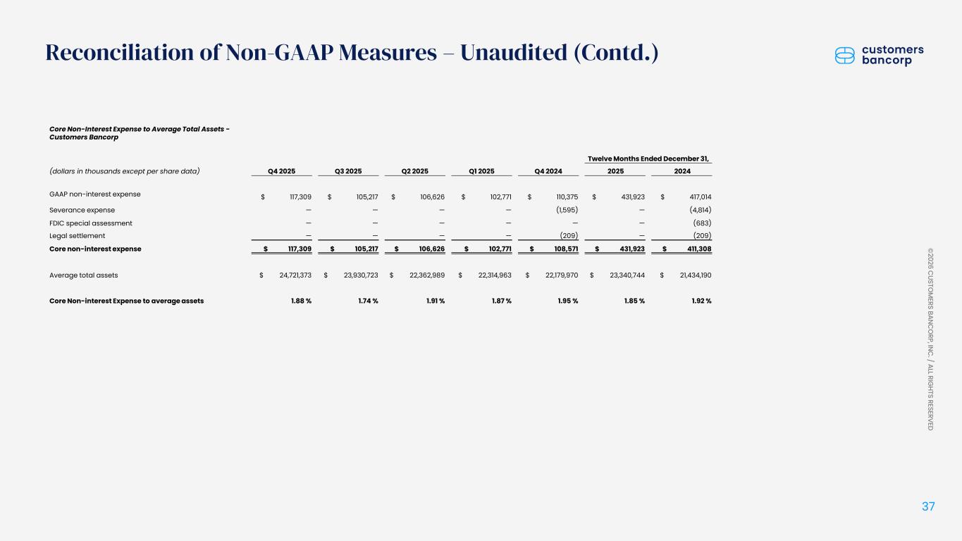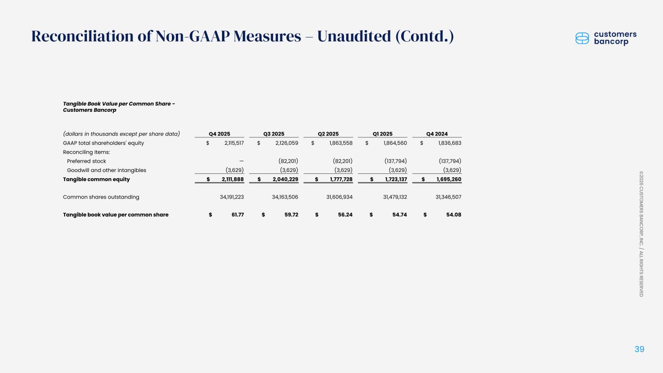 ペンシルベニア州ウェストレディング、2026年1月22日 - カスタマーズ・バンクコープのジェイ・シドゥ執行会長は次のように述べた。「第4四半期および通期の業績は、当社が戦略的優先事項を継続的に実行していることを示し、フランチャイズ価値の成長における成功を裏付けるものであり、満足している」