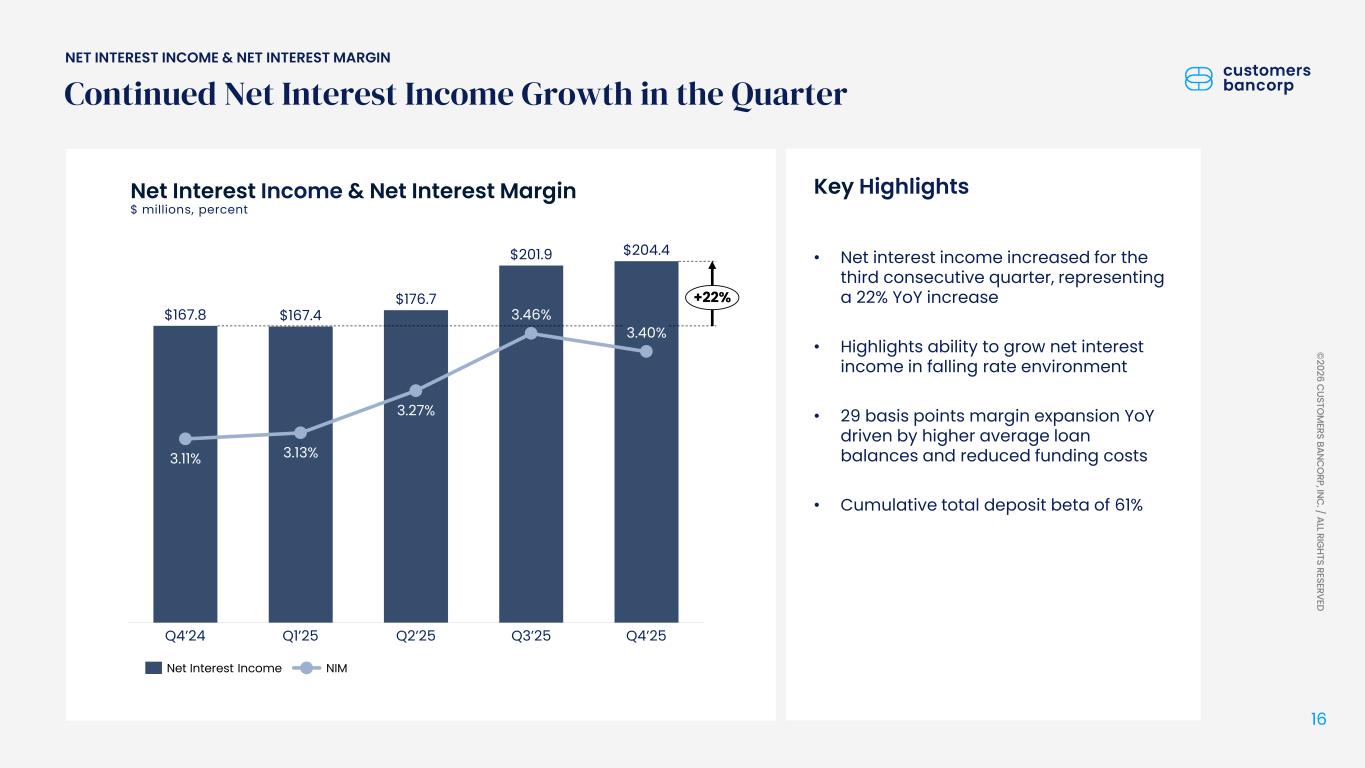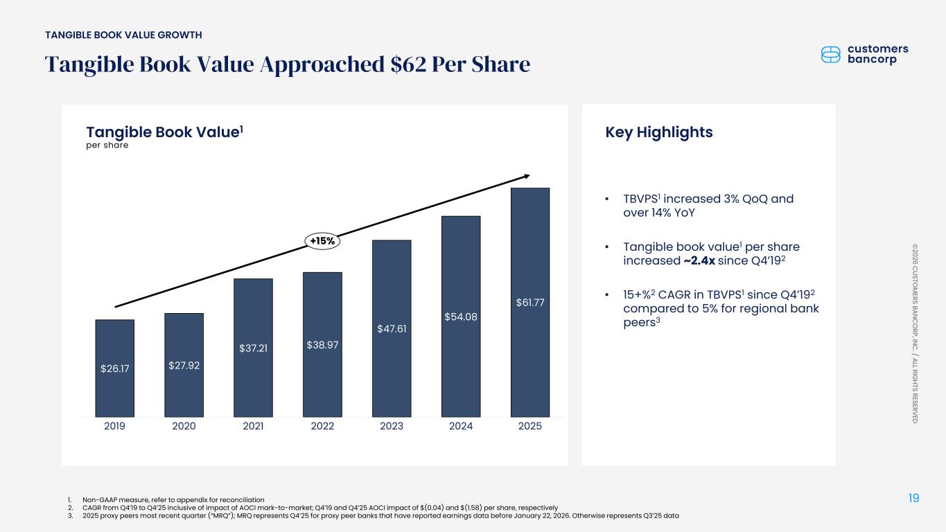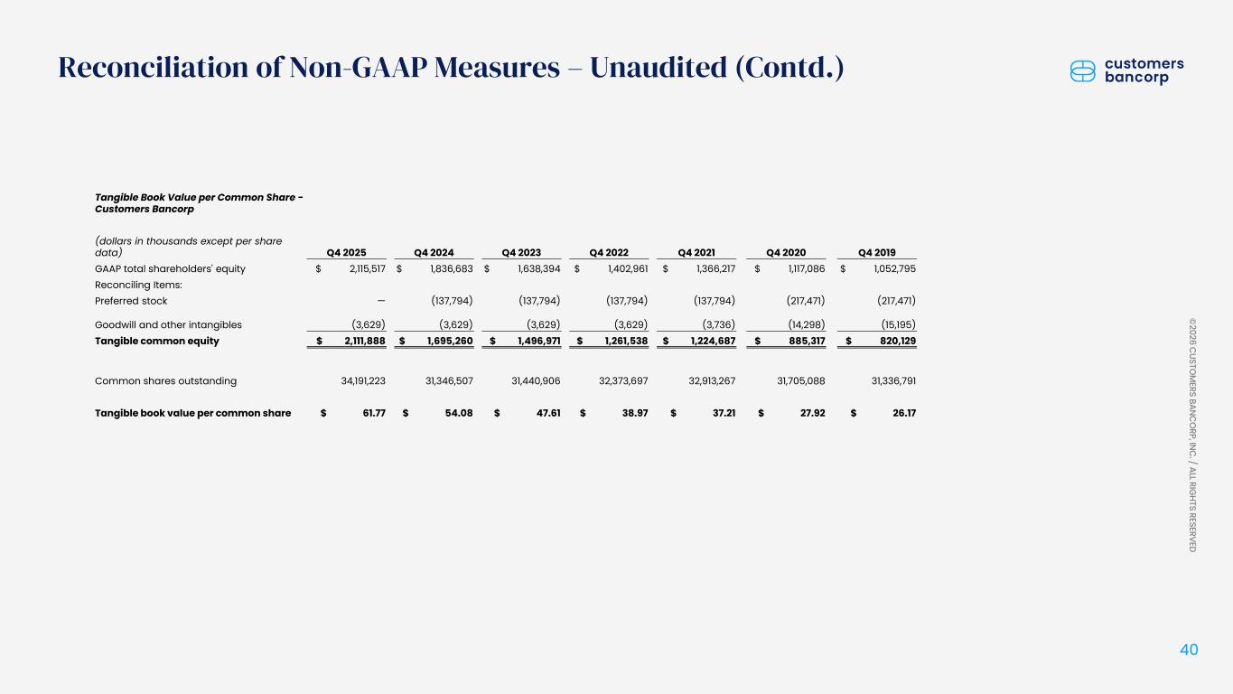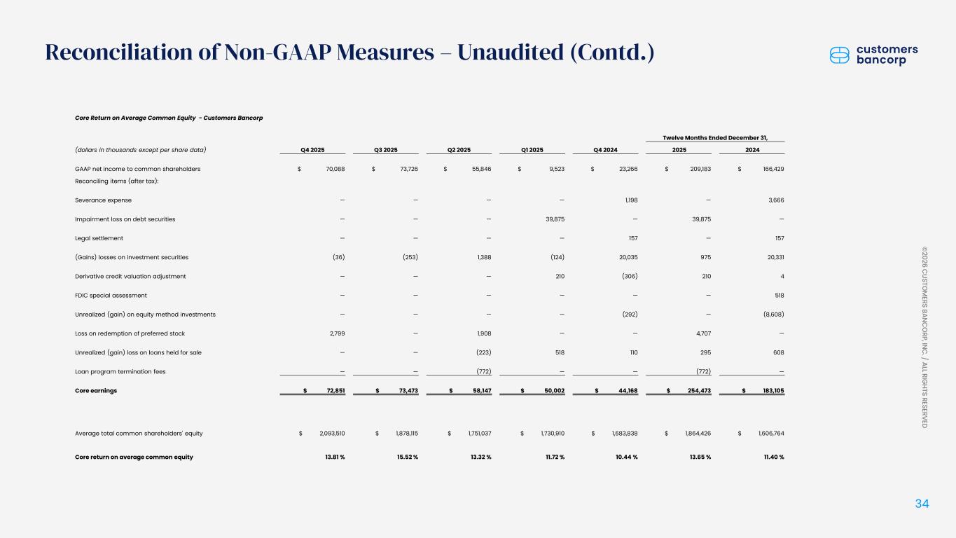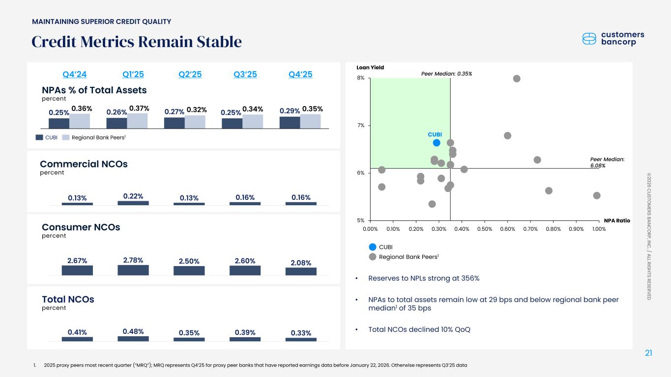 ペンシルベニア州ウェストレディング、2026年1月22日 - カスタマーズ・バンクコープのジェイ・シドゥ執行会長は次のように述べた。「第4四半期および通期の業績は、当社が戦略的優先事項を継続的に実行していることを示し、フランチャイズ価値の成長における成功を裏付けるものであり、満足している」
