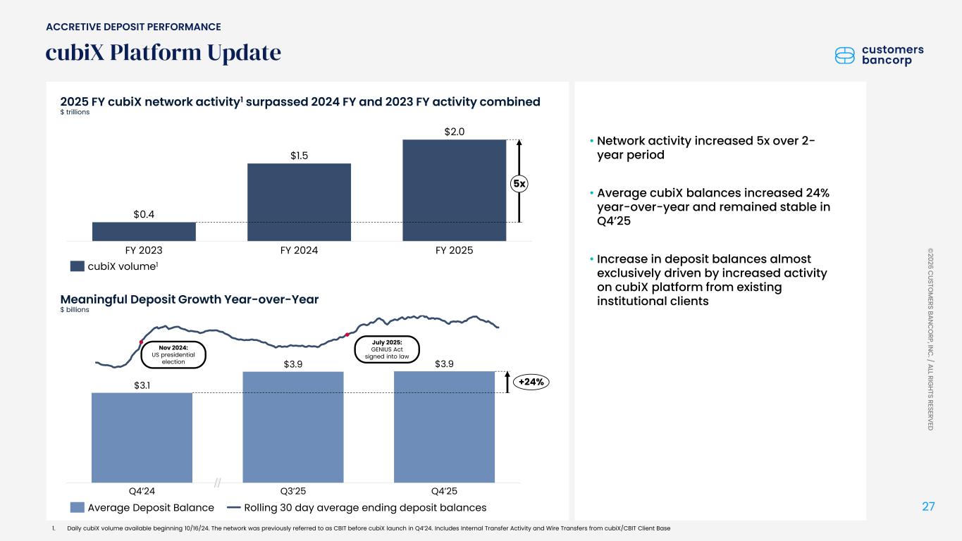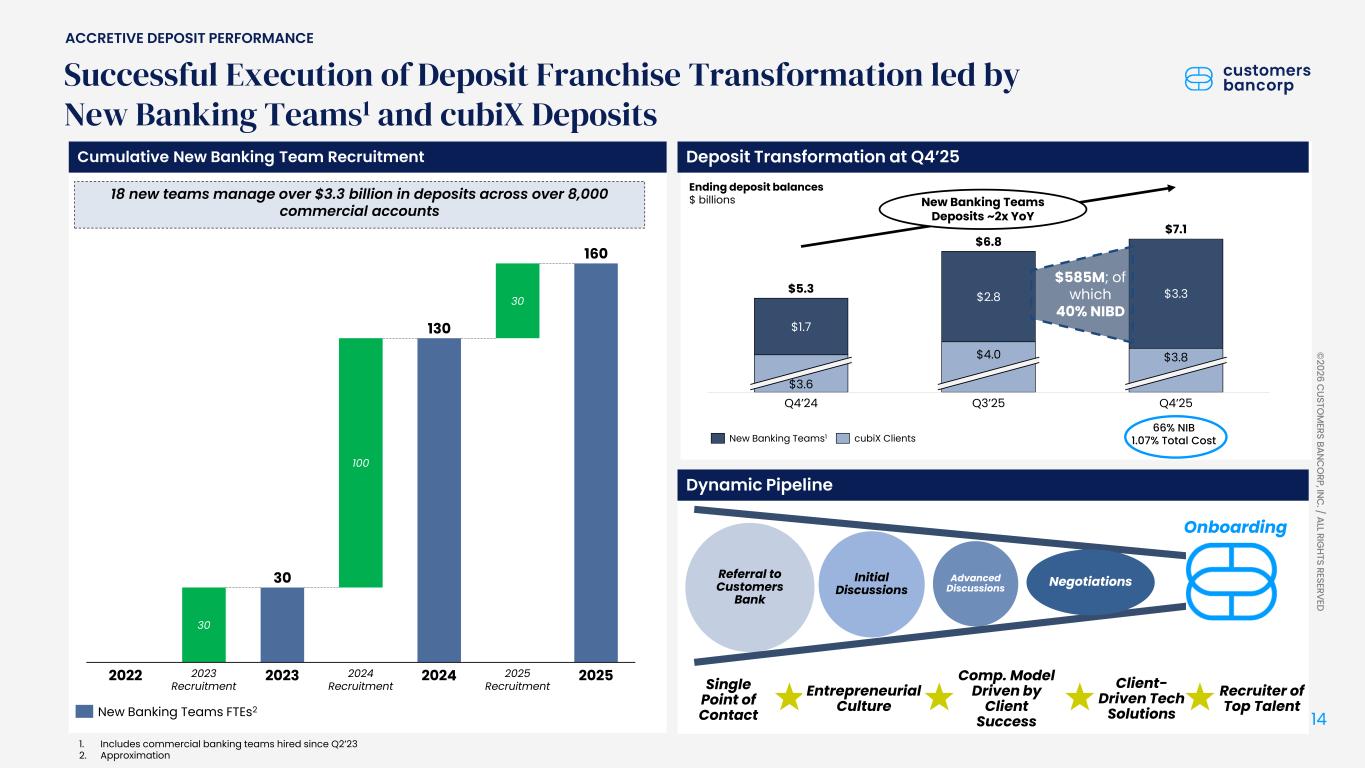 2023年第2四半期以降に採用した新規チームは引き続き活躍し、2025年第4四半期には約6億ドルの預金を増加させました。これら18チームは現在、8,000を超える法人口座で33億ドル超の預金を管理しています。これにより、cubiXプラットフォーム顧客の利益とは別に、2025年には5億ドル超の非利付預金増加を実現しました。