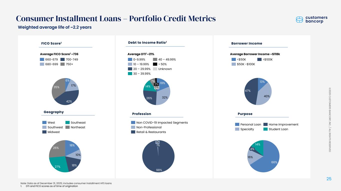 2025年12月31日現在の投資目的の貸付金およびリース債権は168億ドルで、前年比23億ドル(16.0%)増加した。専門貸付は前年比12億ドル(21.4%)増加した。 非自己使用商業用不動産ローンは3億8000万ドル(27.9%)増加。住宅ローンは2億6000万ドル(18.0%)増加。集合住宅ローンは2億3800万ドル(10.6%)増加。消費者割賦ローンは1億6600万ドル(23.3%)増加(2025年第1四半期における売却目的保有ローンからの振替を含む)。