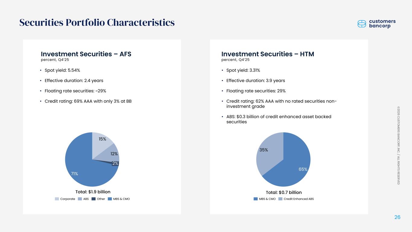2025年12月31日現在、満期保有目的(「HTM」)債券ポートフォリオは総資産のわずか2.9%を占め、スポット利回りは3.31%、実効デュレーションは約3.9年であった。 さらに、2025年12月31日時点で、満期保有目的債券の約62%はAAA格付けであり、0.3億ドルは信用補完された資産担保証券であり、現時点で信用損失の見込みはない。