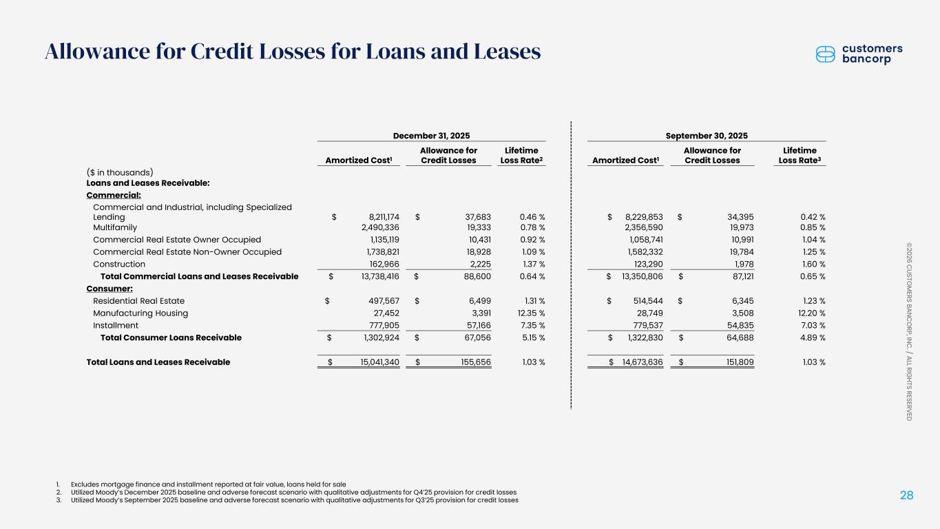 投資目的の貸付金およびリース債権は、2025年12月31日時点で168億ドルとなり、2025年9月30日時点から4億8400万ドル(3.0%)増加した。非所有者占有商業用不動産貸付金は、四半期比で1億5600万ドル(9.9%)増加し、17億ドルとなった。 多世帯向け貸付は1億3400万ドル(5.7%)増加し、25億ドルとなった。住宅ローン金融貸付は1億2300万ドル(7.8%)増加し、17億ドルとなった。所有者居住用商業用不動産貸付は7600万ドル(7.2%)増加し、11億ドルとなった。