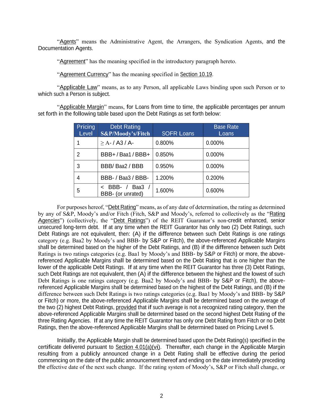 2 “Agents” means the Administrative Agent, the Arrangers, the Syndication Agents, and the Documentation Agents. “Agreement” has the meaning specified in the introductory paragraph hereto. “Agreement Currency” has the meaning specified in Section 10.19. “Applicable Law” means, as to any Person, all applicable Laws binding upon such Person or to which such a Person is subject. “Applicable Margin” means, for Loans from time to time, the applicable percentages per annum set forth in the following table based upon the Debt Ratings as set forth below: Pricing Level Debt Rating S&P/Moody’s/Fitch SOFR Loans Base Rate Loans 1 ≥ A- / A3 / A- 0.800% 0.000% 2 BBB+ / Baa1 / BBB+ 0.850% 0.000% 3 BBB/ Baa2 / BBB 0.950% 0.000% 4 BBB- / Baa3 / BBB- 1.200% 0.200% 5 < BBB- / Baa3 / BBB- (or unrated) 1.600% 0.600% For purposes hereof, “Debt Rating” means, as of any date of determination, the rating as determined by any of S&P, Moody’s and/or Fitch (Fitch, S&P and Moody’s, referred to collectively as the “Rating Agencies”) (collectively, the “Debt Ratings”) of the REIT Guarantor’s non-credit enhanced, senior unsecured long-term debt. If at any time when the REIT Guarantor has only two (2) Debt Ratings, such Debt Ratings are not equivalent, then: (A) if the difference between such Debt Ratings is one ratings category (e.g. Baa2 by Moody’s and BBB- by S&P or Fitch), the above-referenced Applicable Margins shall be determined based on the higher of the Debt Ratings, and (B) if the difference between such Debt Ratings is two ratings categories (e.g. Baa1 by Moody’s and BBB- by S&P or Fitch) or more, the above- referenced Applicable Margins shall be determined based on the Debt Rating that is one higher than the lower of the applicable Debt Ratings. If at any time when the REIT Guarantor has three (3) Debt Ratings, such Debt Ratings are not equivalent, then (A) if the difference between the highest and the lowest of such Debt Ratings is one ratings category (e.g. Baa2 by Moody’s and BBB- by S&P or Fitch), the above- referenced Applicable Margins shall be determined based on the highest of the Debt Ratings, and (B) if the difference between such Debt Ratings is two ratings categories (e.g. Baa1 by Moody’s and BBB- by S&P or Fitch) or more, the above-referenced Applicable Margins shall be determined based on the average of the two (2) highest Debt Ratings, provided that if such average is not a recognized rating category, then the above-referenced Applicable Margins shall be determined based on the second highest Debt Rating of the three Rating Agencies. If at any time the REIT Guarantor has only one Debt Rating from Fitch or no Debt Ratings, then the above-referenced Applicable Margins shall be determined based on Pricing Level 5. Initially, the Applicable Margin shall be determined based upon the Debt Rating(s) specified in the certificate delivered pursuant to Section 4.01(a)(vi). Thereafter, each change in the Applicable Margin resulting from a publicly announced change in a Debt Rating shall be effective during the period commencing on the date of the public announcement thereof and ending on the date immediately preceding the effective date of the next such change. If the rating system of Moody’s, S&P or Fitch shall change, or