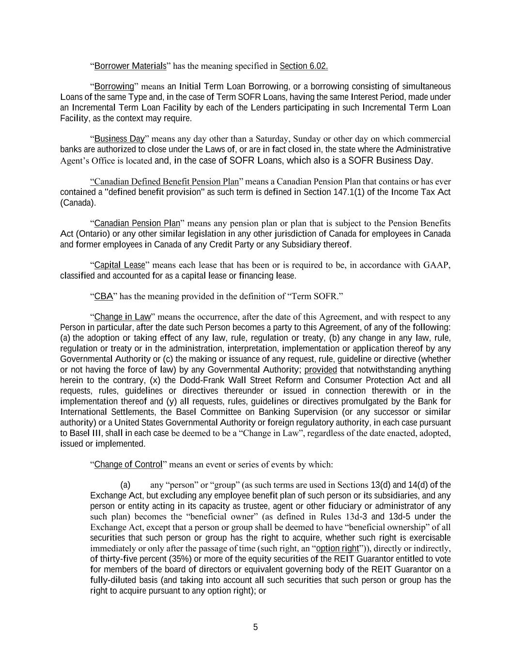 5 “Borrower Materials” has the meaning specified in Section 6.02. “Borrowing” means an Initial Term Loan Borrowing, or a borrowing consisting of simultaneous Loans of the same Type and, in the case of Term SOFR Loans, having the same Interest Period, made under an Incremental Term Loan Facility by each of the Lenders participating in such Incremental Term Loan Facility, as the context may require. “Business Day” means any day other than a Saturday, Sunday or other day on which commercial banks are authorized to close under the Laws of, or are in fact closed in, the state where the Administrative Agent’s Office is located and, in the case of SOFR Loans, which also is a SOFR Business Day. “Canadian Defined Benefit Pension Plan” means a Canadian Pension Plan that contains or has ever contained a "defined benefit provision" as such term is defined in Section 147.1(1) of the Income Tax Act (Canada). “Canadian Pension Plan” means any pension plan or plan that is subject to the Pension Benefits Act (Ontario) or any other similar legislation in any other jurisdiction of Canada for employees in Canada and former employees in Canada of any Credit Party or any Subsidiary thereof. “Capital Lease” means each lease that has been or is required to be, in accordance with GAAP, classified and accounted for as a capital lease or financing lease. “CBA” has the meaning provided in the definition of “Term SOFR.” “Change in Law” means the occurrence, after the date of this Agreement, and with respect to any Person in particular, after the date such Person becomes a party to this Agreement, of any of the following: (a) the adoption or taking effect of any law, rule, regulation or treaty, (b) any change in any law, rule, regulation or treaty or in the administration, interpretation, implementation or application thereof by any Governmental Authority or (c) the making or issuance of any request, rule, guideline or directive (whether or not having the force of law) by any Governmental Authority; provided that notwithstanding anything herein to the contrary, (x) the Dodd-Frank Wall Street Reform and Consumer Protection Act and all requests, rules, guidelines or directives thereunder or issued in connection therewith or in the implementation thereof and (y) all requests, rules, guidelines or directives promulgated by the Bank for International Settlements, the Basel Committee on Banking Supervision (or any successor or similar authority) or a United States Governmental Authority or foreign regulatory authority, in each case pursuant to Basel III, shall in each case be deemed to be a “Change in Law”, regardless of the date enacted, adopted, issued or implemented. “Change of Control” means an event or series of events by which: (a) any “person” or “group” (as such terms are used in Sections 13(d) and 14(d) of the Exchange Act, but excluding any employee benefit plan of such person or its subsidiaries, and any person or entity acting in its capacity as trustee, agent or other fiduciary or administrator of any such plan) becomes the “beneficial owner” (as defined in Rules 13d-3 and 13d-5 under the Exchange Act, except that a person or group shall be deemed to have “beneficial ownership” of all securities that such person or group has the right to acquire, whether such right is exercisable immediately or only after the passage of time (such right, an “option right”)), directly or indirectly, of thirty-five percent (35%) or more of the equity securities of the REIT Guarantor entitled to vote for members of the board of directors or equivalent governing body of the REIT Guarantor on a fully-diluted basis (and taking into account all such securities that such person or group has the right to acquire pursuant to any option right); or