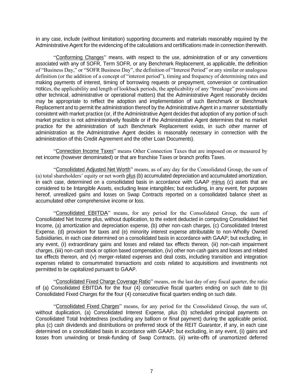 7 in any case, include (without limitation) supporting documents and materials reasonably required by the Administrative Agent for the evidencing of the calculations and certifications made in connection therewith. “Conforming Changes” means, with respect to the use, administration of or any conventions associated with any of SOFR, Term SOFR, or any Benchmark Replacement, as applicable, the definition of “Business Day,” or “SOFR Business Day”, the definition of “Interest Period” or any similar or analogous definition (or the addition of a concept of “interest period”), timing and frequency of determining rates and making payments of interest, timing of borrowing requests or prepayment, conversion or continuation notices, the applicability and length of lookback periods, the applicability of any “breakage” provisions and other technical, administrative or operational matters) that the Administrative Agent reasonably decides may be appropriate to reflect the adoption and implementation of such Benchmark or Benchmark Replacement and to permit the administration thereof by the Administrative Agent in a manner substantially consistent with market practice (or, if the Administrative Agent decides that adoption of any portion of such market practice is not administratively feasible or if the Administrative Agent determines that no market practice for the administration of such Benchmark Replacement exists, in such other manner of administration as the Administrative Agent decides is reasonably necessary in connection with the administration of this Credit Agreement and the other Loan Documents). “Connection Income Taxes” means Other Connection Taxes that are imposed on or measured by net income (however denominated) or that are franchise Taxes or branch profits Taxes. “Consolidated Adjusted Net Worth” means, as of any day for the Consolidated Group, the sum of (a) total shareholders’ equity or net worth plus (b) accumulated depreciation and accumulated amortization, in each case, determined on a consolidated basis in accordance with GAAP minus (c) assets that are considered to be Intangible Assets, excluding lease intangibles; but excluding, in any event, for purposes hereof, unrealized gains and losses on Swap Contracts reported on a consolidated balance sheet as accumulated other comprehensive income or loss. “Consolidated EBITDA” means, for any period for the Consolidated Group, the sum of Consolidated Net Income plus, without duplication, to the extent deducted in computing Consolidated Net Income, (a) amortization and depreciation expense, (b) other non-cash charges, (c) Consolidated Interest Expense, (d) provision for taxes and (e) minority interest expense attributable to non-Wholly Owned Subsidiaries, in each case determined on a consolidated basis in accordance with GAAP; but excluding, in any event, (i) extraordinary gains and losses and related tax effects thereon, (ii) non-cash impairment charges, (iii) non-cash stock or option based compensation, (iv) other non-cash gains and losses and related tax effects thereon, and (v) merger-related expenses and deal costs, including transition and integration expenses related to consummated transactions and costs related to acquisitions and investments not permitted to be capitalized pursuant to GAAP. “Consolidated Fixed Charge Coverage Ratio” means, on the last day of any fiscal quarter, the ratio of (a) Consolidated EBITDA for the four (4) consecutive fiscal quarters ending on such date to (b) Consolidated Fixed Charges for the four (4) consecutive fiscal quarters ending on such date. “Consolidated Fixed Charges” means, for any period for the Consolidated Group, the sum of, without duplication, (a) Consolidated Interest Expense, plus (b) scheduled principal payments on Consolidated Total Indebtedness (excluding any balloon or final payment) during the applicable period, plus (c) cash dividends and distributions on preferred stock of the REIT Guarantor, if any, in each case determined on a consolidated basis in accordance with GAAP; but excluding, in any event, (i) gains and losses from unwinding or break-funding of Swap Contracts, (ii) write-offs of unamortized deferred